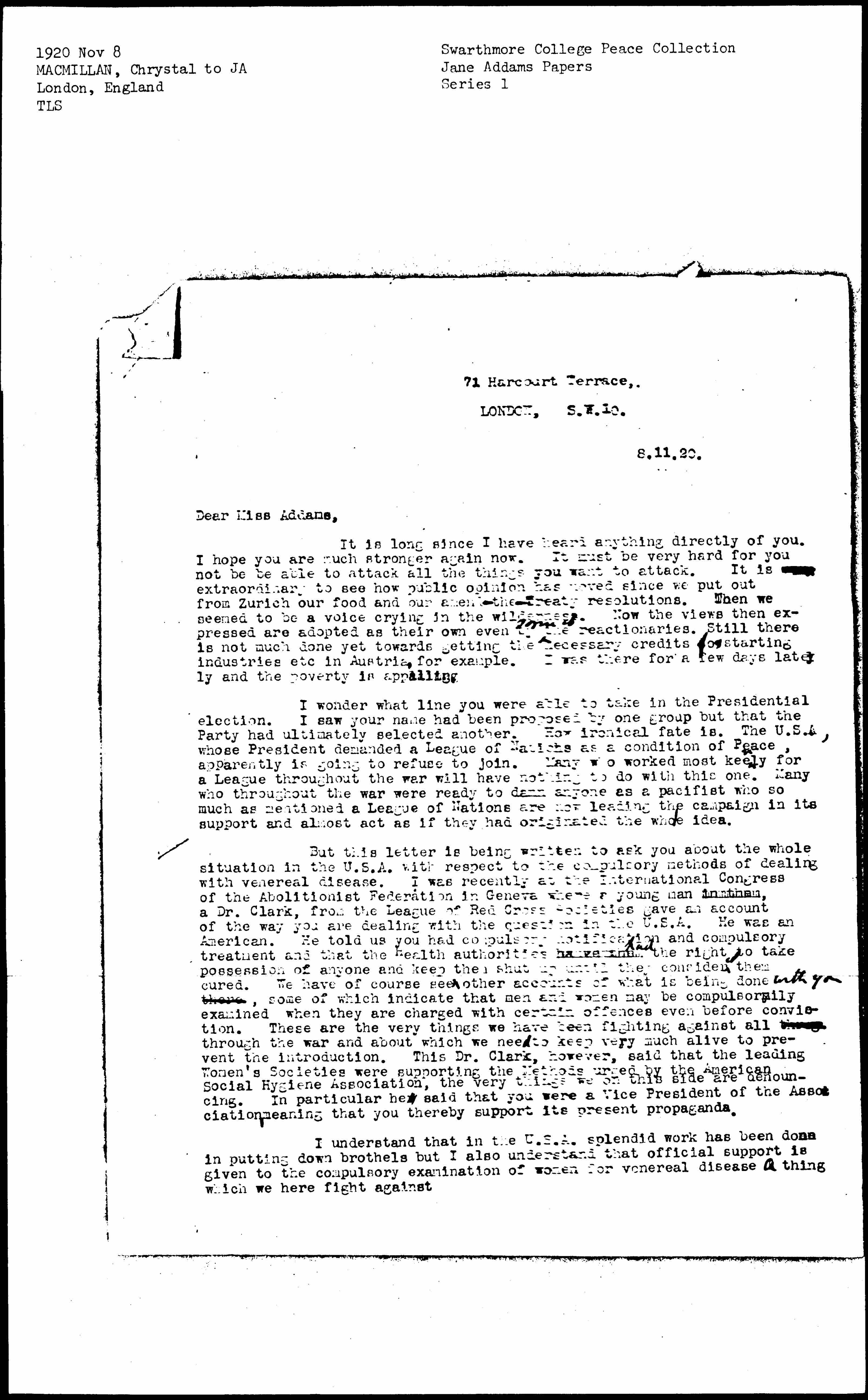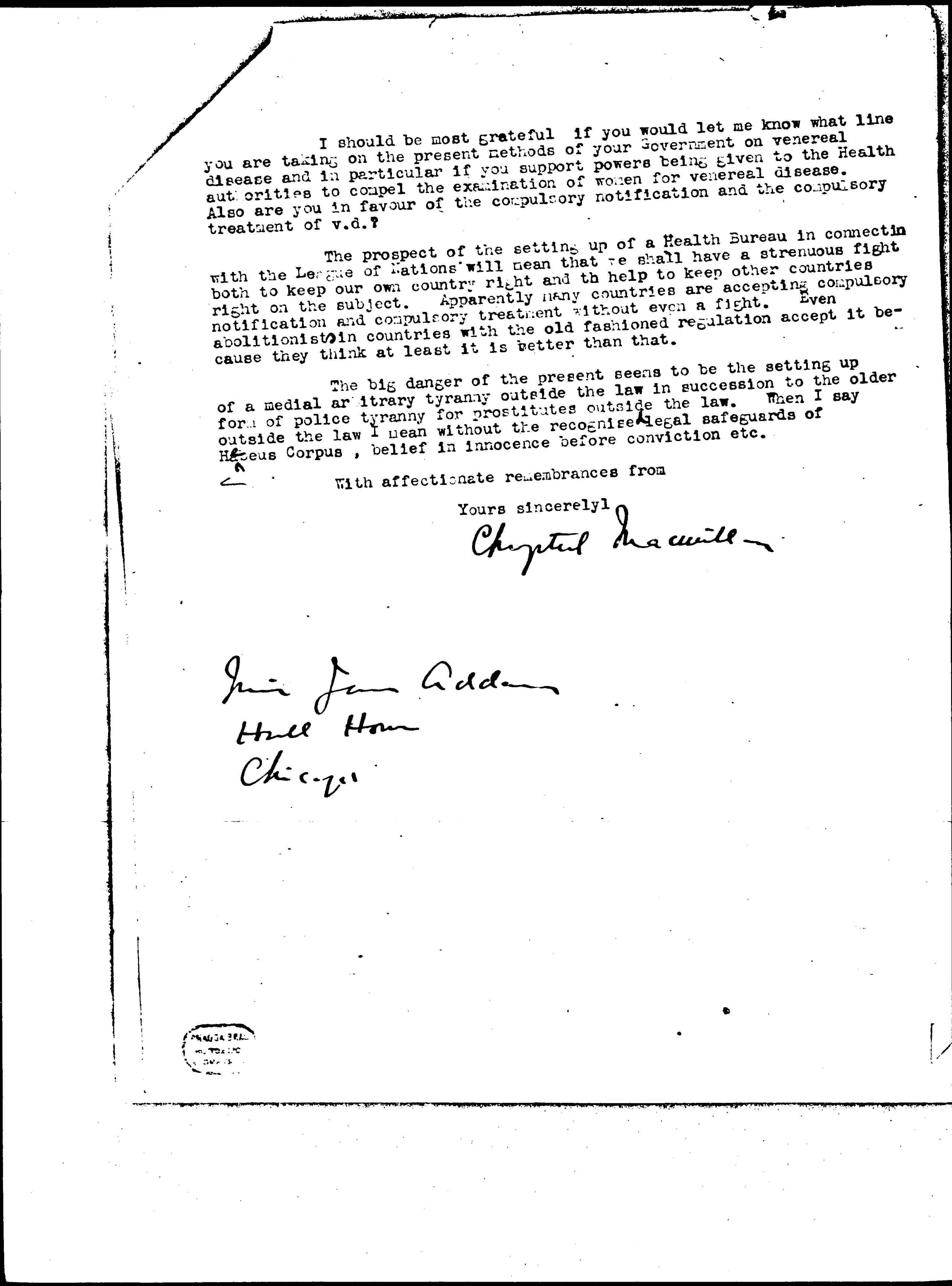 But this letter is being written to ask you about the whole situation in the U.S.A. with respect to the compulsory methods of dealing with venereal disease. I was recently at the International Congress of the Abolitionist Federation in Geneva where a young man [illegible], a Dr. [Clarke], from the League of Red Cross Societies gave an account of the way you are dealing with the question in the U.S.A. He was an American. He told us you had compulsory notification and compulsory treatment and that the Health authorities [illegible] ↑had↓ the right to take possession of anyone and keep them shut up until they [considered] them cured. We have of course seen other accounts of what is being done ↑with you↓ there, some of which indicate that men and women may be compulsorily examined when they are charged with certain offences even before conviction. These are the very things we have been fighting against all [illegible] through the war and about which we need to keep very much alive to prevent the introduction. This Dr. [Clarke], however, said that the leading Women's Societies were supporting the Methods urged by the American Social Hygiene Association, the very things we on this side are denouncing. In particular he said that you were a Vice President of the Association, meaning that you thereby support its present propaganda.
