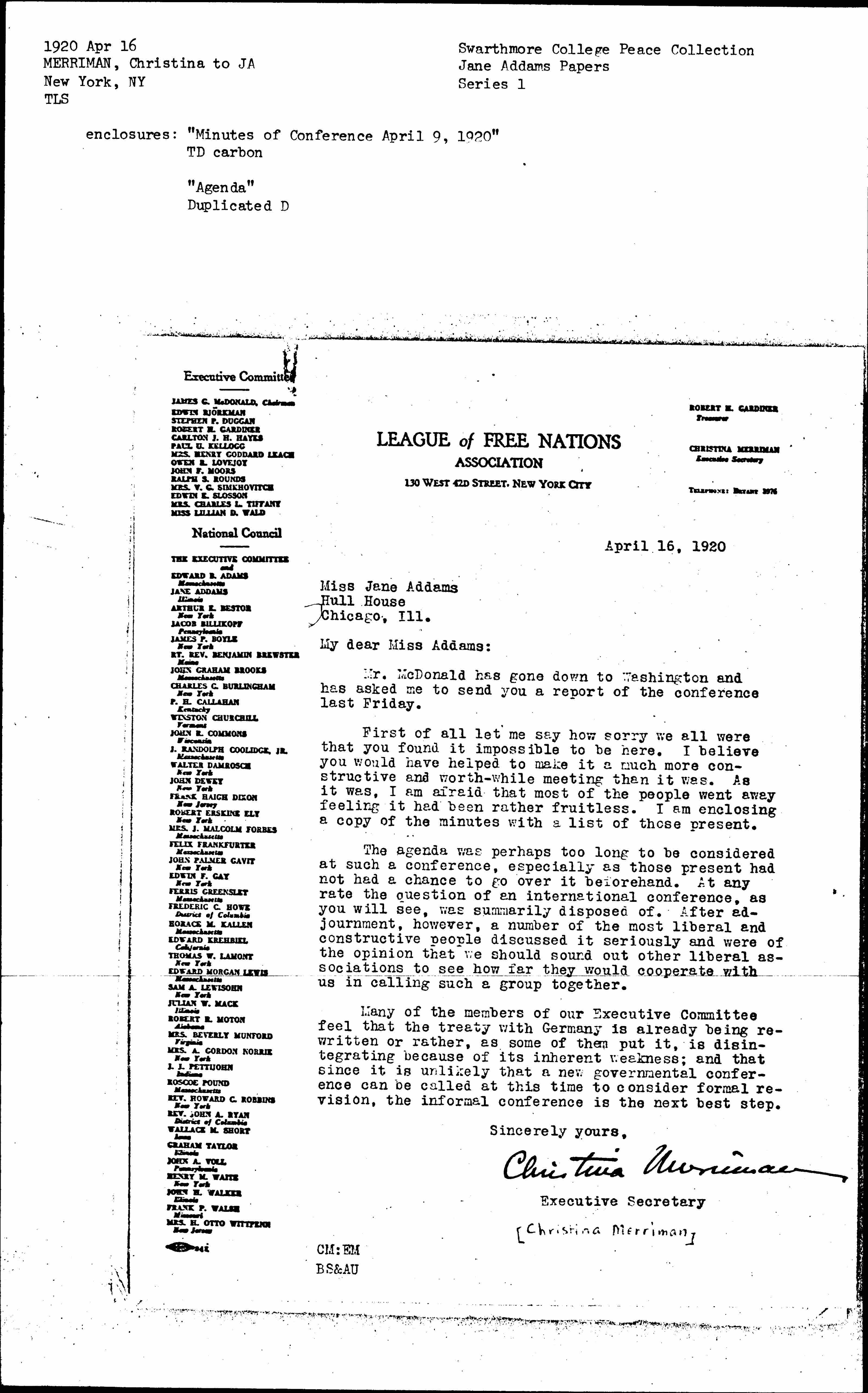 The agenda was perhaps too long to be considered at such a conference, especially as those present had not had a chance to go over it beforehand. At any rate the question of an international conference, as you will see, was summarily disposed of. After adjournment, however, a number of the most liberal and constructive people discussed it seriously and were of the opinion that we should sound out other liberal associations to see how far they would cooperate with us in calling such a group together.
