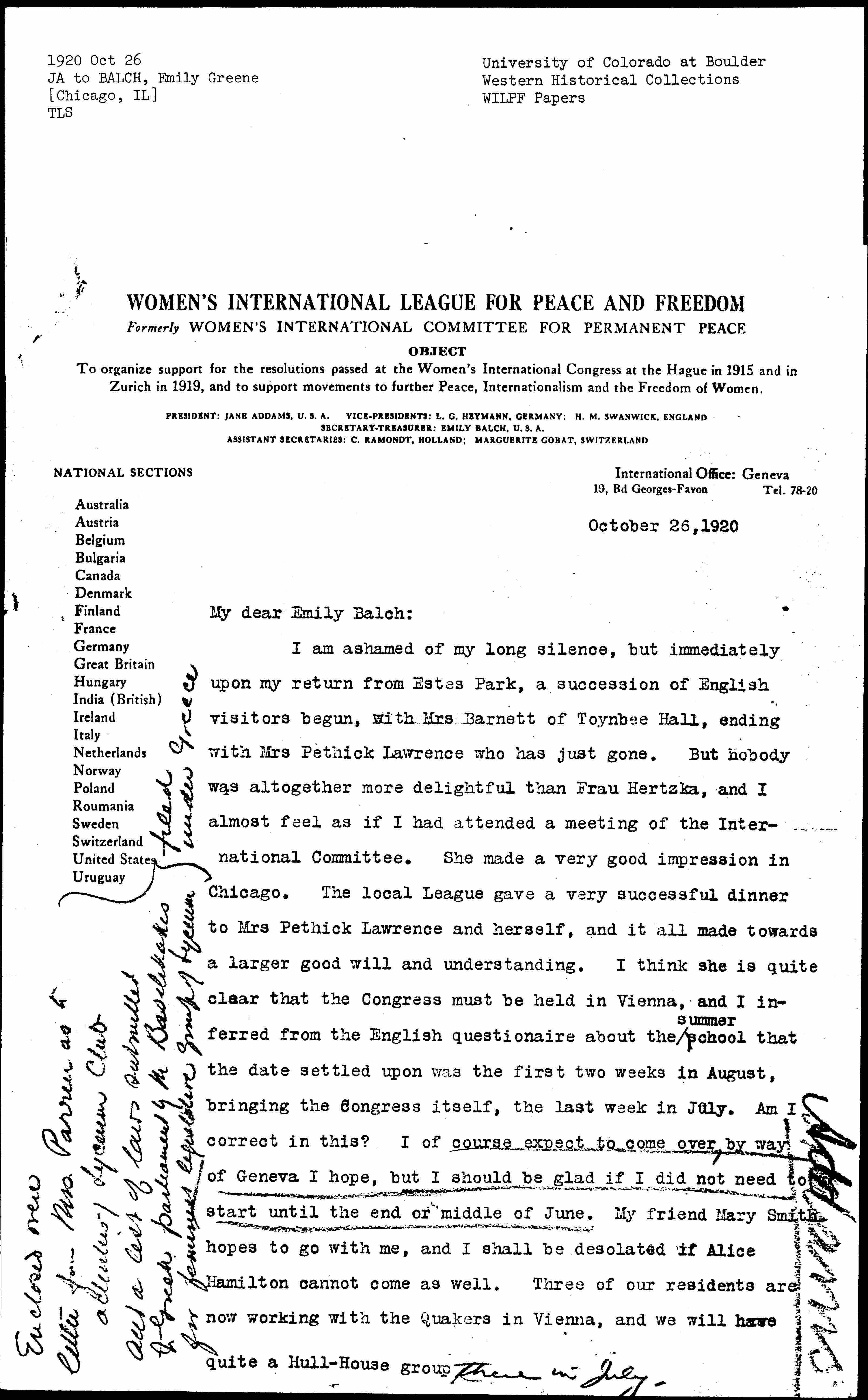 I am ashamed of my long silence, but immediately upon my return from Estes Park, a succession of English visitors begun, with Mrs Barnett of Toynbee Hall, ending with Mrs Pethick Lawrence who has just gone. But nobody was altogether more delightful than Frau Hertzka, and I almost feel as if I had attended a meeting of the International Committee. She made a very good impression in Chicago. The local League gave a very successful dinner to Mrs Pethick Lawrence and herself, and it all made towards a larger good will and understanding. I think she is quite clear that the Congress must be held in Vienna, and I inferred from the English [questionnaire] about the ↑summer↓ school that the date settled upon was the first two weeks in August, bringing the Congress itself, the last week in July. Am I correct in this? I of course expect to come over, by way of Geneva I hope, but I should be glad if I did not need to start until the end or middle of June. My friend Mary Smith hopes to go with me, and I shall be desolated if Alice Hamilton cannot come as well. Three of our residents are now working with the Quakers in Vienna, and we will have quite a Hull-House group ↑there in July.↓ [page 2]