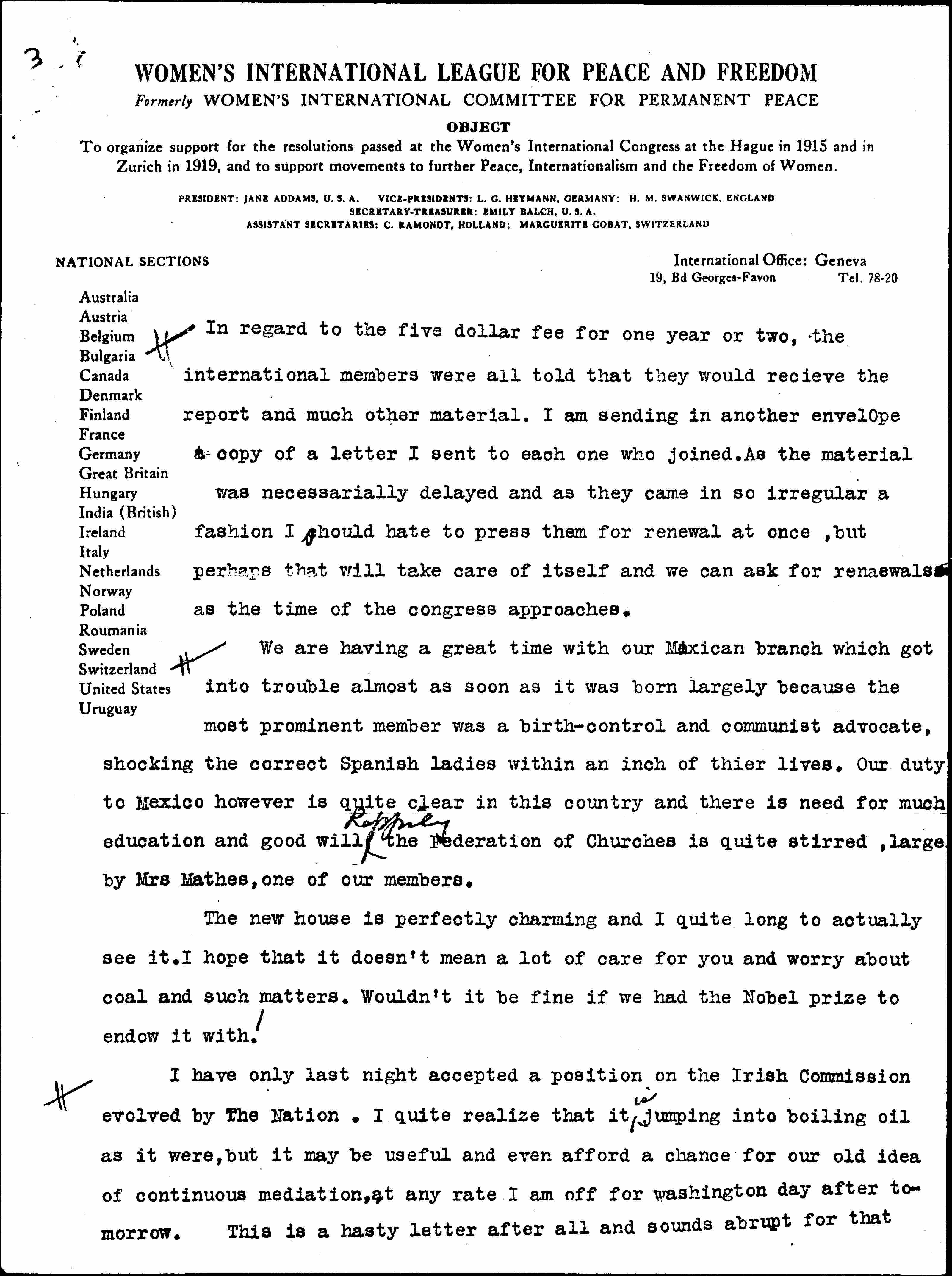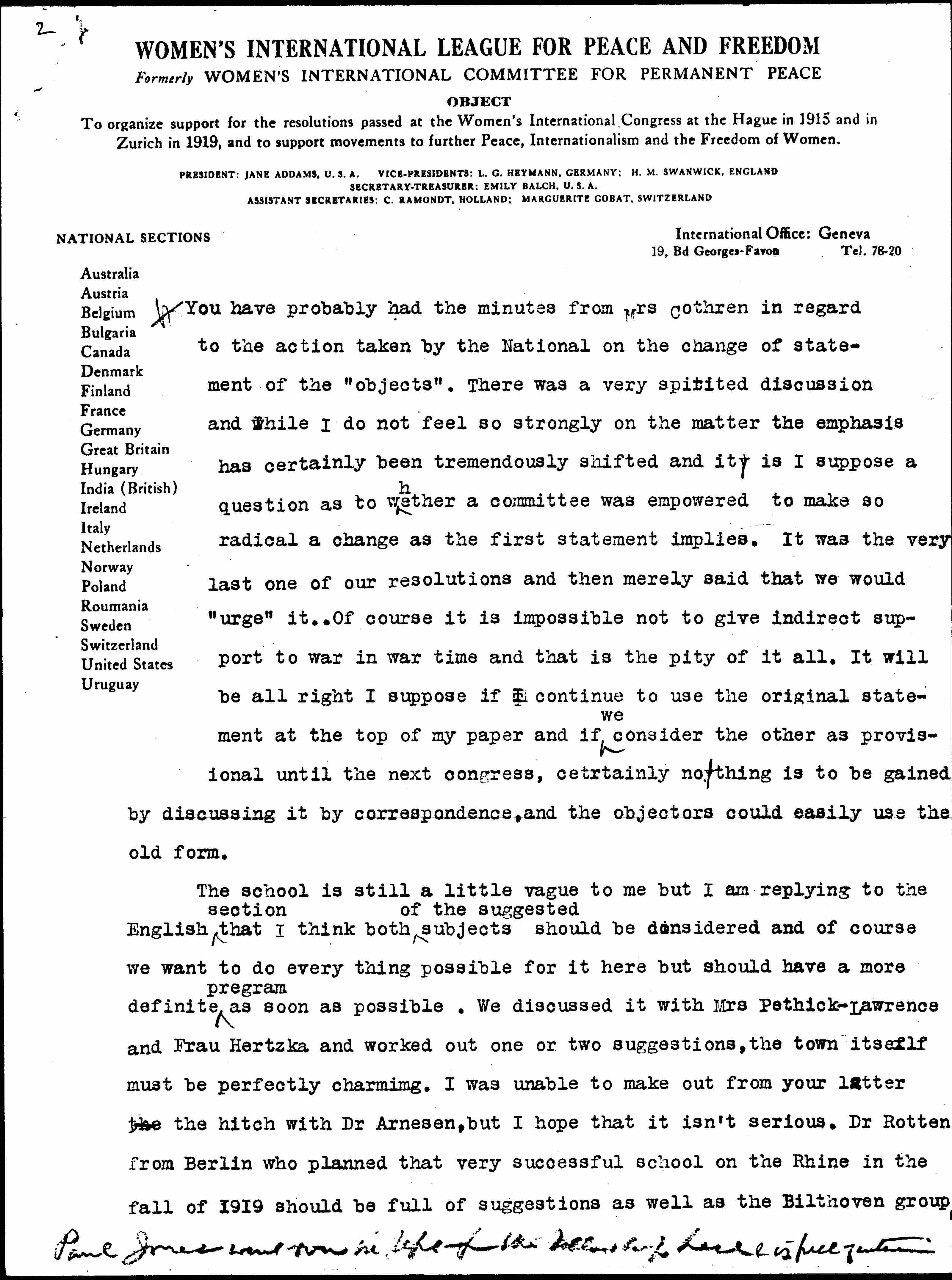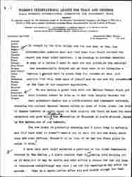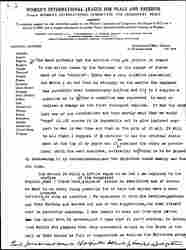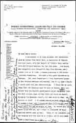 You have probably had the minutes from Mrs Cothren in regard to the action taken by the National on the change of statement of the "objects". There was a very spirited discussion and while I do not feel so strongly on the matter the emphasis has certainly been tremendously shifted and it is I suppose a question as to whether a committee was empowered to make so radical a change as the first statement implies. It was the very last one of our resolutions and then merely said that we would "urge" it … Of course it is impossible not to give indirect support to war in war time and that is the pity of it all. It will be all right I suppose if I continue to use the original statement at the top of my paper and if ↑we↓ consider the other as provisional until the next congress, certainly nothing is to be gained by discussing it by correspondence, and the objectors could easily use the old form.