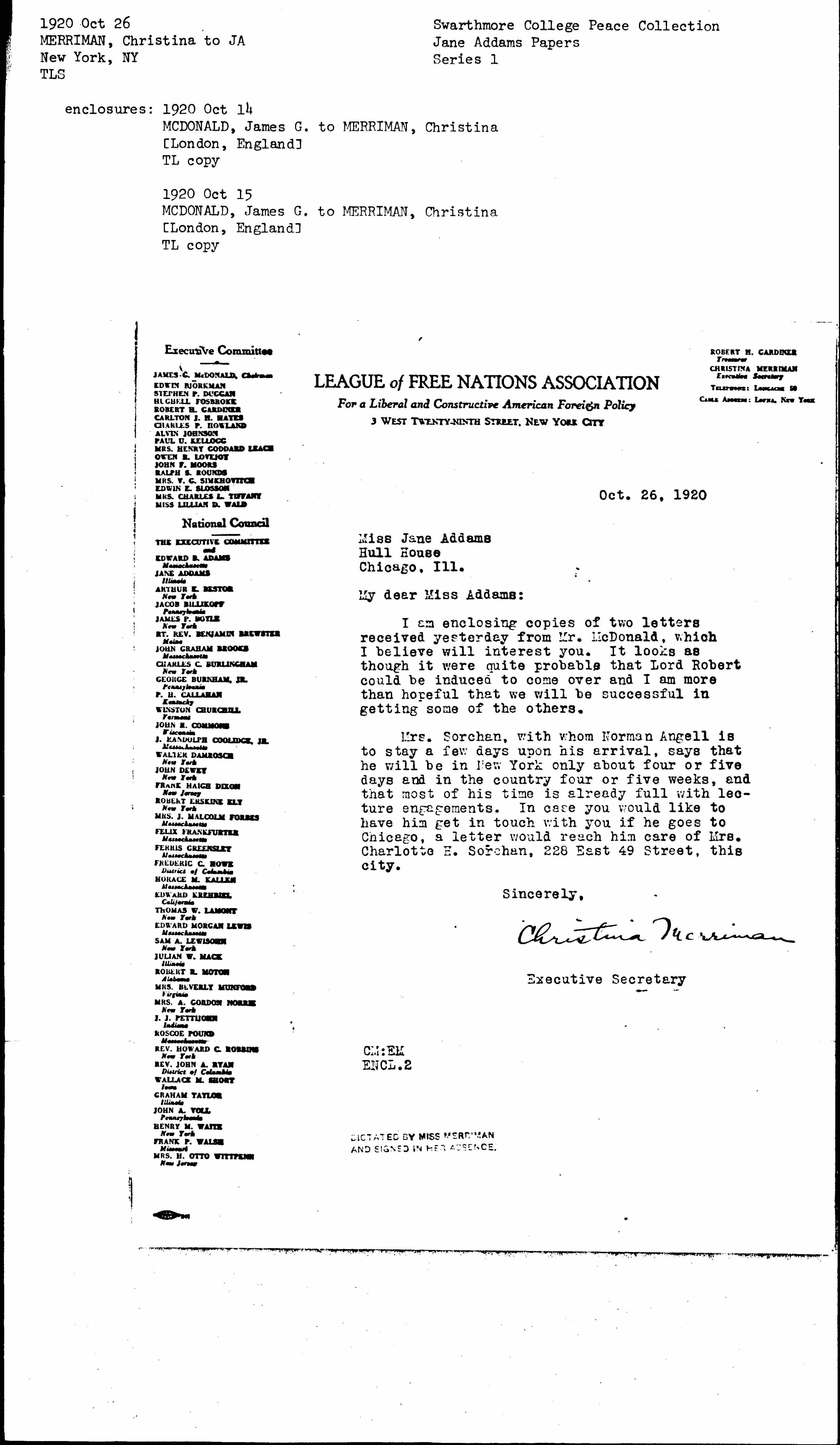 Mrs. Sorchan, with whom Norman Angell is to stay a few days upon his arrival, says that he will be in New York only about four or five days and in the country four or five weeks, and that most of his time is already full with lecture engagmments. In case you would like to have him get in touch with you if he goes to Chicago, a letter would reach him care of Mrs. Charlotte H. Sorchan, 228 East 49 Street, this city.