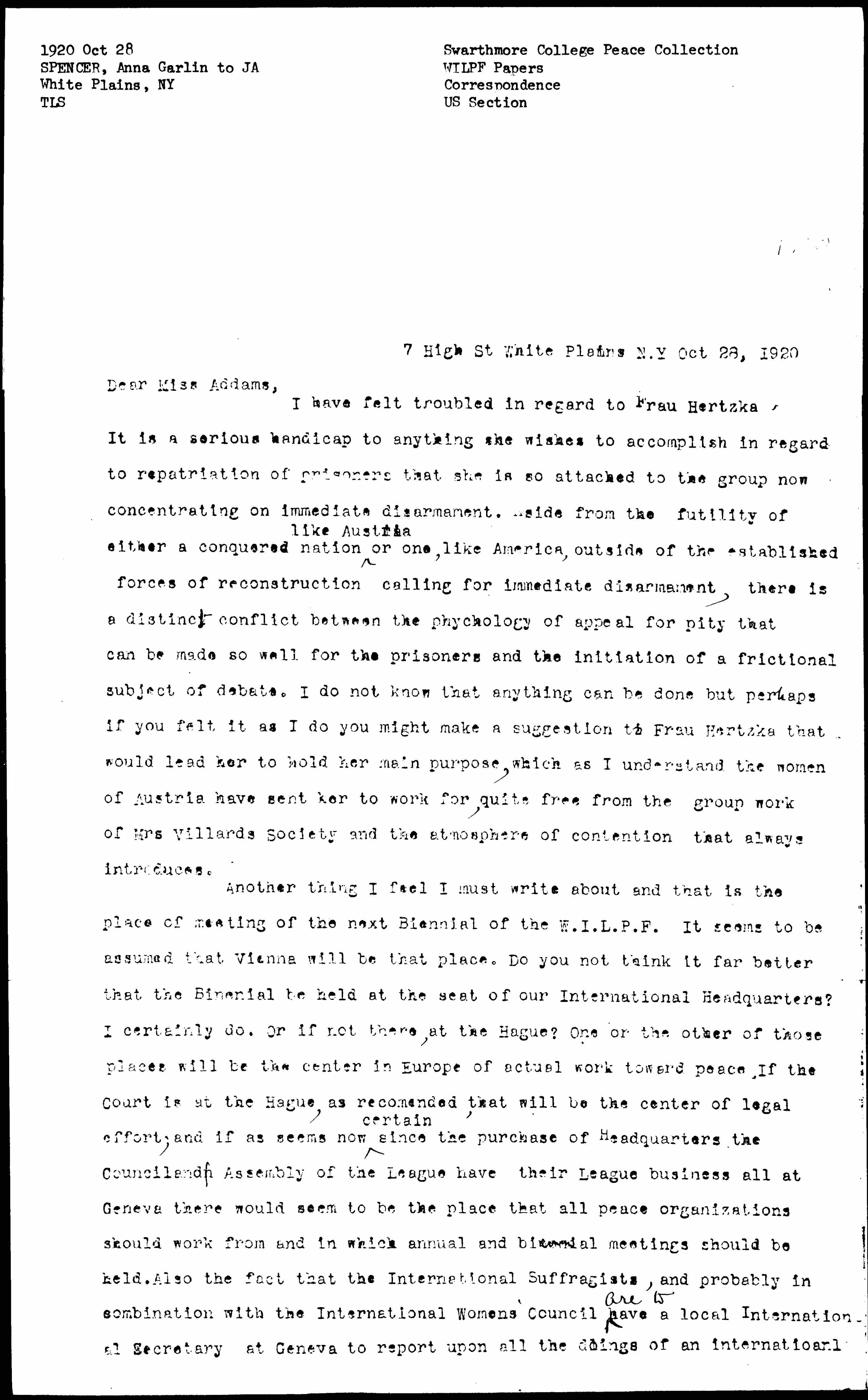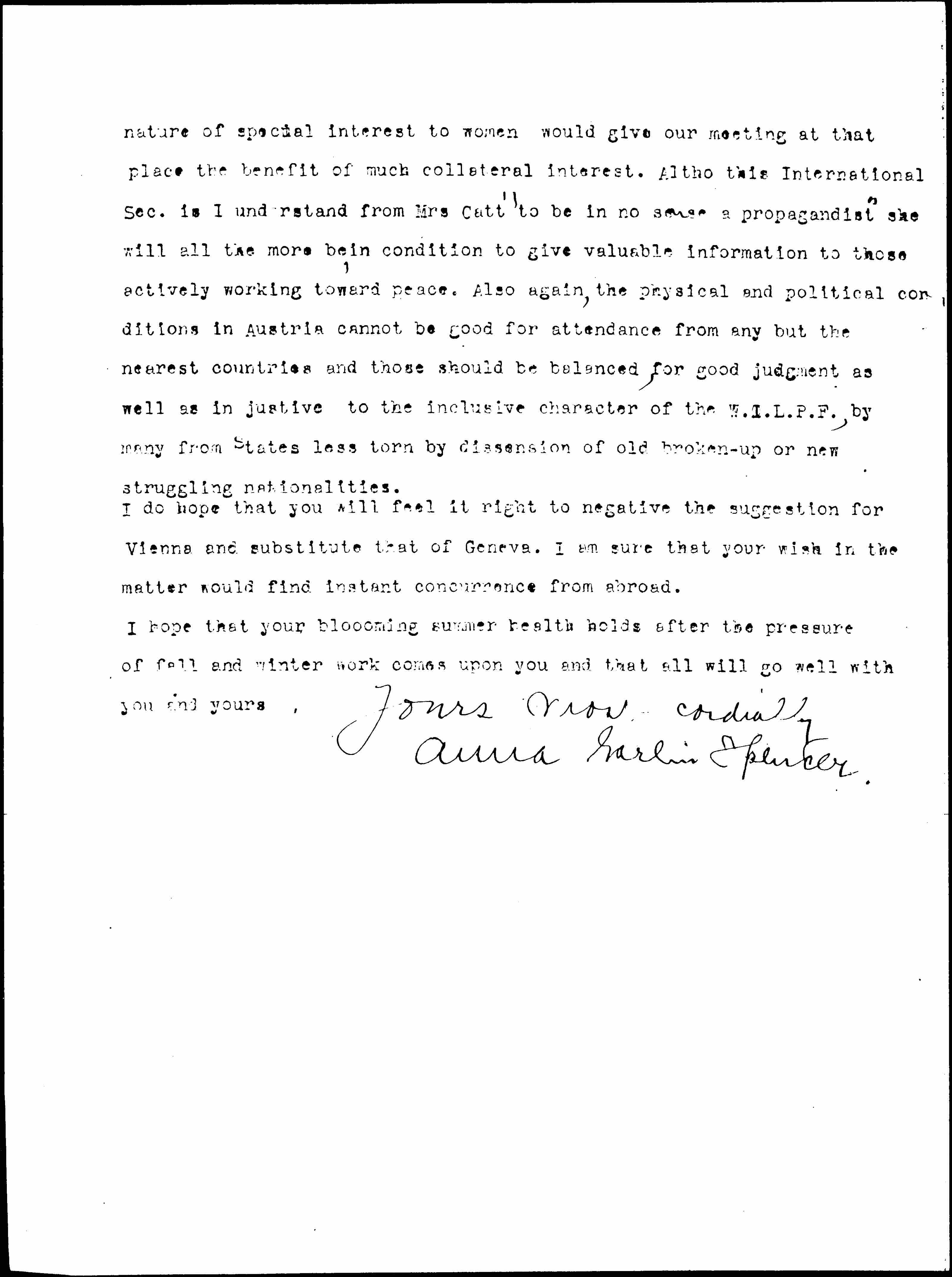 Another thing I feel I must write about and that is the place of meeting of the next Biennial of the W.I.L.P.F. It seems to be assumed that Vienna will be that place. Do you not think it far better that the Biennial be held at the seat of our International Headquarters? I certainly do. Or if not there, at The Hague? One of the other of those places will be the center in Europe of actual work toward peace, If the Court is at The Hague, as recommended, that will be the center of legal effort; and if as seems now ↑certain↓ since the purchase of Headquarters the Council and Assembly of the League have their League business all at Geneva there would seem to be the place that all peace organizations should work from and in which annual and biennial meetings should be held. Also the fact that the International Suffragists, and probably in combination with the International Womens' Council ↑are to↓ have a local International Secretary at Geneva to report upon all the doings of an international [page 2] nature of special interest to women would give our meeting at that place the benefit of much collateral interest. [Although] this International Sec. is I understand from Mrs. Catt to be in no sense a propagandist she will all the more be in condition to give valuable information to those actively working toward peace. Also again, the physical and political conditions in Austria cannot be good for attendance from any but the nearest countries and those should be balanced, for good judgment as well as [injustice] to the inclusive character of the W.I.L.P.F., by many from States less torn by dissension of old broken-up or new struggling nationalities.