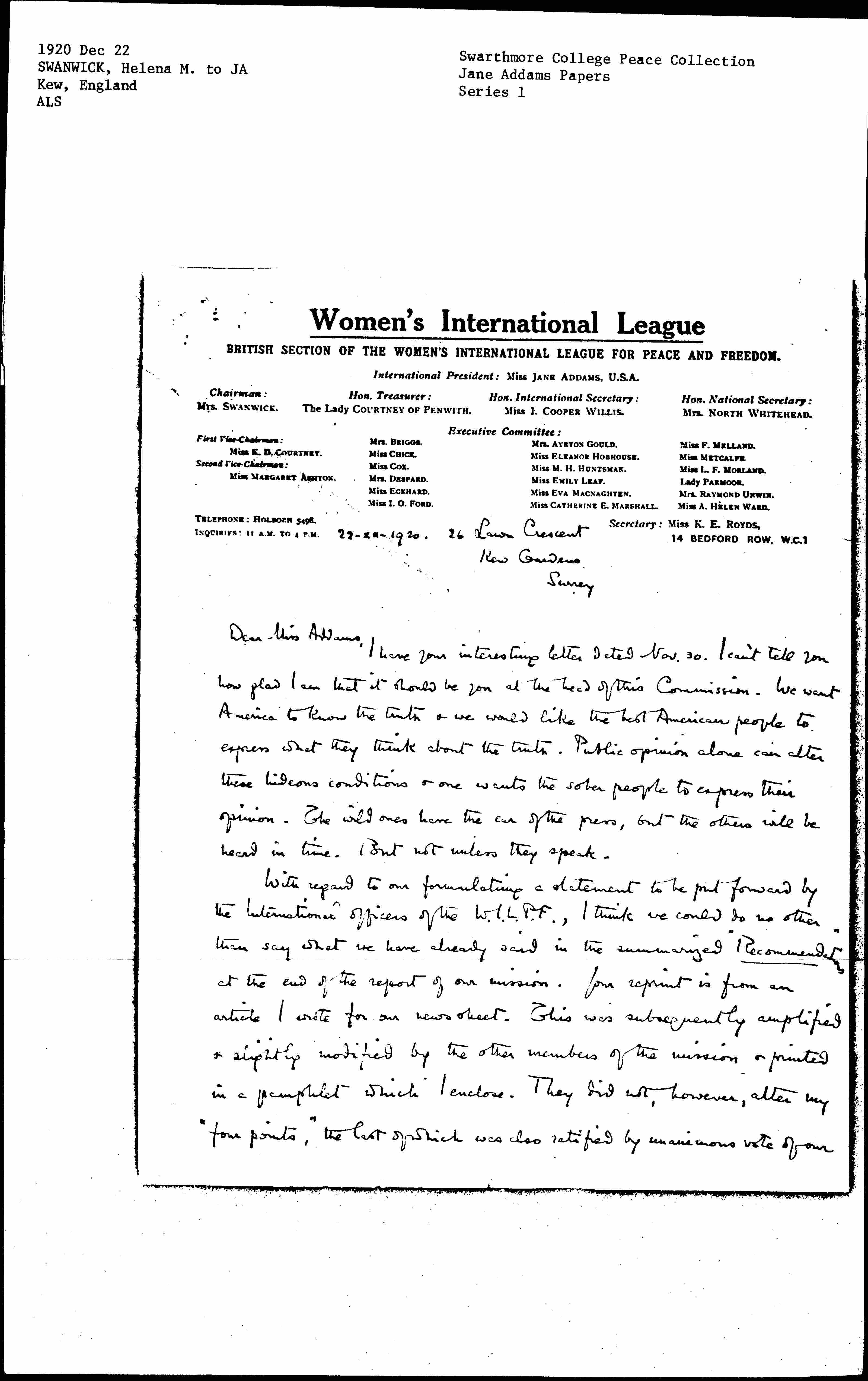 With regard to our formulating a statement to be put forward by the international officers of the W.I.L.P.F., I think we could do no other than say what we have already said in the summarized "Recommendations" at the end of the report of our mission. Your reprint is from an article I wrote for our news sheet. This was subsequently amplified & slightly modified by the other members of the mission & printed in a pamphlet which I enclose. They did not, however, alter my "four points," the last of which was also ratified by unanimous vote of our [page 2] Council meeting. So that it actually represents the considered opinion of the whole British Section. We sent it to Ireland & I am glad to say it was warmly welcomed by the Irishwomen's International League, as completely satisfying them. I enclose also ↑the last number of the News Sheet which "subs in" what we have to fear in the future.↓