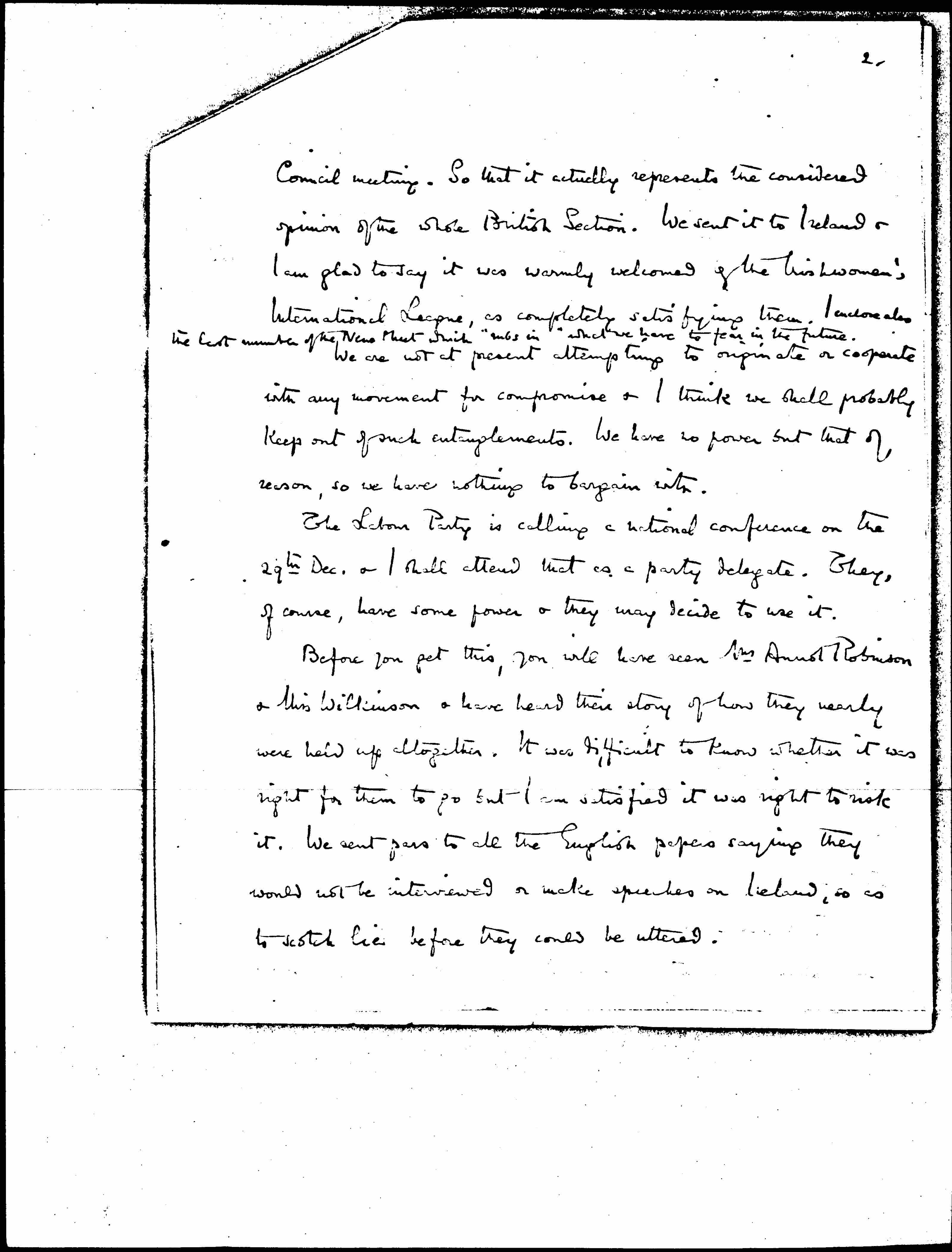 Before you get this, you will have seen Mrs Annot Robinson & Miss Wilkinson & have heard their story of how they nearly were held up altogether. It was difficult to know whether it was right for them to go but I am satisfied it was right to risk it. We sent [pars?] to all the English papers saying they would not be interviewed or make speeches on Ireland, so as to scotch lies before they could be uttered. [page 3]