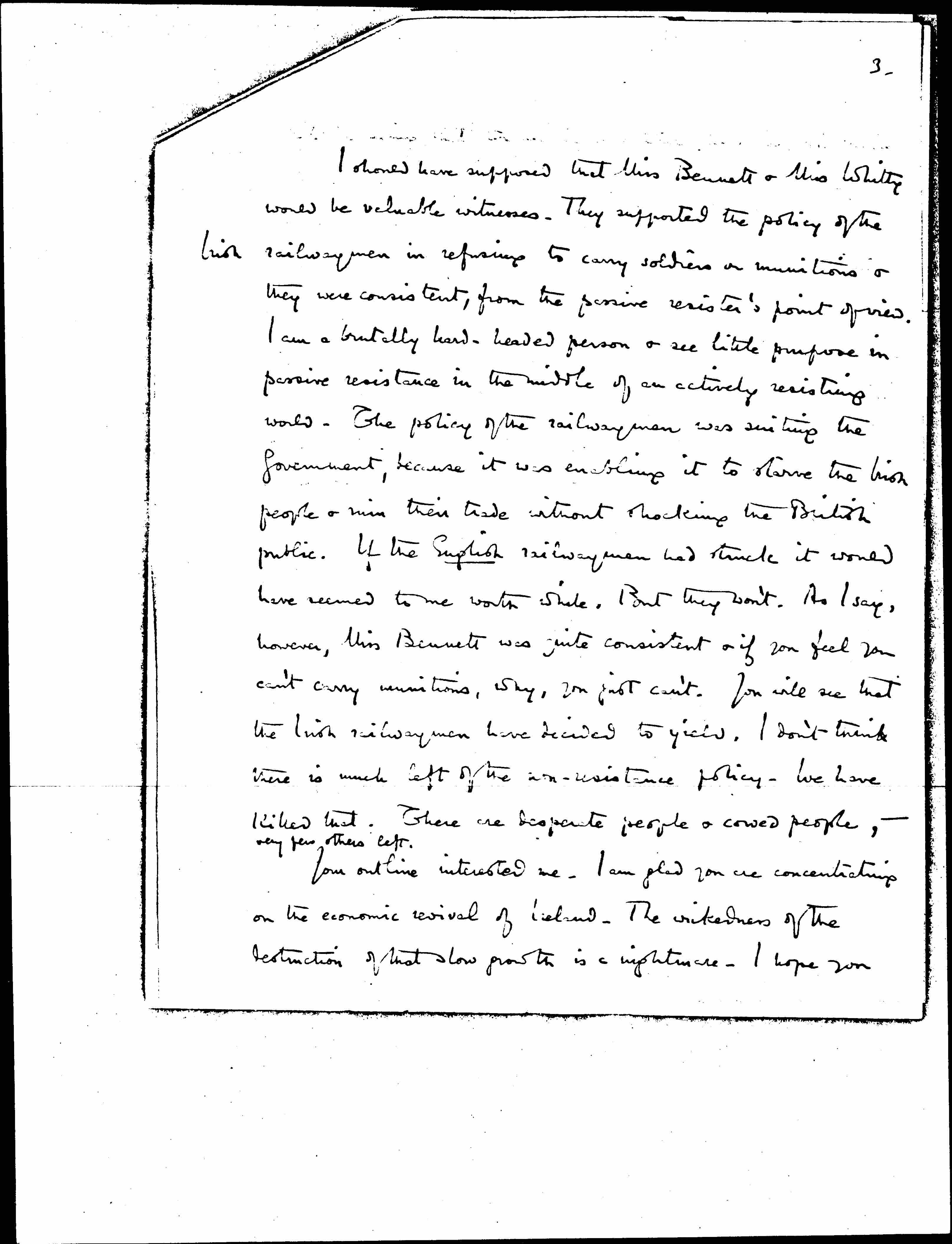 I should have supposed that Miss Bennett & Miss Whittey would be valuable witnesses. They supported the policy of the ↑Irish↓ railwaymen in refusing to carry soldiers or munitions & they were consistent, from the passive resister's point of view. I am a brutally hard-headed person & see little purpose in passive resistance in the middle of an actively resisting world. The policy of the railwaymen was suiting the government, because it was enabling it to starve the Irish people & win their trade without shocking the British public. If the English railwaymen had struck it would have seemed to me worth while. But they won't. As I say, however, Miss Bennett was quite consistent & if you feel you can't carry munitions, why, you just can't. You will see that the Irish railwaymen have decided to yield. I don't think there is much left of the non-resistance policy -- we have killed that. There are desperate people & cowed people, -- ↑very few others left.↓