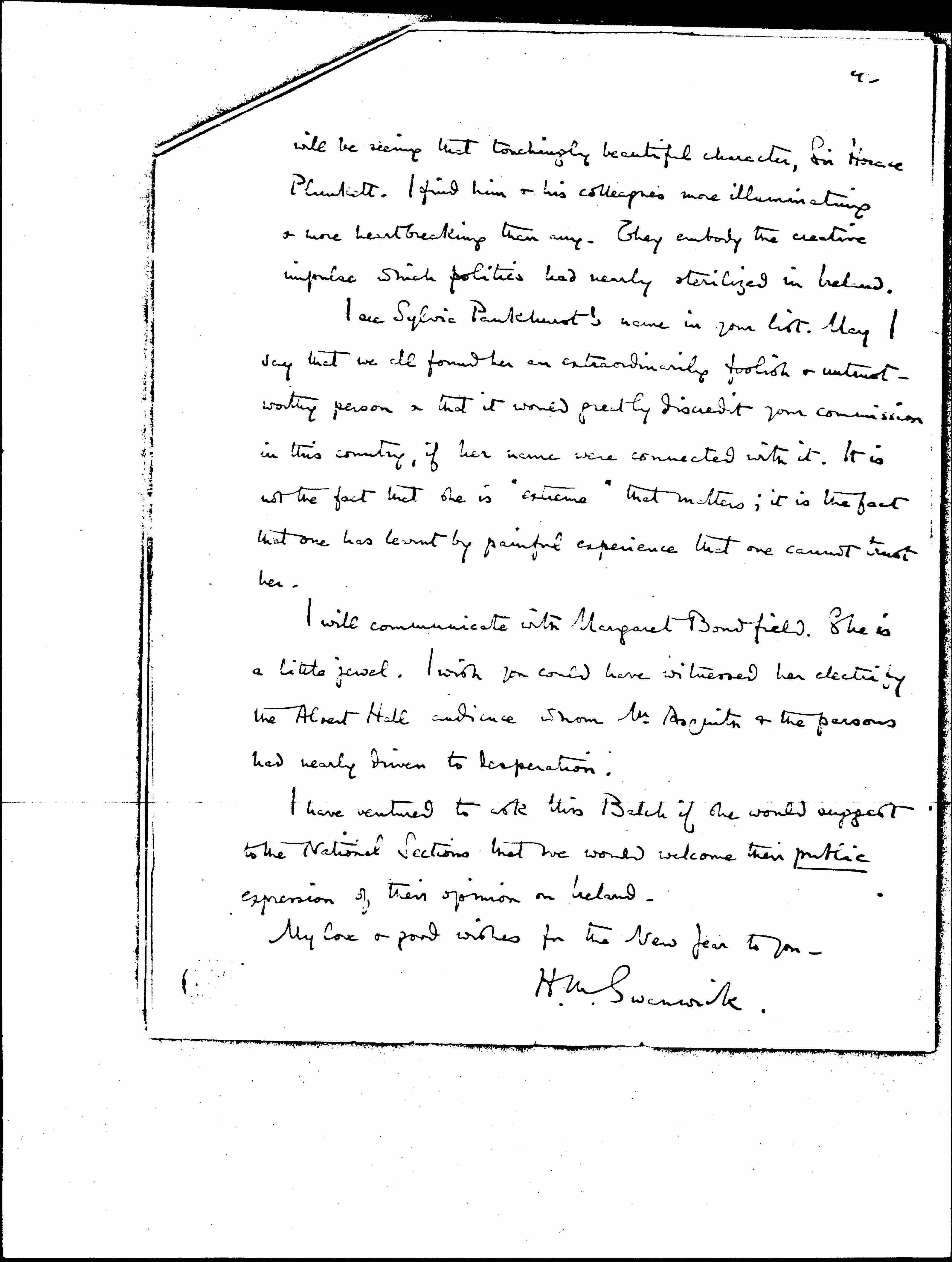 I see Sylvia Pankhurst's name in your list. May I say that we all found her an extraordinarily foolish & untrustworthy person & that it would greatly discredit your commission in this country, if her name were connected with it. It is not the fact that she is "extreme" that matters; it is the fact that one has learnt by painful experience that one cannot trust her.