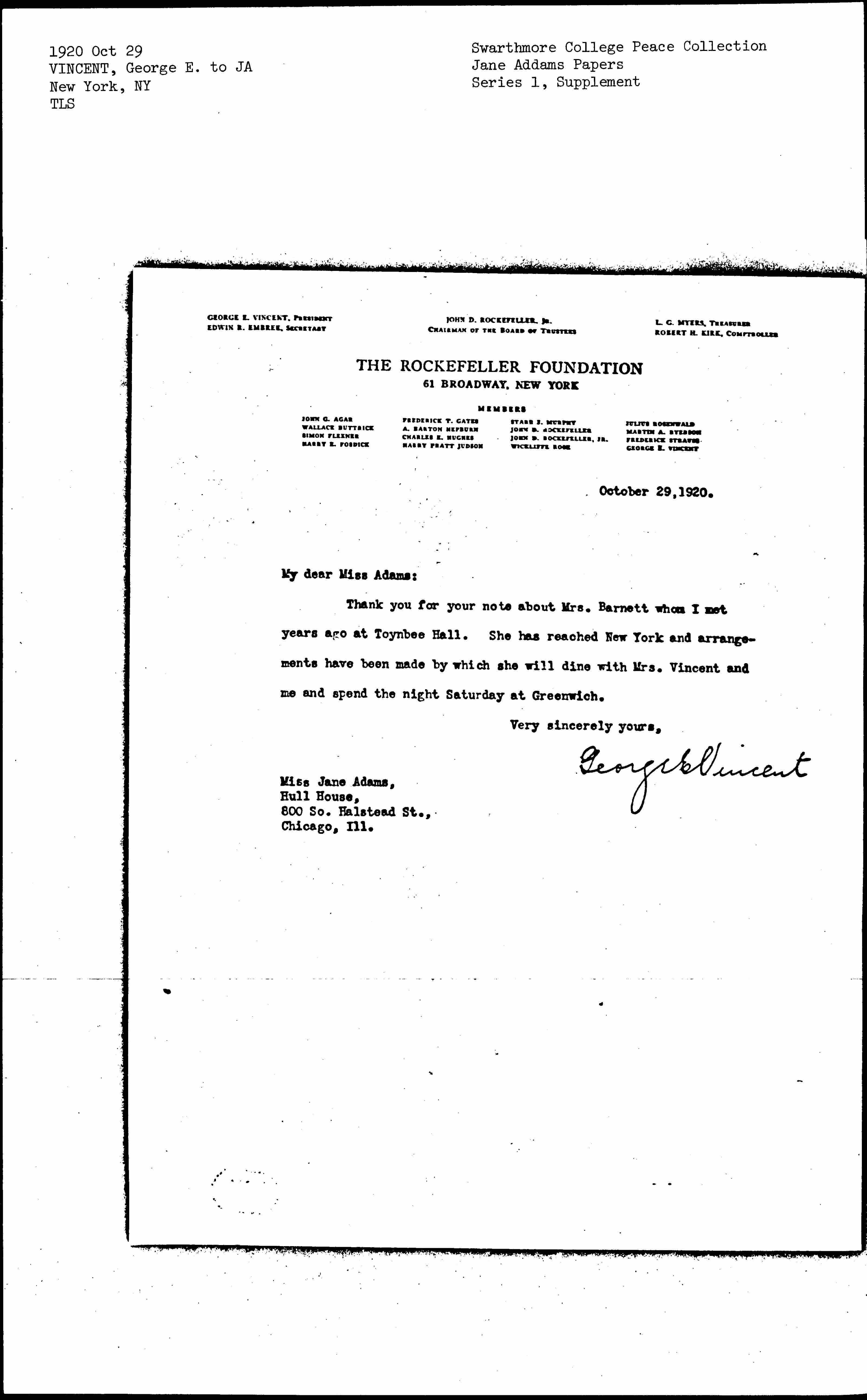 Thank you for your note about Mrs. Barnett whom I met years ago at Toynbee Hall. She has reached New York and arrangements have been made by which she will dine with Mrs. Vincent and me and spend the night Saturday at Greenwich.