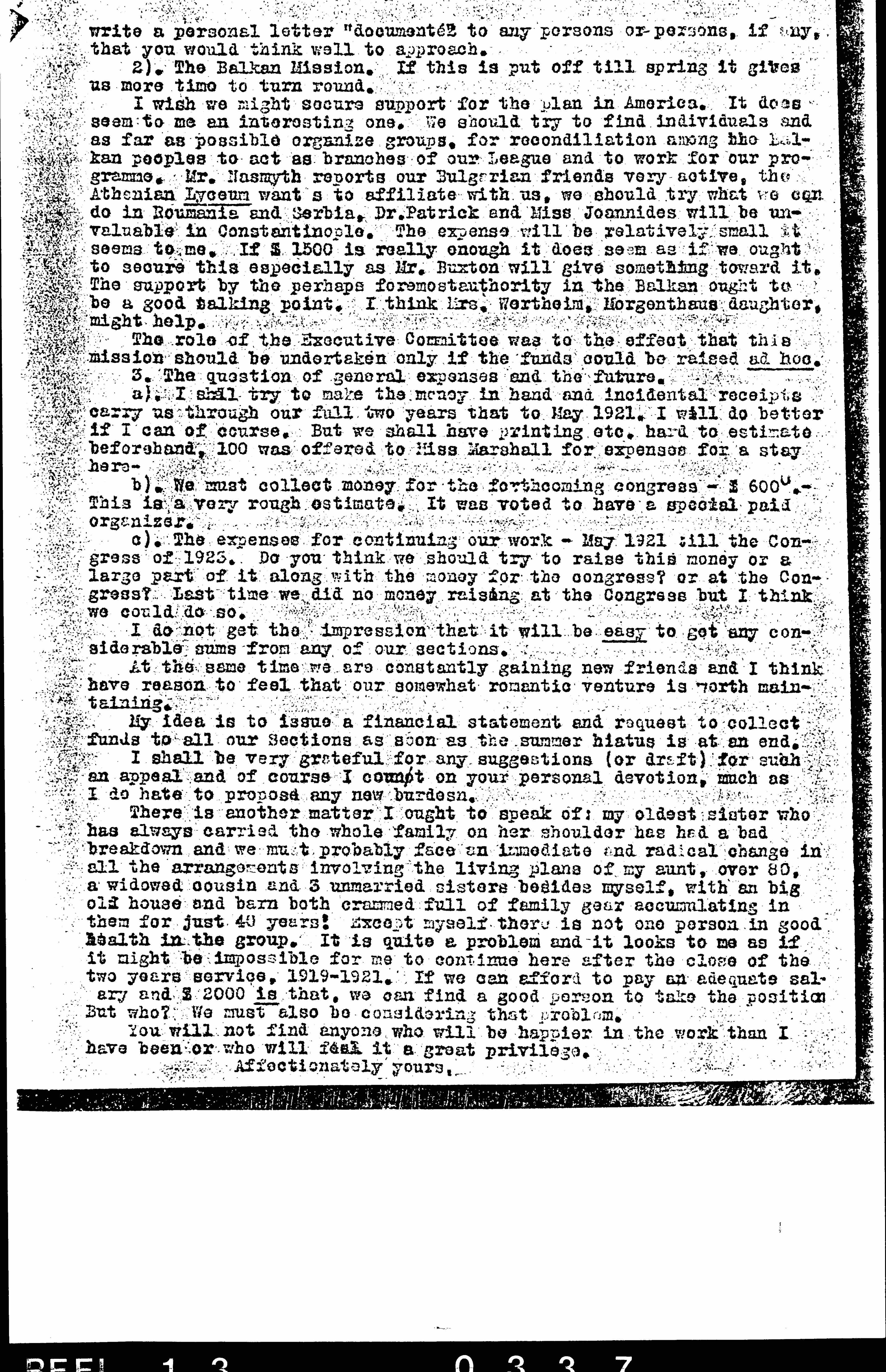 I wish we might secure support for the plan in America. It does seem to me an interesting one. We should try to find individuals and as far as possible organize groups, for [reconciliation] among the Balkan peoples to act as branches of our League and to work for our [program]. Mr. Nasmyth reports our Bulgarian friends very active, the Athenian Lyceum wants to affiliate with us, we should try what we can do in [Romania] and Serbia. Dr. Patrick and Miss Joannides will be [invaluable] in Constantinople. The expense will be relatively small it seems to me. If $1500 is really enough it does seem as if we ought to secure this especially as Mr. Buxton will give something toward it. The support by the perhaps foremost authority in the Balkan out to be a good talking point. I think Mrs. Wertheim, Morgenthaus daughter, might help.