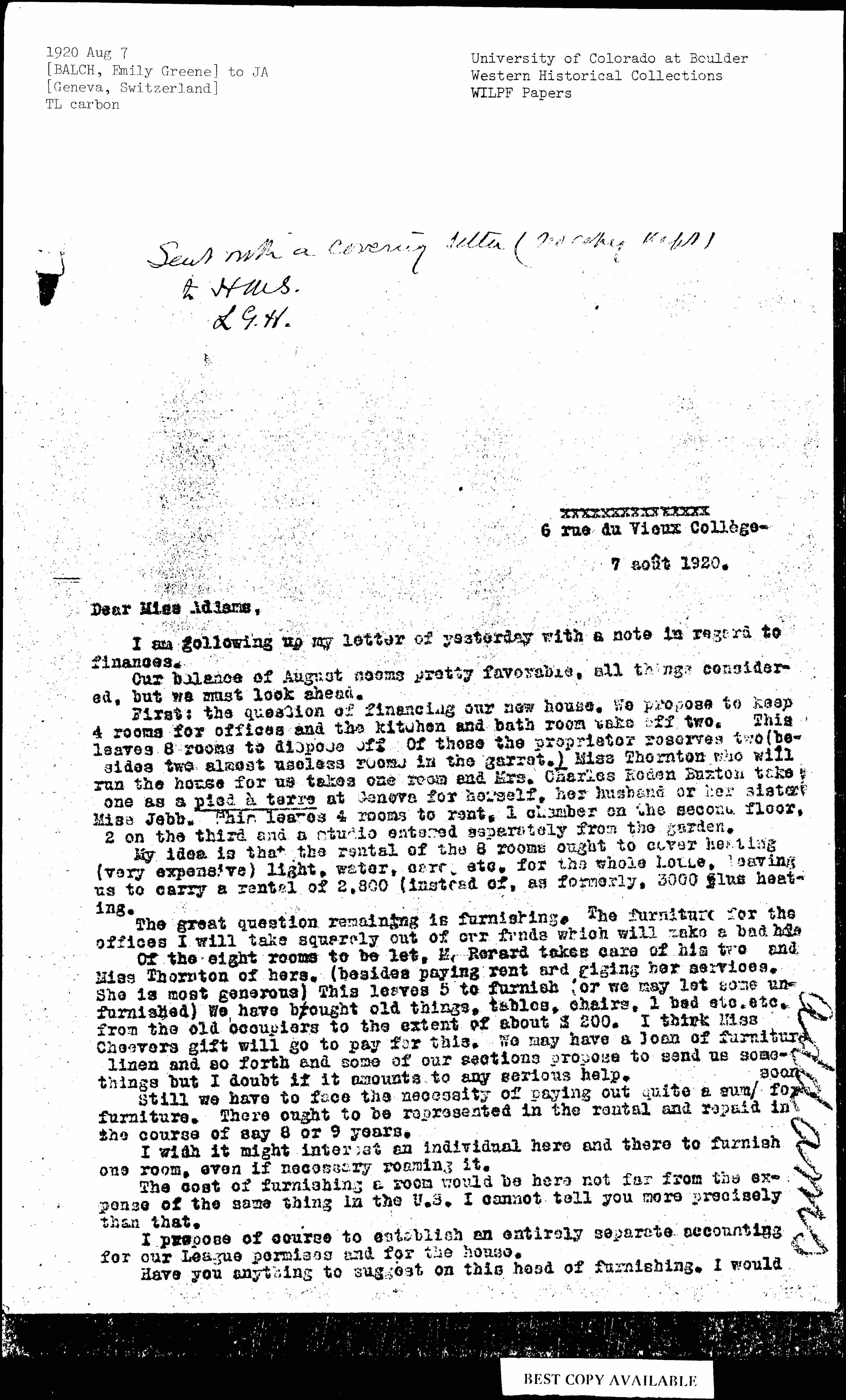 First: the question of financing our new house. We propose to keep 4 rooms for offices and the kitchen and bath room take off two. This leaves 8 rooms to dispose [of]. Of those the proprietor reserves two (besides two almost useless rooms in the garret.) Miss Thornton who will run the house for us takes one room and Mrs. Charles Roden Buxton [takes] one as a pied à terre at Geneva for herself, her husband or her sister [Miss] Jebb. This leaves 4 rooms to rent. 1 chamber on the second floor, 2 on the third and a studio entered separately from the garden.
