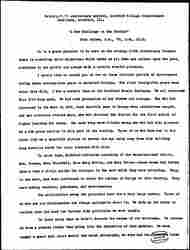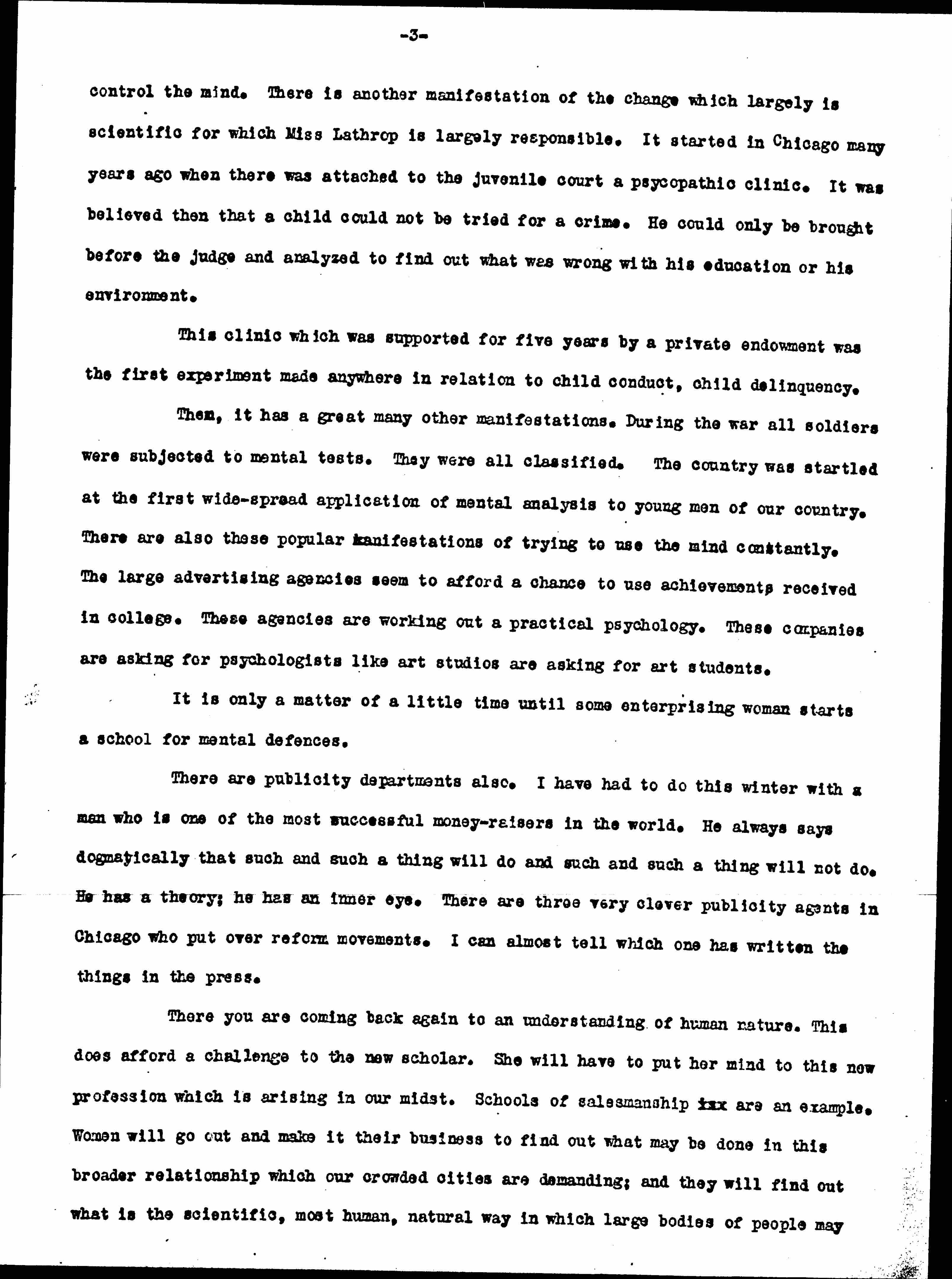 Here we are at the beginning of the last lap of our first century. A certain challenge is coming to educated women of the world which would not exist in the seventy-five years just finished. Research is being carried on very vigorously in the line of learning to use such mental equipment as the race has evolved at the present moment. They are to use the minds in a new way. There are many manifestations of it. One of the first manifestations of it expressed itself in certain religious and philosophic notes which might be described as suggestive mental healing -- the learning to [page 3] control the mind. There is another manifestation of the change which largely is scientific for which Miss Lathrop is largely responsible. It started in Chicago many years ago when there was attached to the juvenile court a [psychopathic] clinic. It was believed then that a child could not be tried for a crime. He could only be brought before the judge and analyzed to find out what was wrong with his education or his environment.