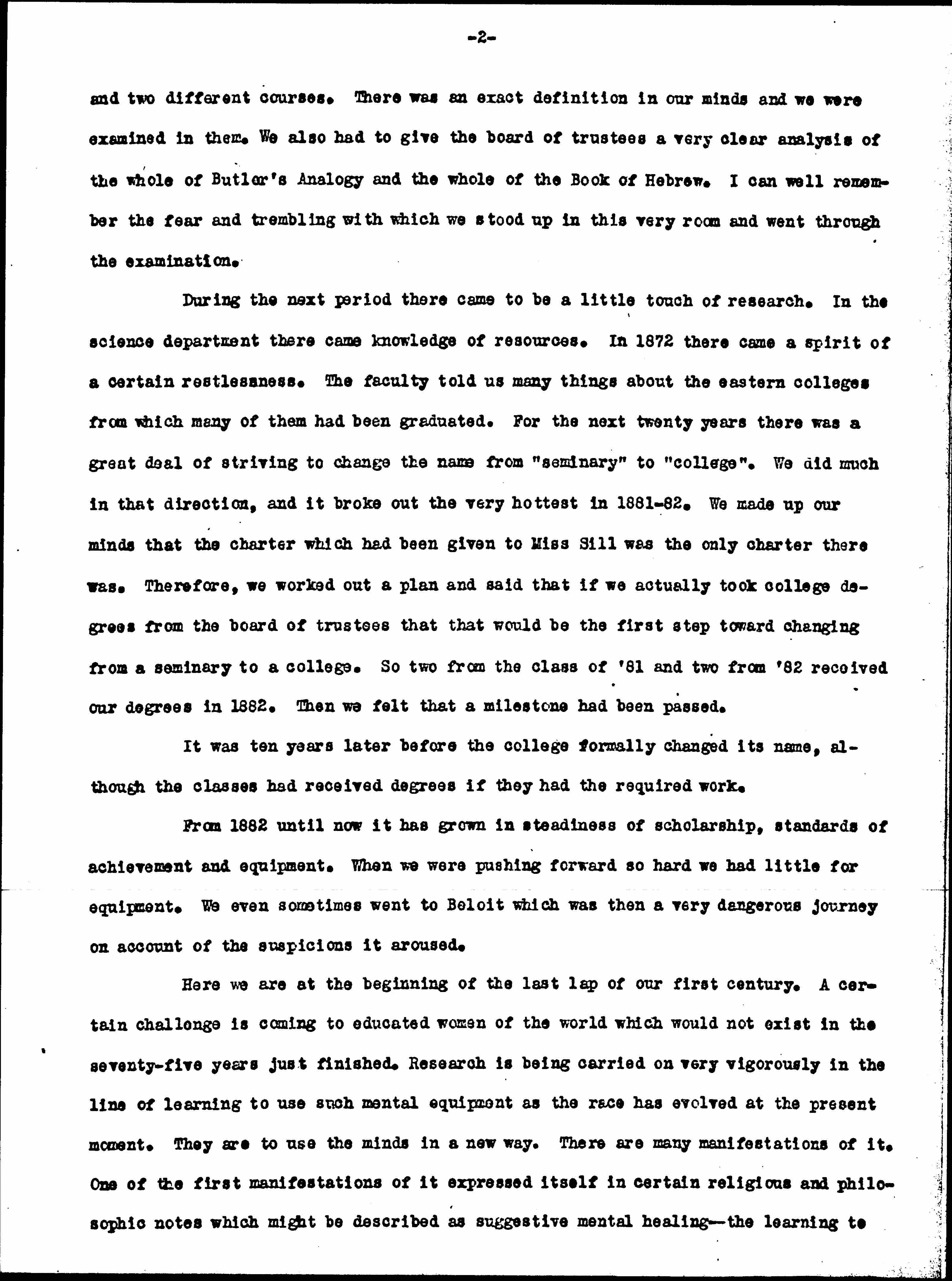 In those early days we didn’t discuss the causes of our knowledge. We reasoned from a premise rather than going into the foundation of that premise. We were taught a great deal about mental and moral philosophy, we even had two different books [page 2] and two different courses. There was an exact definition in our minds and we were examined in them. We also had to give the board of trustees a very clear analysis of the whole of Butler’s Analogy and the whole of the Book of Hebrew. I can well remember the fear and trembling with which we stood up in this very room and went through the examination.