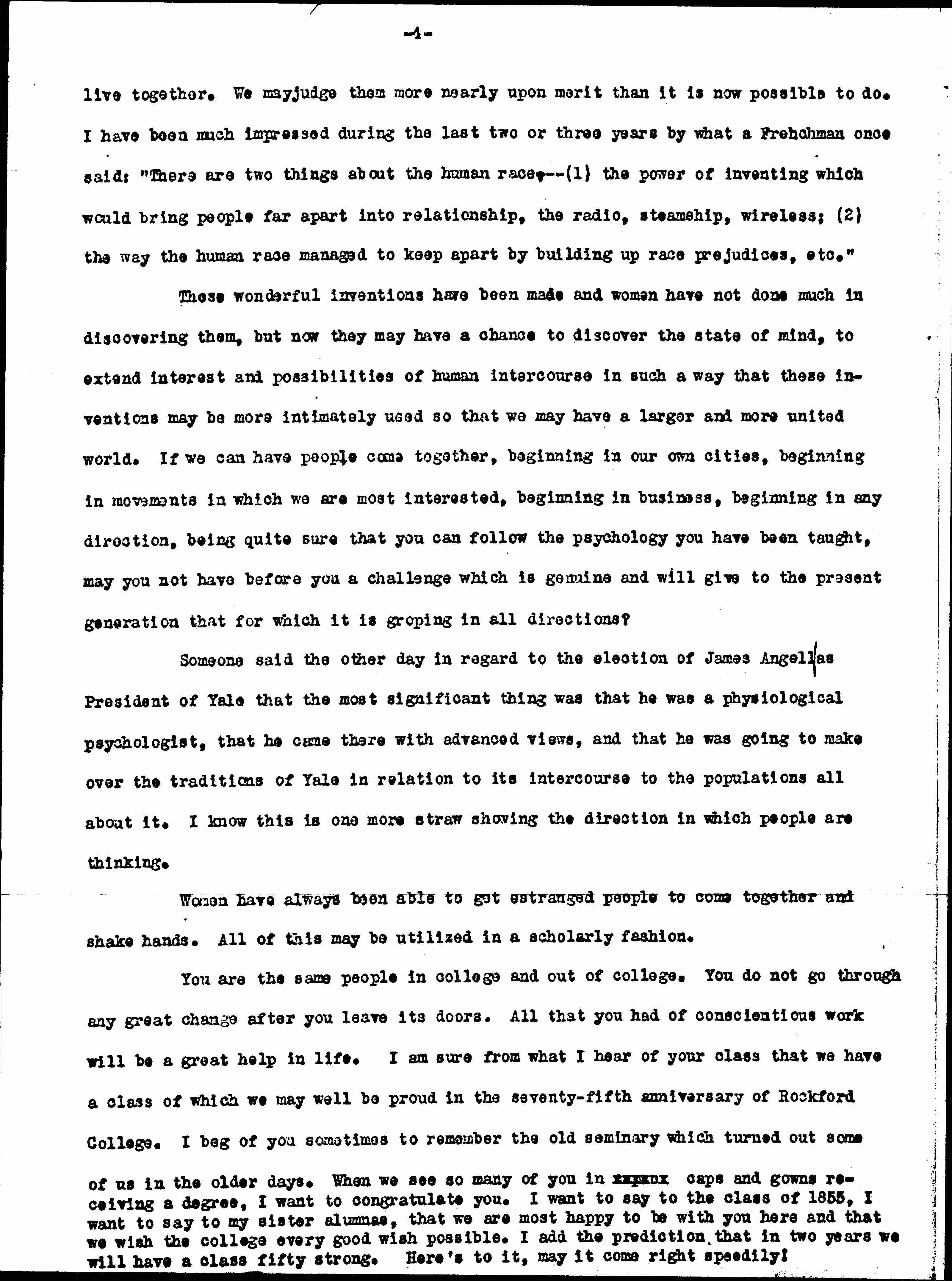 You are the same people in college and out of college. You don't go through any great change after you leave its doors. All that you had of conscientious work will be a great help in life. I am sure from what I hear of your class that we have a class of which we may well be proud in the seventy-fifth anniversary of Rockford College. I beg of you sometimes to remember the old seminary which turned out some of us in the older days. When we see so many of you in [illegible] caps and gowns receiving a degree, I want to congratulate you. I want to say to the class of 1855, I want to say to my sister alumnae, that we are most happy to be with you here and that we wish the college every good wish possible. I add the prediction that in two years we will have a class fifty strong. Here's to it, may it come right speedily!