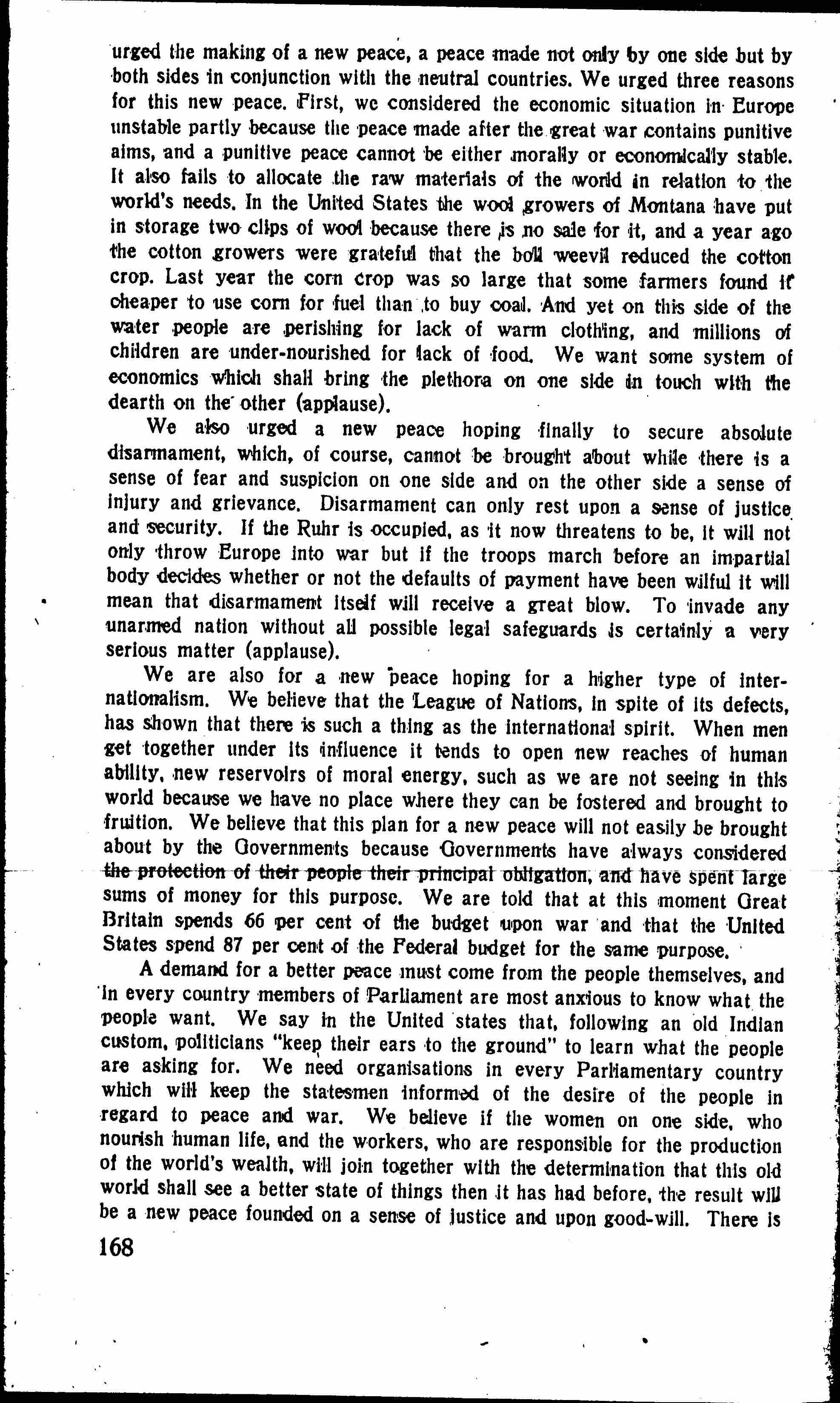 We are also for a new peace hoping for a higher type of internationalism. We believe that the League of Nations, in spite of its defects, has shown that there is such a thing as the international spirit. When men get together under its influence it tends to open new reaches of human ability, new reservoirs of moral energy, such as we are not seeing in this world because we have no place where they can be fostered and brought to fruition. We believe that this plan for a new peace will not easily be brought about by the Governments because Governments have always considered the protection of their people their principal obligation, and have spent large sums of money for this purpose. We are told that at this moment Great Britain spends 66 [percent] of the budget upon war and that the United States [spends] 87 [percent] of the Federal budget for the same purpose.