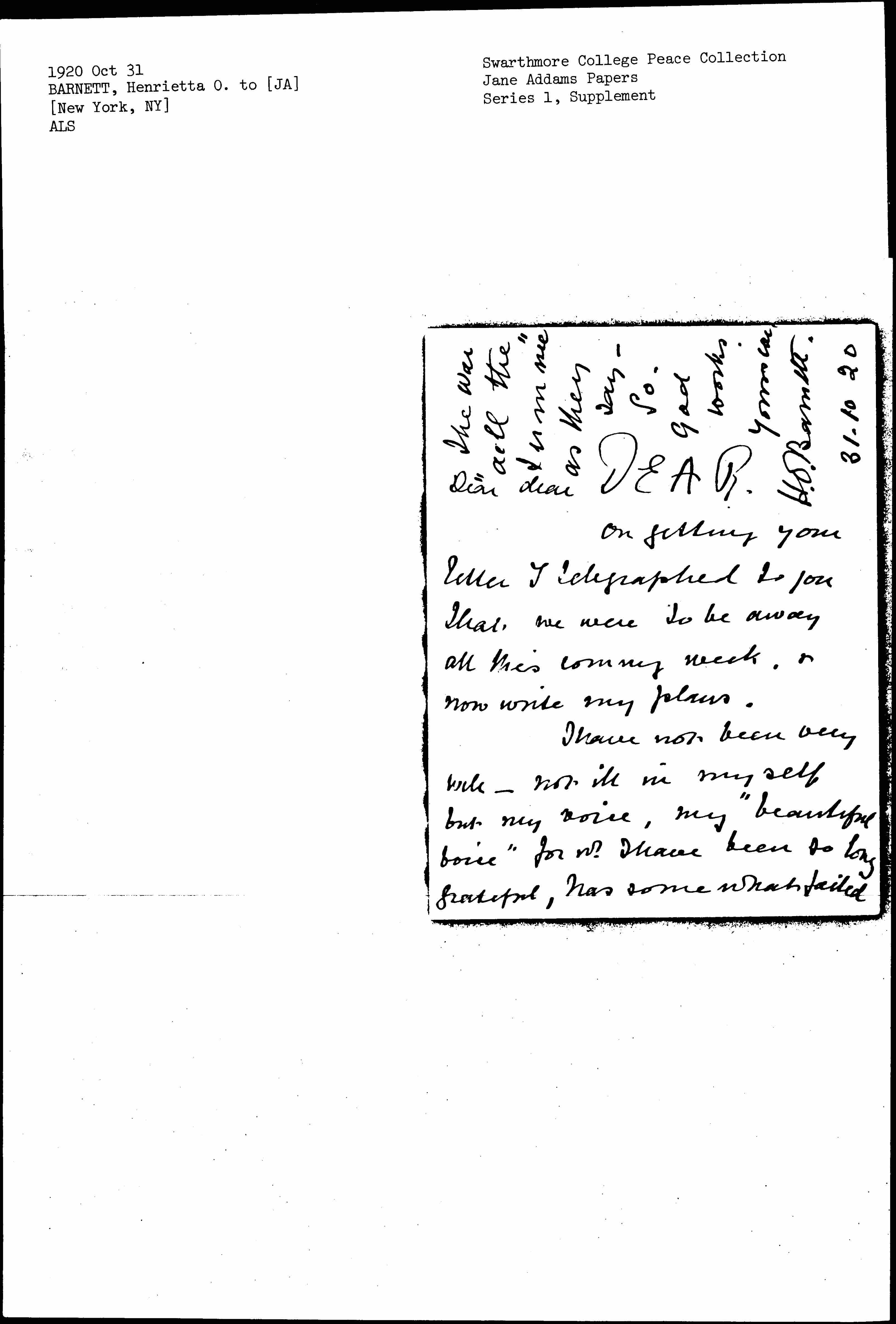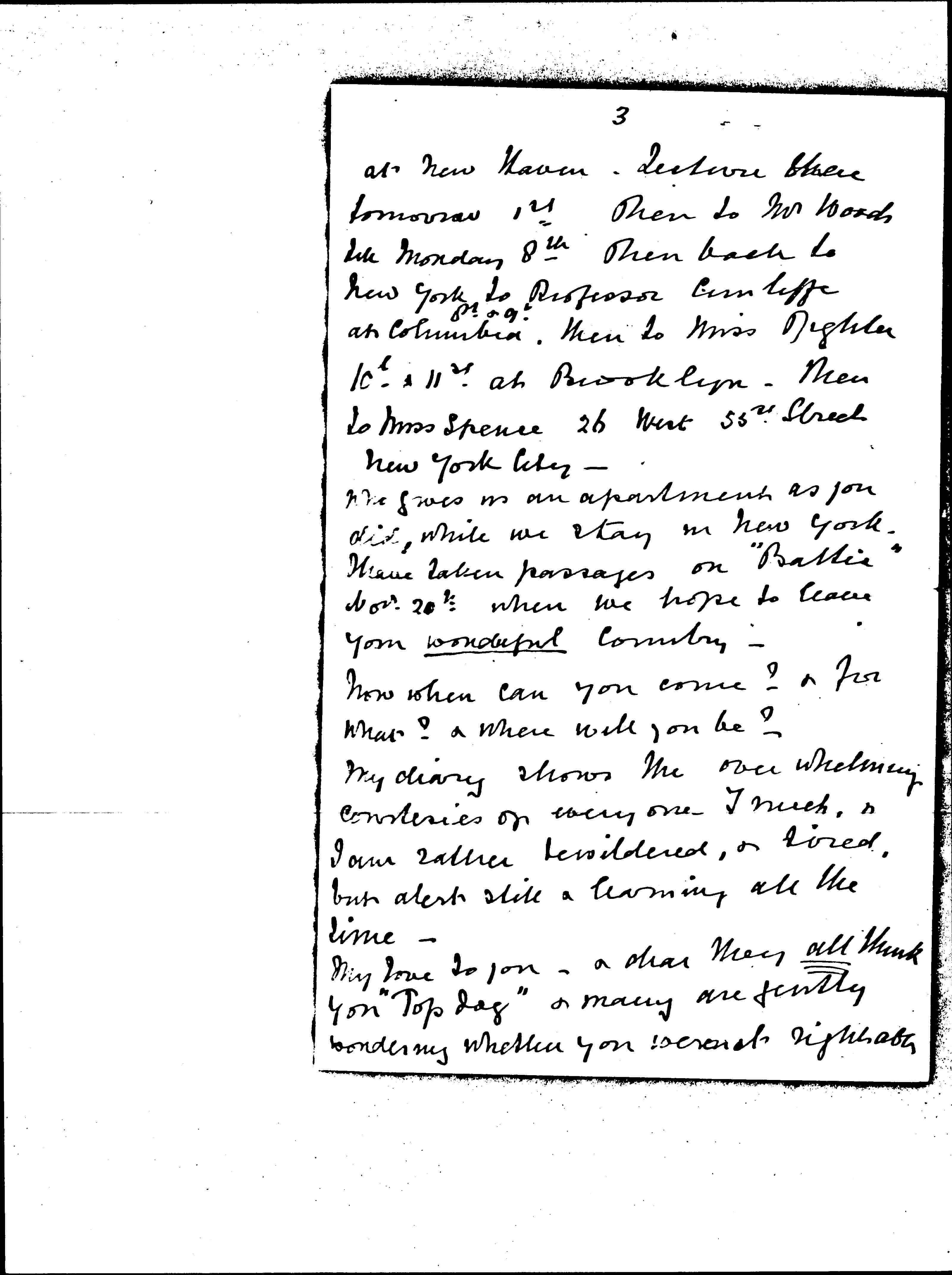 Thanks to you we are with Dr. & Mrs Vincent for one night & go on this afternoon to Prof. Farnam [page 3] at New Haven. Lecture there tomorrow 1st then to Mr Woods till Monday 8th then back to New York to Professor Cunliffe at Columbia ↑8th & 9th↓. Then to Miss Righter 10th & 11th at Brooklyn -- then to Miss Spence 26 West 55th Street New York City -- who gives us an apartment as you did, while we stay in New York. I have taken passages on "Baltic" Novr 20th when we hope to leave your wonderful country.
