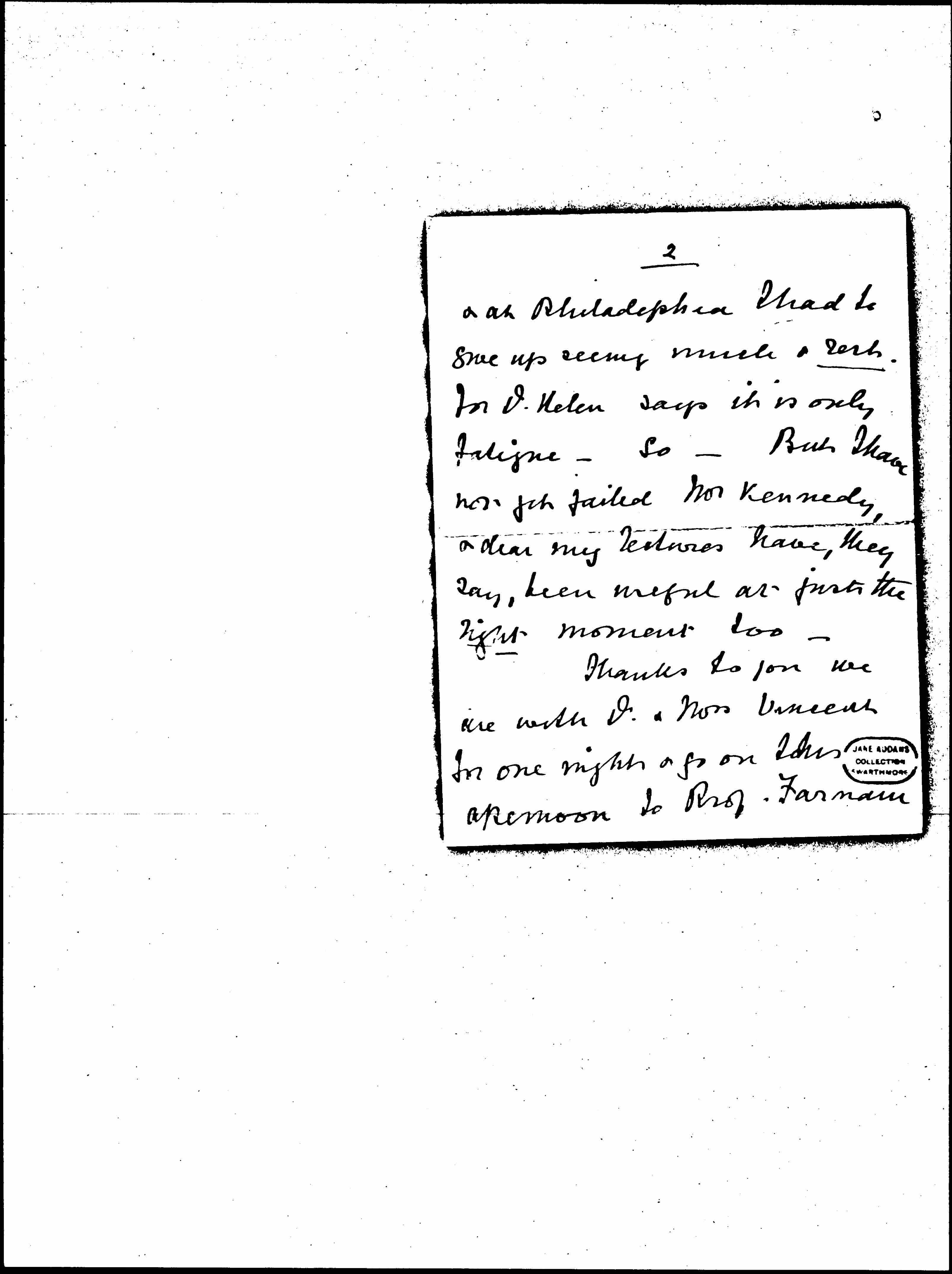 I have not been very well -- not ill in myself but my voice, my "beautiful voice" for wh I have been so long grateful, has somewhat failed [page 2] & at Philadelphia I had to give up seeing much & rest. For [Dr.] Helen says it is only fatigue -- So -- But I have not yet failed Mr Kennedy, & dear my lectures have, they say, been useful at just the right moment too.