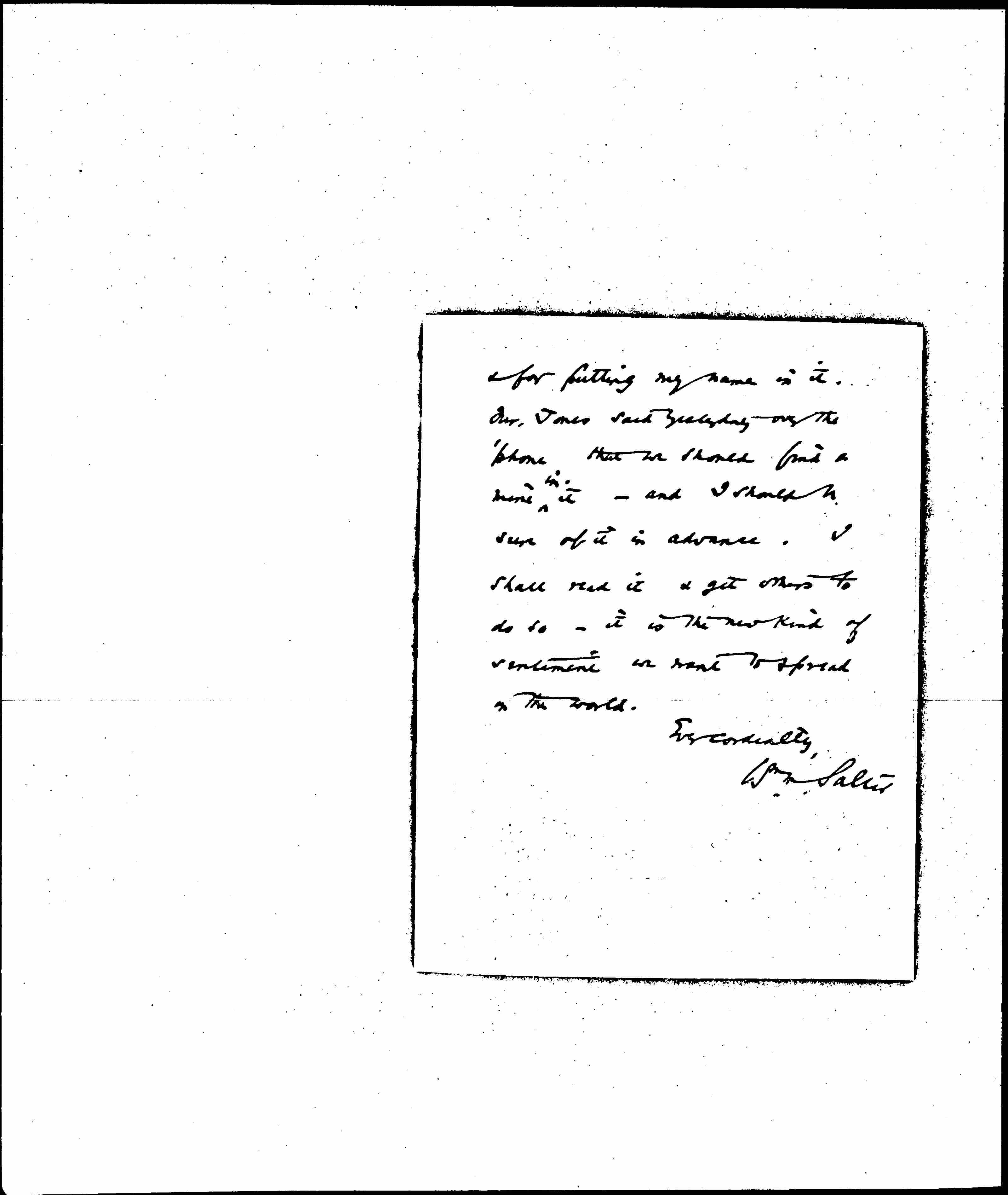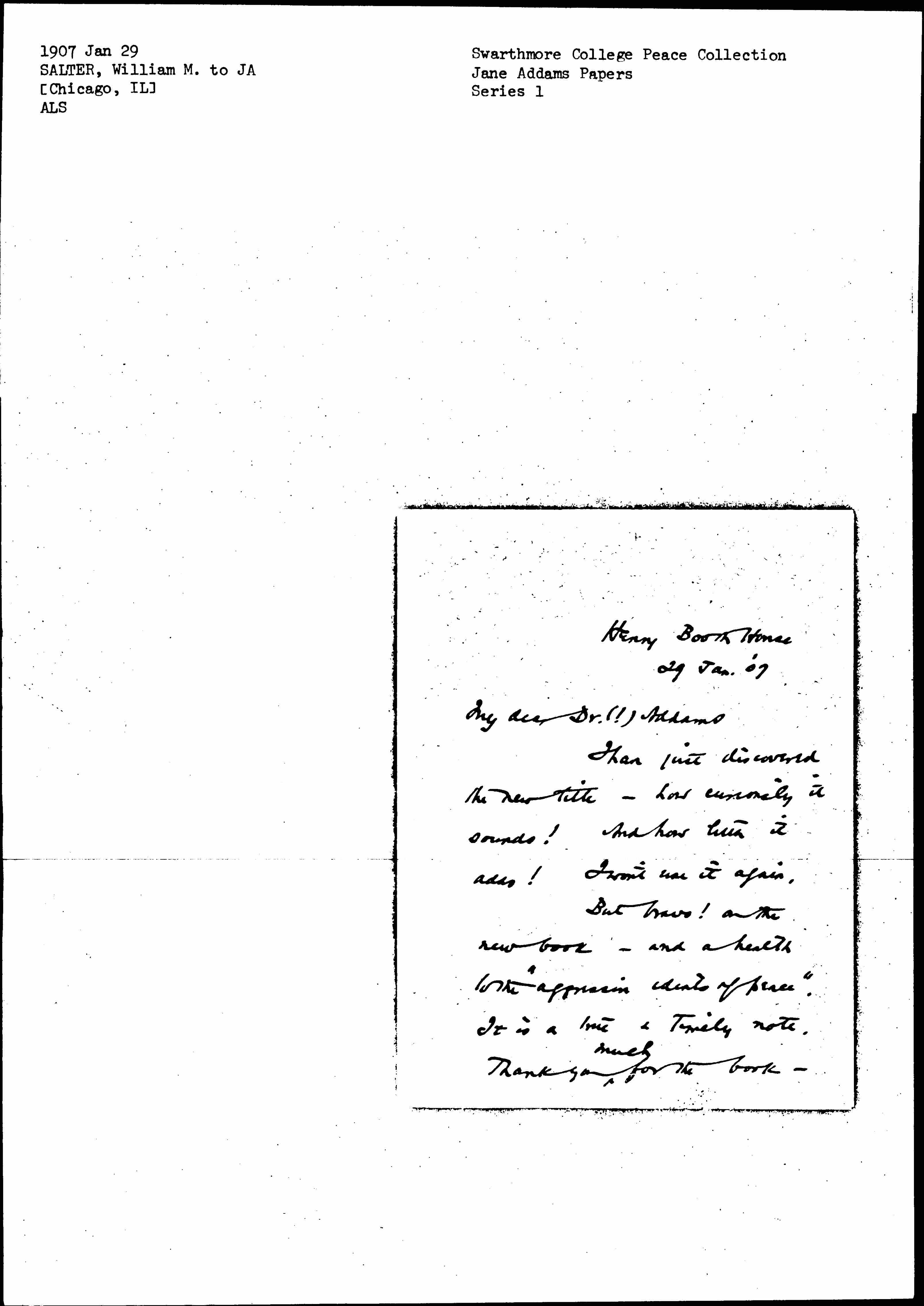 But bravo! on the new book -- and a health to the "aggressive ideals of peace". It is a true & timely note. Thank you <much> for the book -- [page 2] & for putting my name in it. Mr. Jones said yesterday over the 'phone that we should find a mine <in> it -- and I should be sure of it in advance. I shall read it & get others to do so -- it is the new kind of sentiment we want to spread in the world.