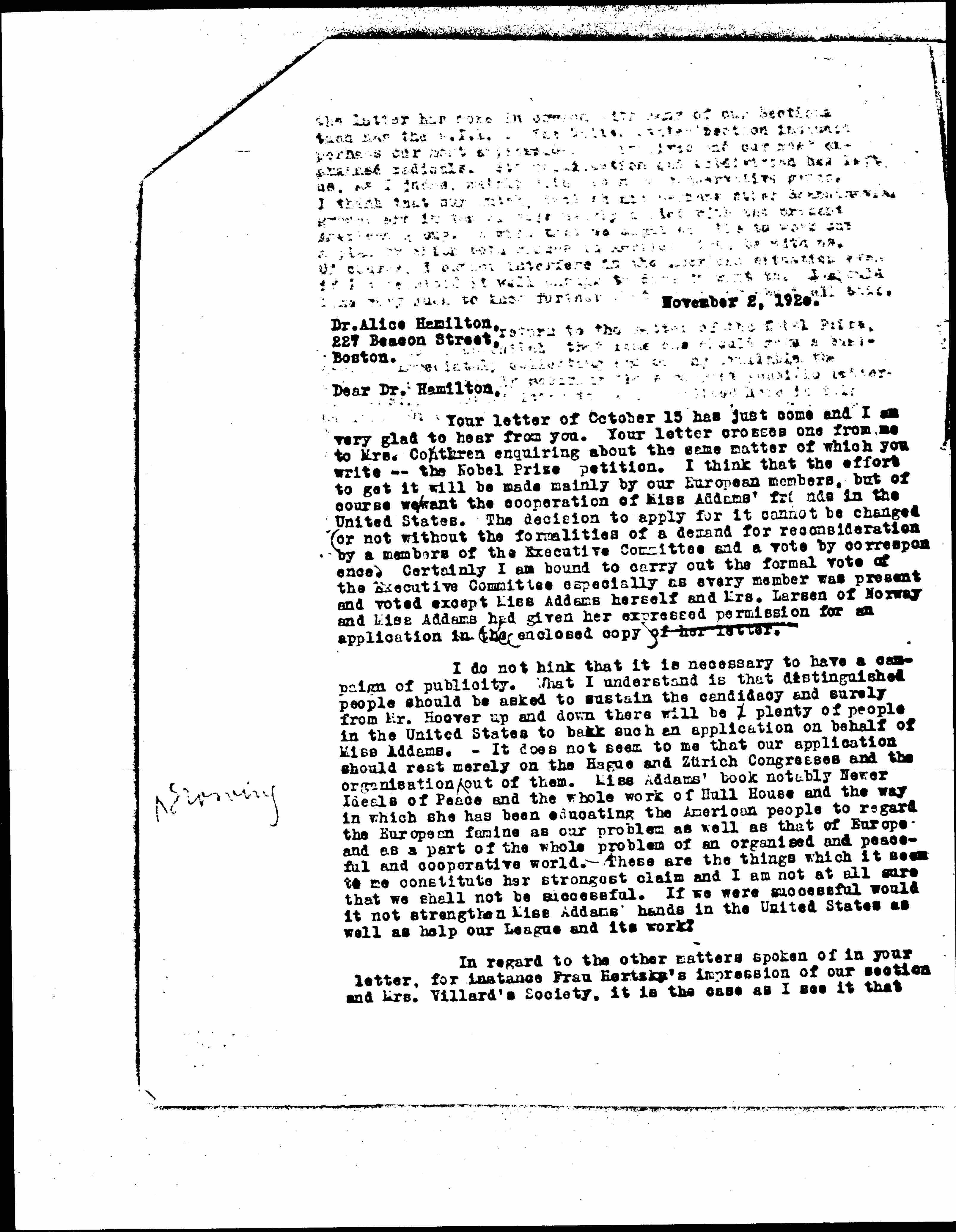 I do not think that it is necessary to have a campaign of publicity. What I understand is that distinguished people should be asked to sustain the candidacy and surely from Mr. Hoover up and down there will be plenty of people in the United States to back such an application on behalf of Miss Addams. -- It does not seem to me that our application should rest merely on The Hague and Zürich Congresses and the [organization] ↑growing↓ out of them. Miss Addams' book notably Newer Ideals of Peace and the whole work of Hull House and the way in which she has been educating the American people to regard the European famine as our problem as well as that of Europe and as a part of the whole problem of an [organized] and peaceful and cooperative world. These are the things which it seem to me constitute her strongest claim and I am not at all sure that we shall not be successful. If we were successful would it not strengthen Miss Addams' hands in the United States as well as help our League and its work?