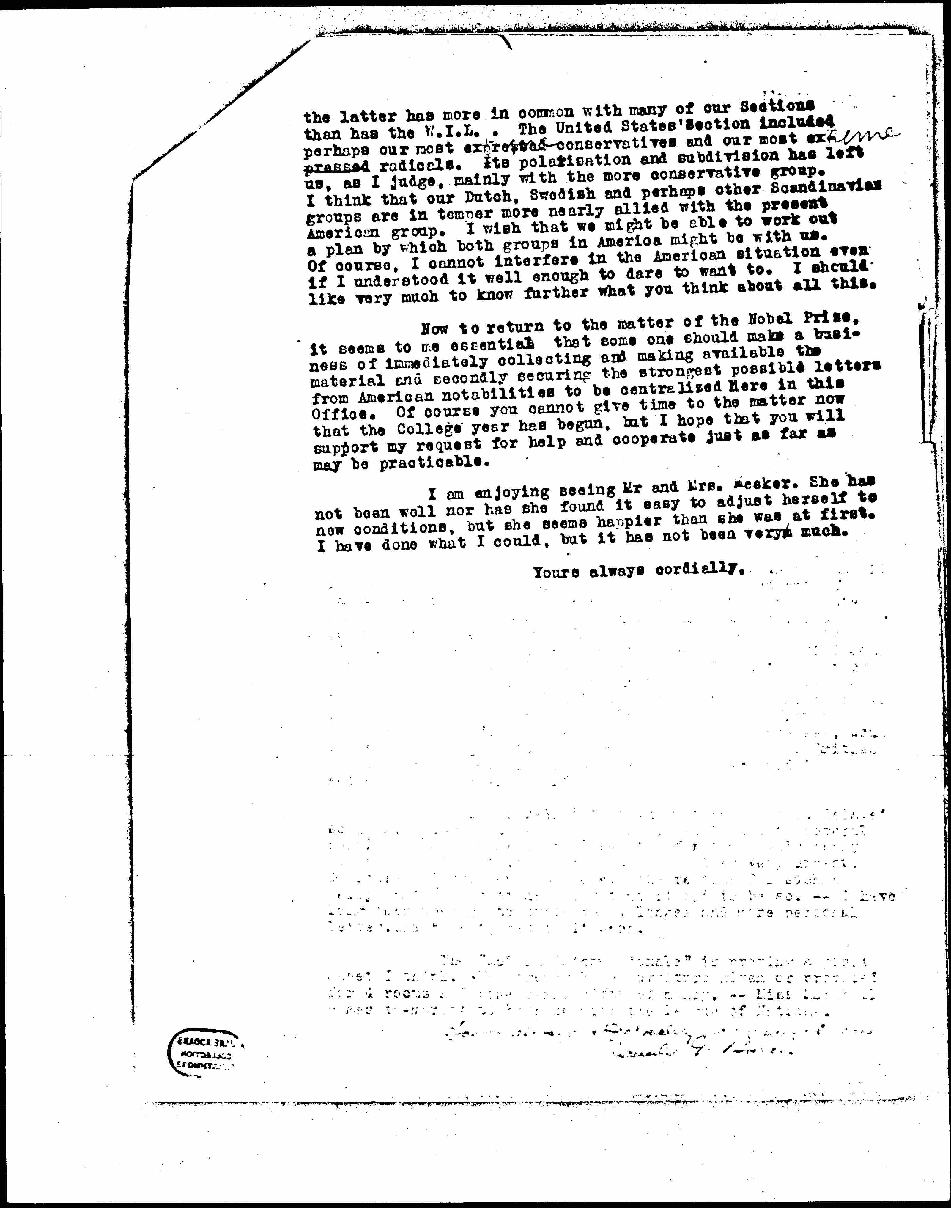 Now to return to the matter of the Nobel Prize, it seems to me essential that some one should make a business of immediately collecting and making available the material and secondly securing the strongest possible letters from American notabilities to be centralized here in this Office. Of course you cannot give time to the matter now that the College year has begun, but I hope that you will support my request for help and cooperate just as far as may be practicable.