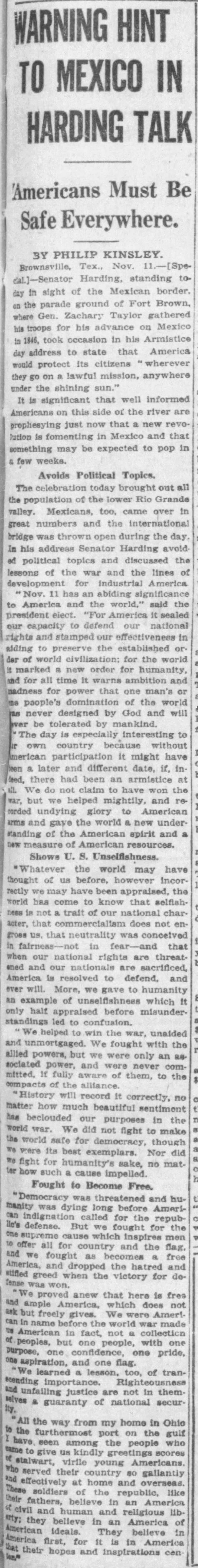 The celebration today brought out all the population of the lower Rio Grande valley. Mexicans, too, came over in great numbers and the international bridge was thrown open during the day. In his address Senator Harding avoided political topics and discussed the lessons of the war and the lines of development for industrial America.