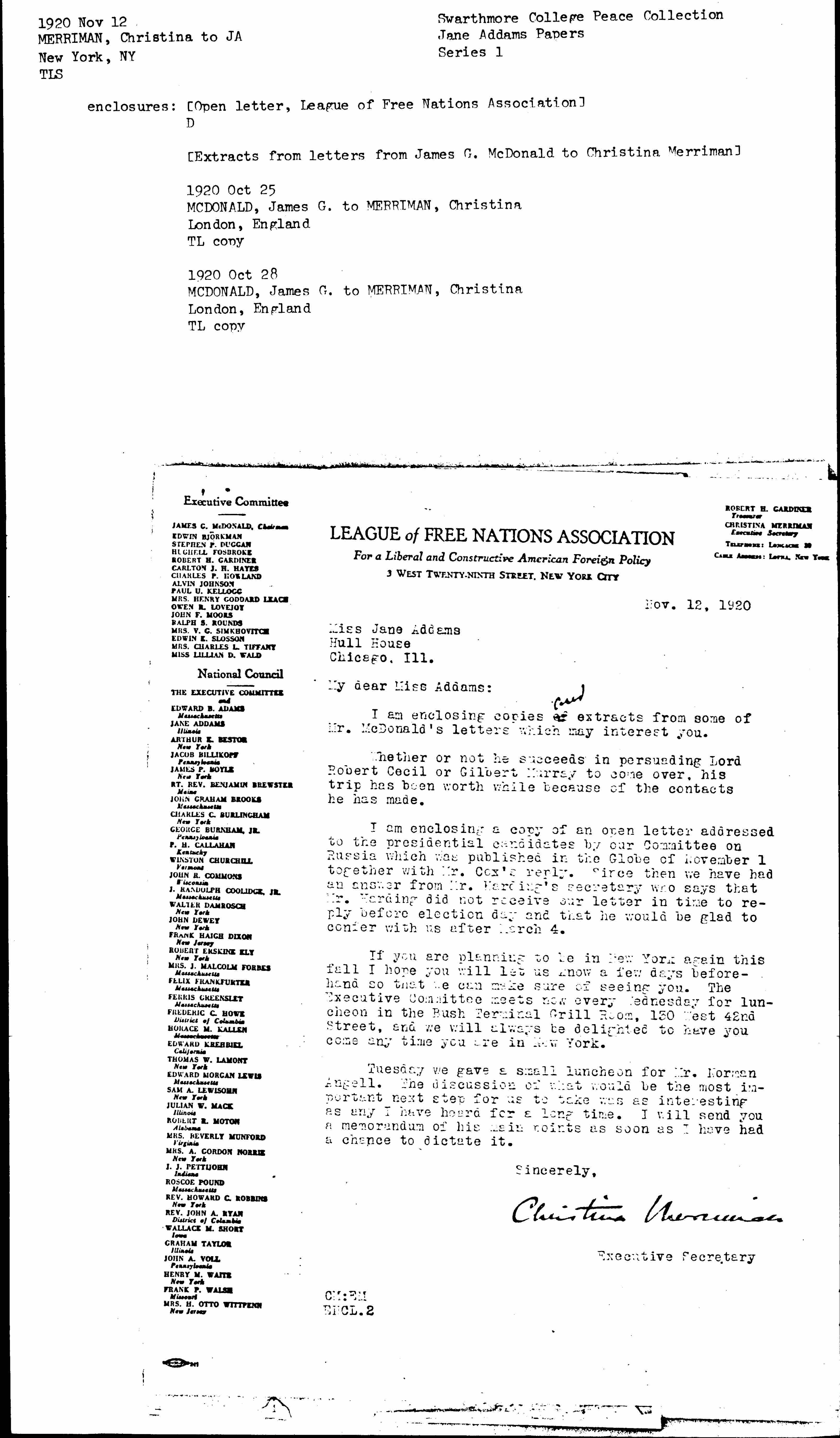 I am enclosing a copy of an open letter addressed to the presidential candidates by our Committee on Russia which was published in the Globe of November 1 together with Mr. Cox's reply. Since then we have had an answer from Mr. Harding's secretary who says that Mr. Harding did not receive our letter in time to reply before election day and that he would be glad to confer with us after March 4.