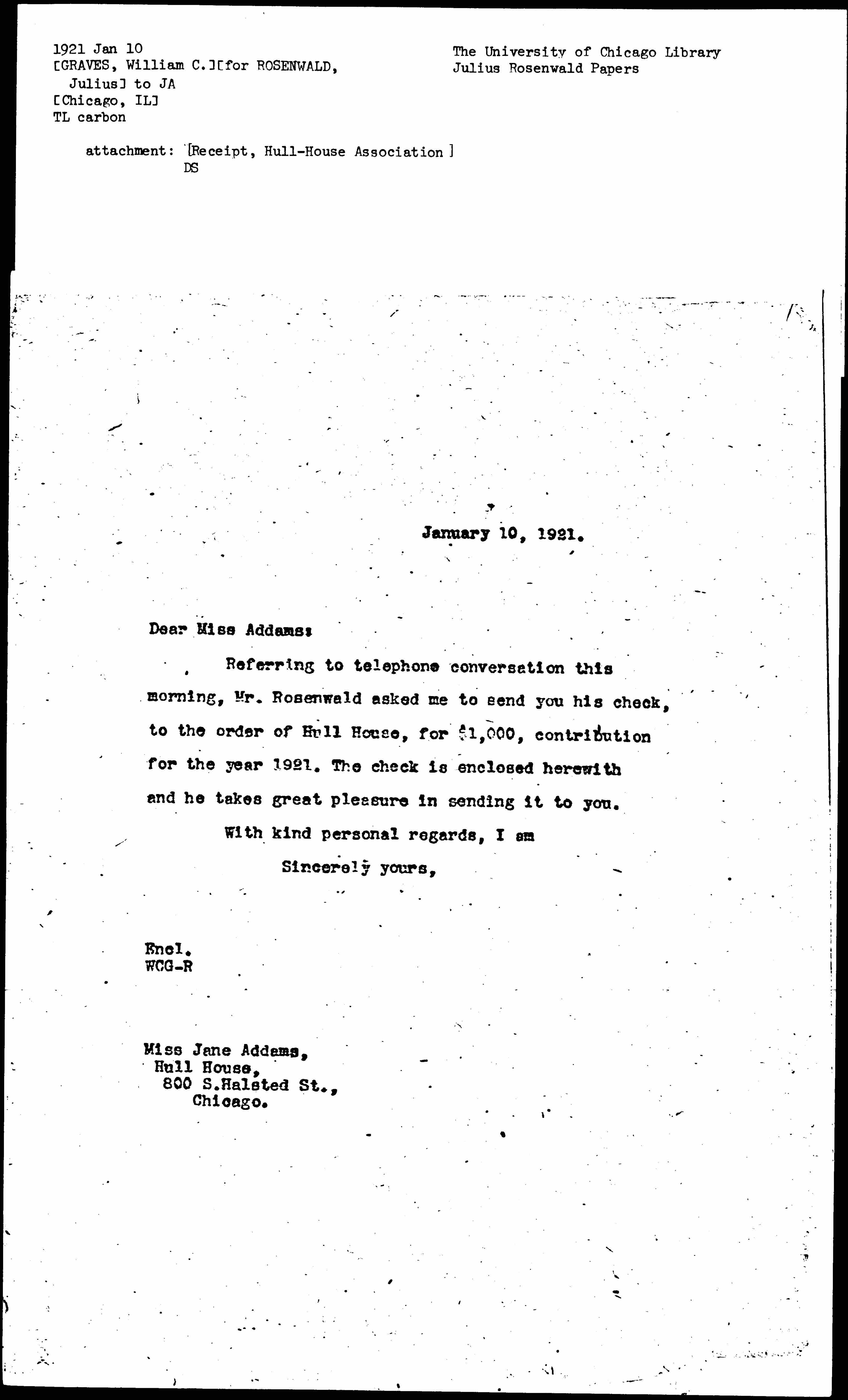 Referring to telephone conversation this morning, Mr. Rosenwald asked me to send you his check, to the order of Hull House, for $1,000, contribution for the year 1921. The check is enclosed herewith and he takes great pleasure in sending it to you.