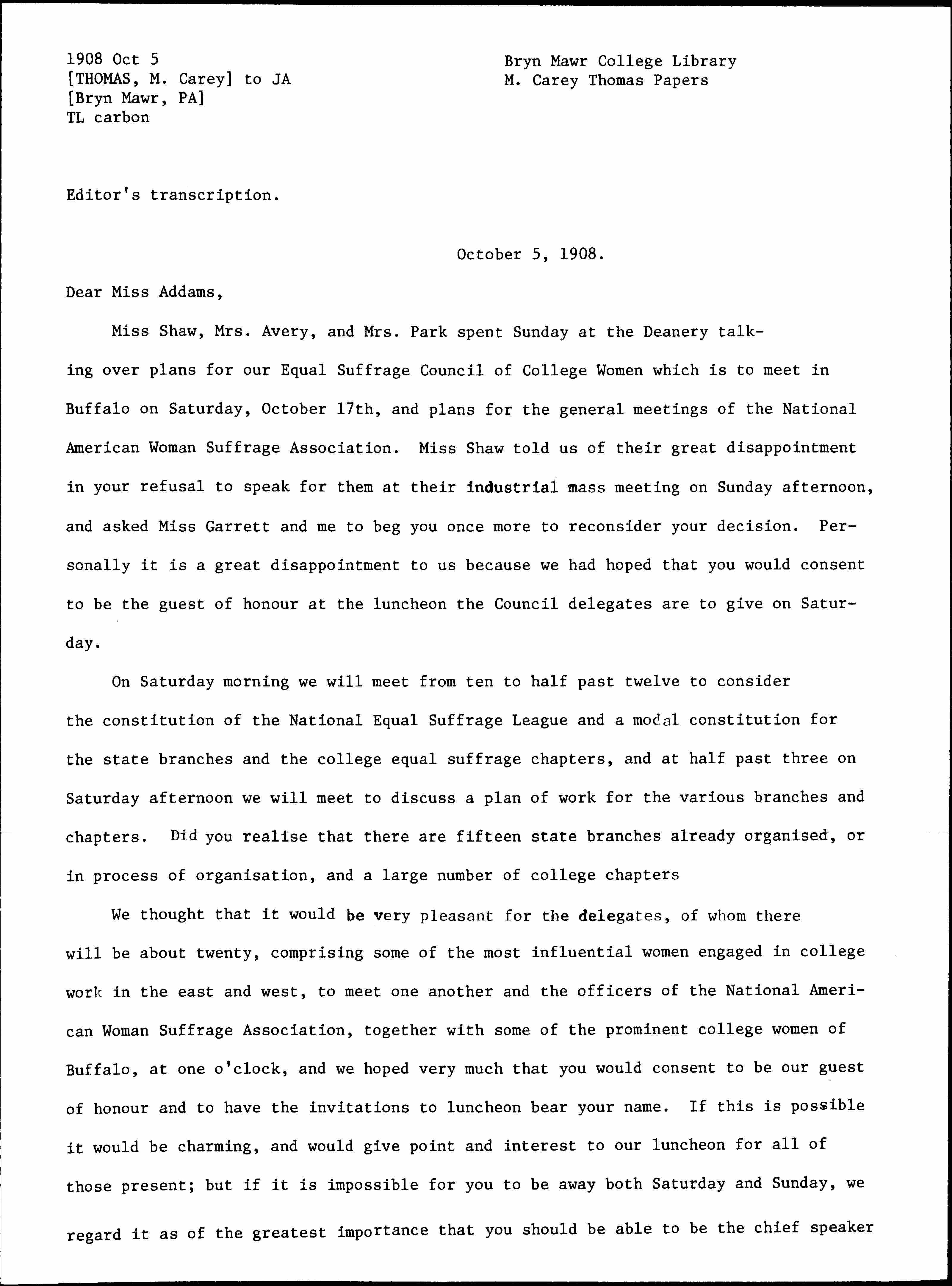 Miss Shaw, Mrs. Avery, and Mrs. Park spent Sunday at the Deanery talking over plans for our Equal Suffrage Council of College Women which is to meet in Buffalo on Saturday, October 17th, and plans for the general meetings of the National American Woman Suffrage Association. Miss Shaw told us of their great disapppointment in your refusal to speak for them at their industrial mass meeting on Sunday afternoon, and asked Miss Garrett and me to beg you once more to reconsider your decision. Personally it is a great disappointment to us because we had hoped that you would consent to be the guest of [honor] at the luncheon the Council delegates are to give on Saturday.