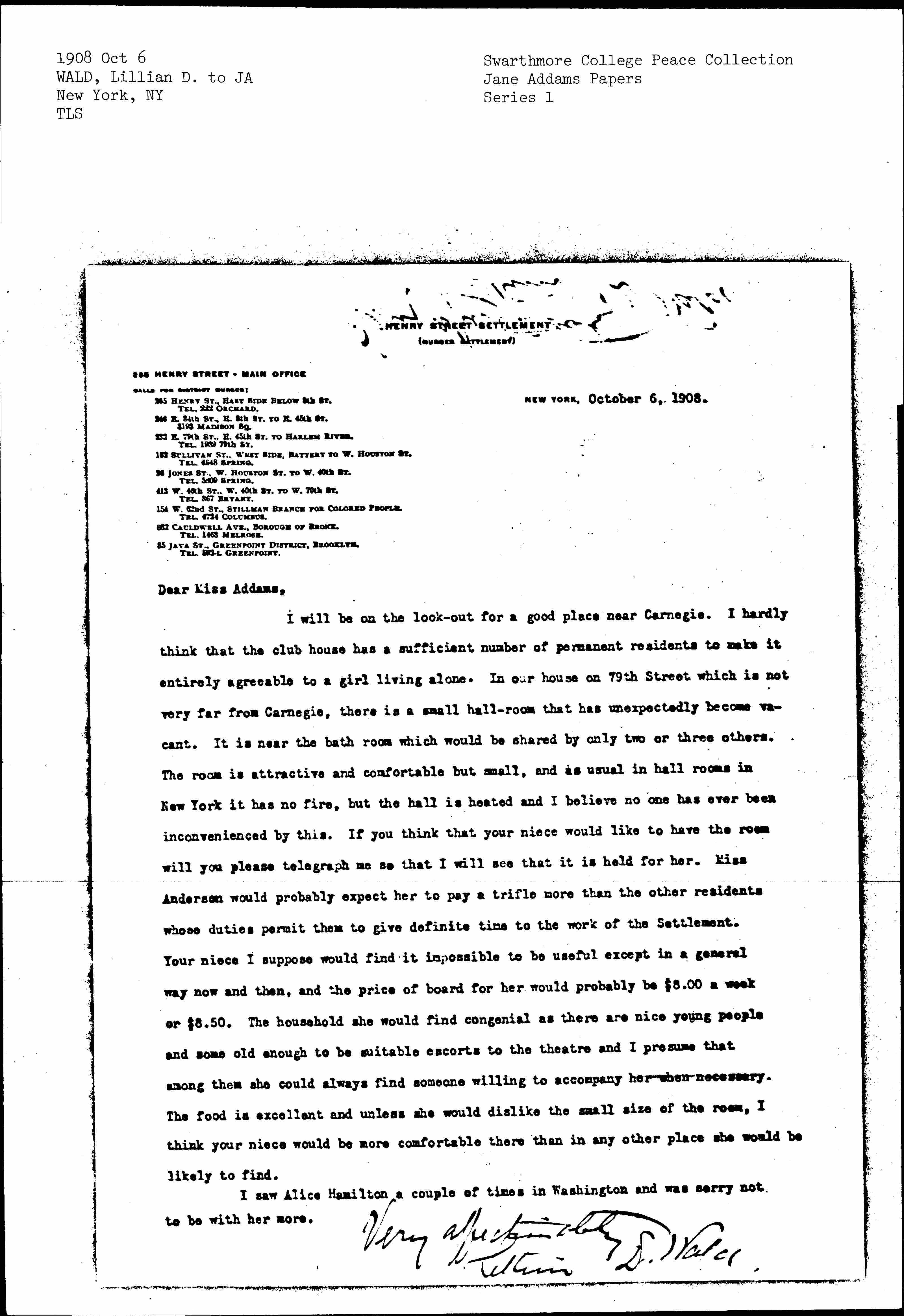 I will be on the look-out for a good place near Carnegie. I hardly think that the club house has a sufficient number of permanent residents to make it entirely agreeable to a girl living alone. In our house on 79th Street which is not very far from Carnegie, there is a small hall-room that has unexpectedly become vacant. It is near the bath room which would be shared by only two or three others. The room is attractive and comfortable but small, and as usual in hall rooms in New York it has no fire, but the hall is heated and I believe no one has ever been inconvenienced by this. If you think that your niece would like to have the room will you please telegraph me so that I will see that it is held for her. Miss Anderson would probably expect her to pay a trifle more than the other residents whose duties permit them to give definite time to work of the Settlement. Your niece I suppose would find it impossible to be useful except in a general way now and then, and the price of board for her would probably be $8.00 a week or $8.50. The household she would find congenial as there are nice young people and some old enough to be suitable escorts to the [theater] and I presume that among them she could always find someone willing to accompany her when necessary. The food is excellent and unless she would dislike the small size of the room, I think your niece would be more comfortable there than in any other place she would be likely to find.