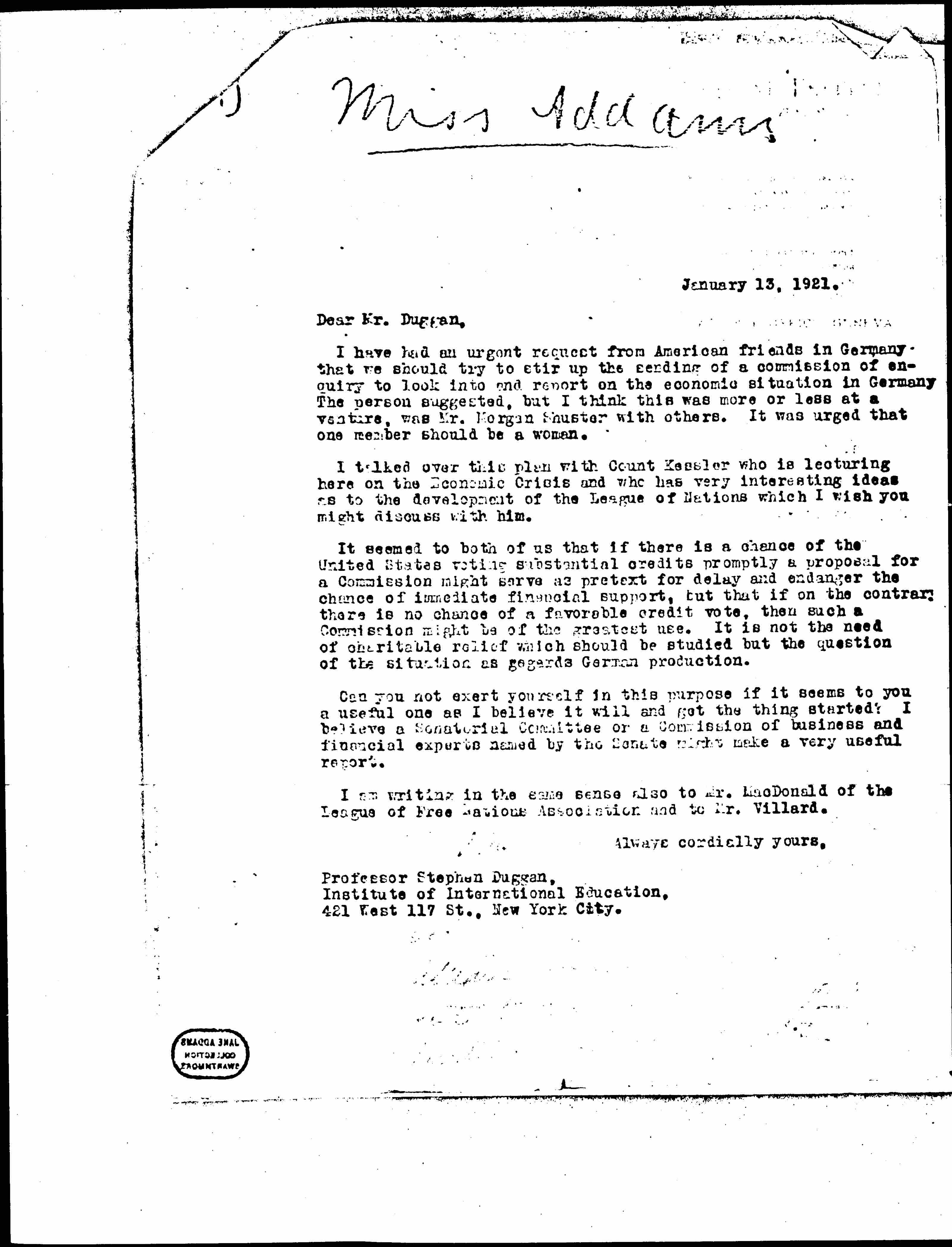 I have had an urgent request from American friends in Germany that we should try to stir up the sending of a commission of enquiry to look into and report on the economic situation in Germany. The person suggested, but I think this was more or less at a venture, was Mr. Morgan Shuster with others. It was urged that one member should be a woman.