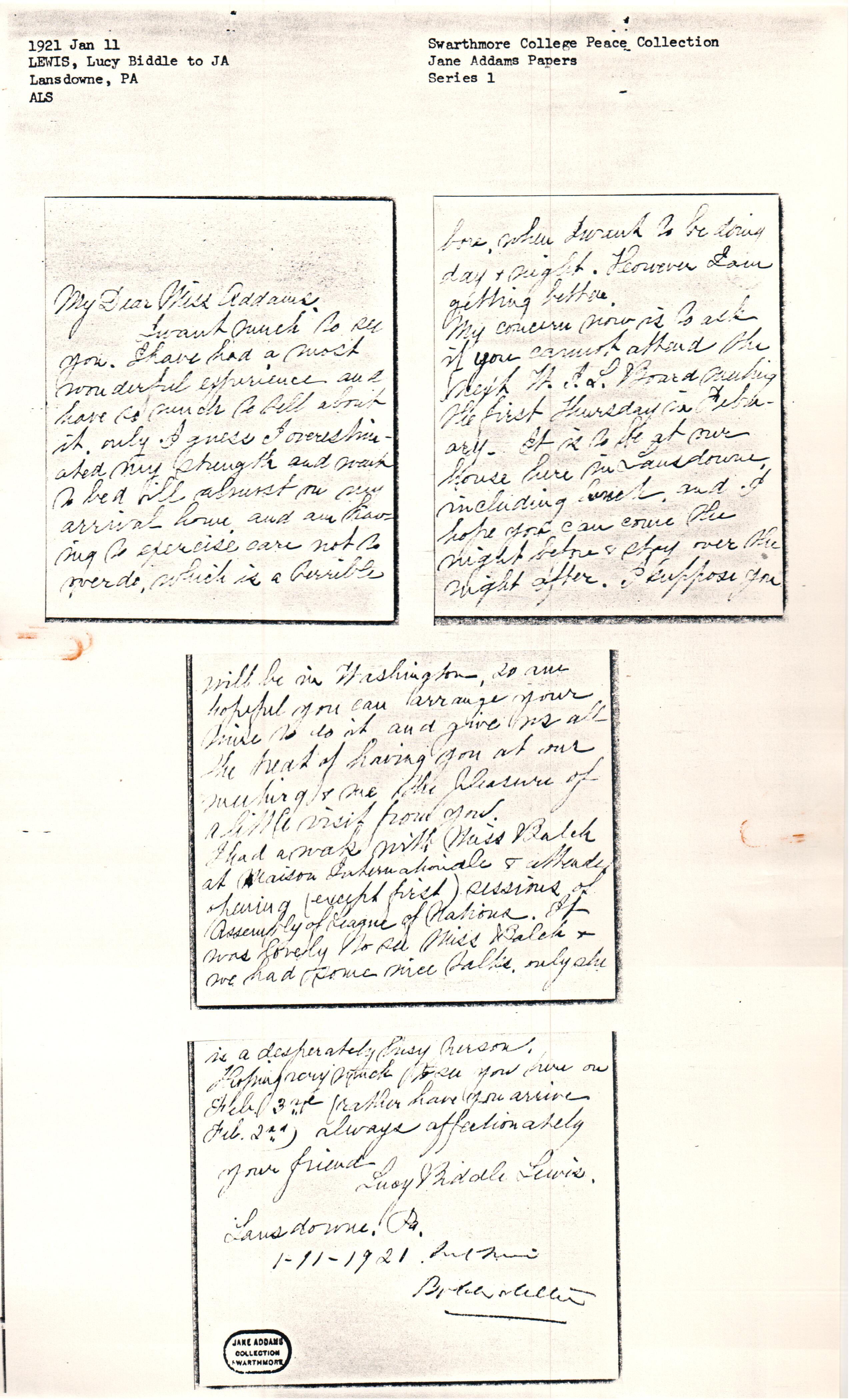 My concern now is to ask if you cannot attend the next W.I.L. Board meeting the first Thursday in February. It is to be at our house here in Lansdowne, including lunch, and I hope you can come the night before & stay over the night after. I suppose you [page 3] will be in Washington, so am hopeful you can arrange your [time] so do it and give us all the treat of having you at our meeting & me the pleasure of a little visit from you.