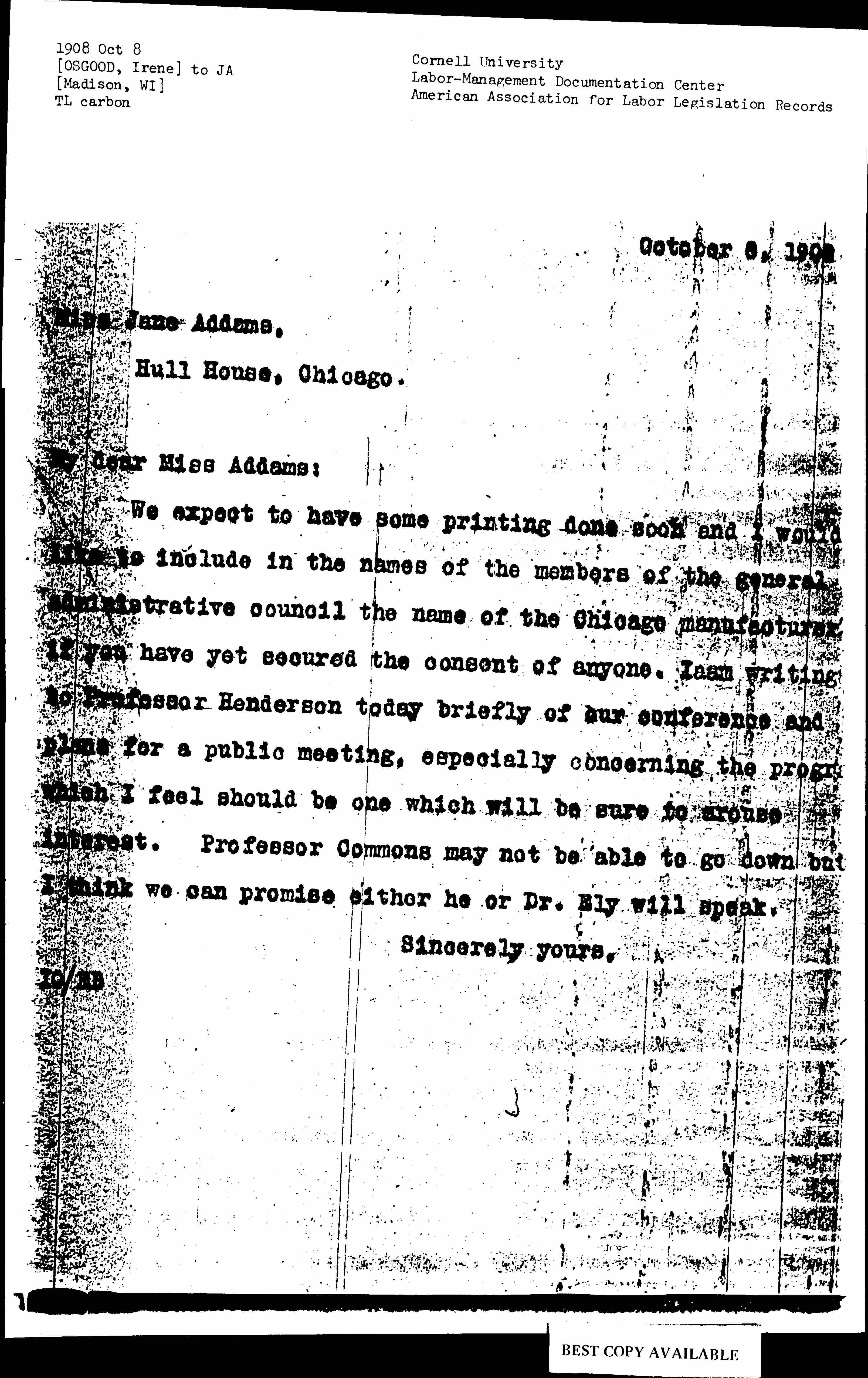 We expect to have some printing done soon and I would like to include in the names of the members of the general administrative council the name of the Chicago manufacturers if you have yet secured the consent of anyone. I am writing to Professor Henderson today briefly of our conference and plans for a public meeting, especially concerning the [programs] which I feel should be one which will be sure to arouse interest. Professor Commons may not be able to go down but I think we can promise either he or Dr. Ely will speak.