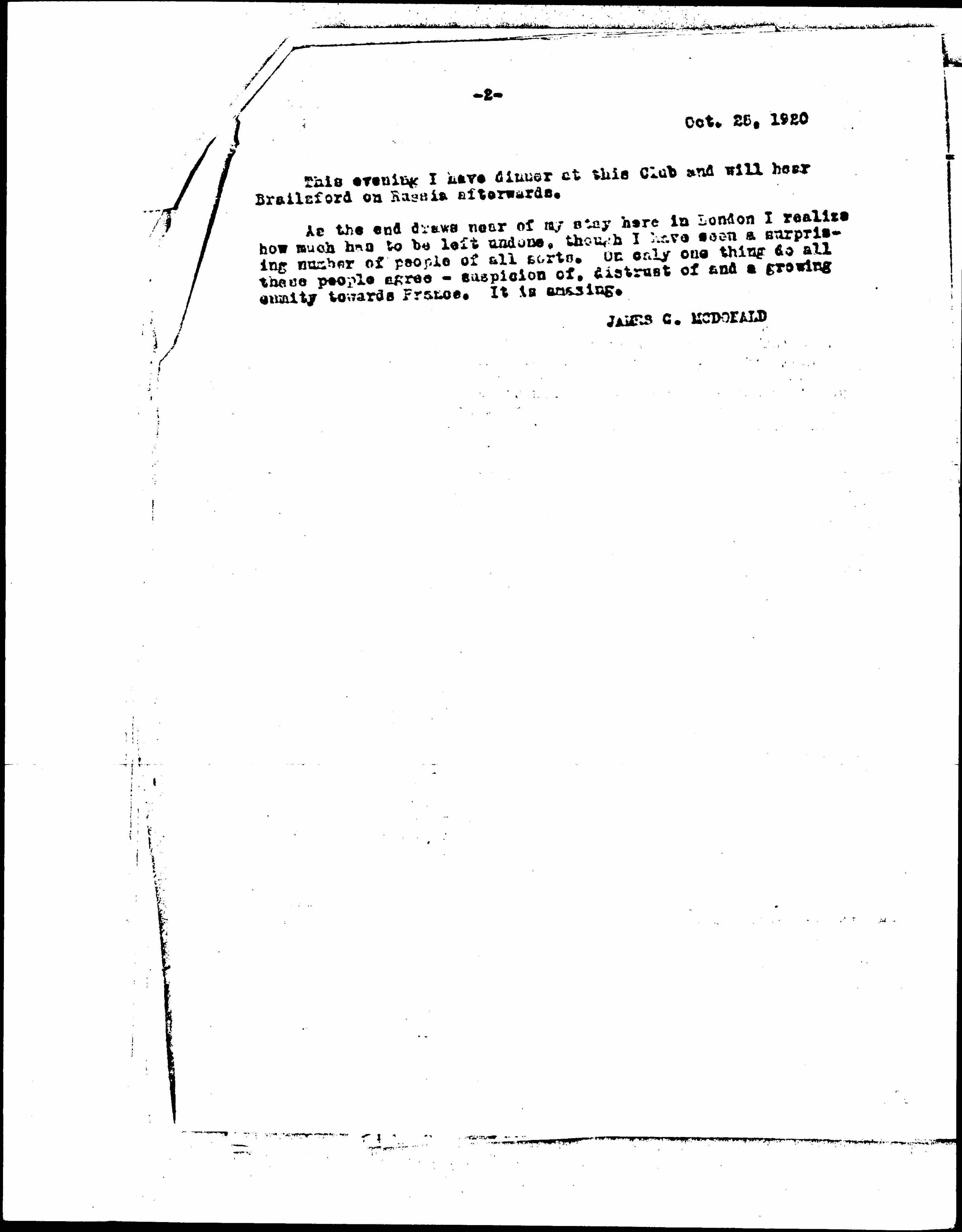 As the end draws near of my stay here in London I realize how much has to be left undone, though I have seen a surprising number of people of all sorts. On only one thing do all these people agree -- suspicion of, distrust of and a growing enmity towards France. It is amazing.