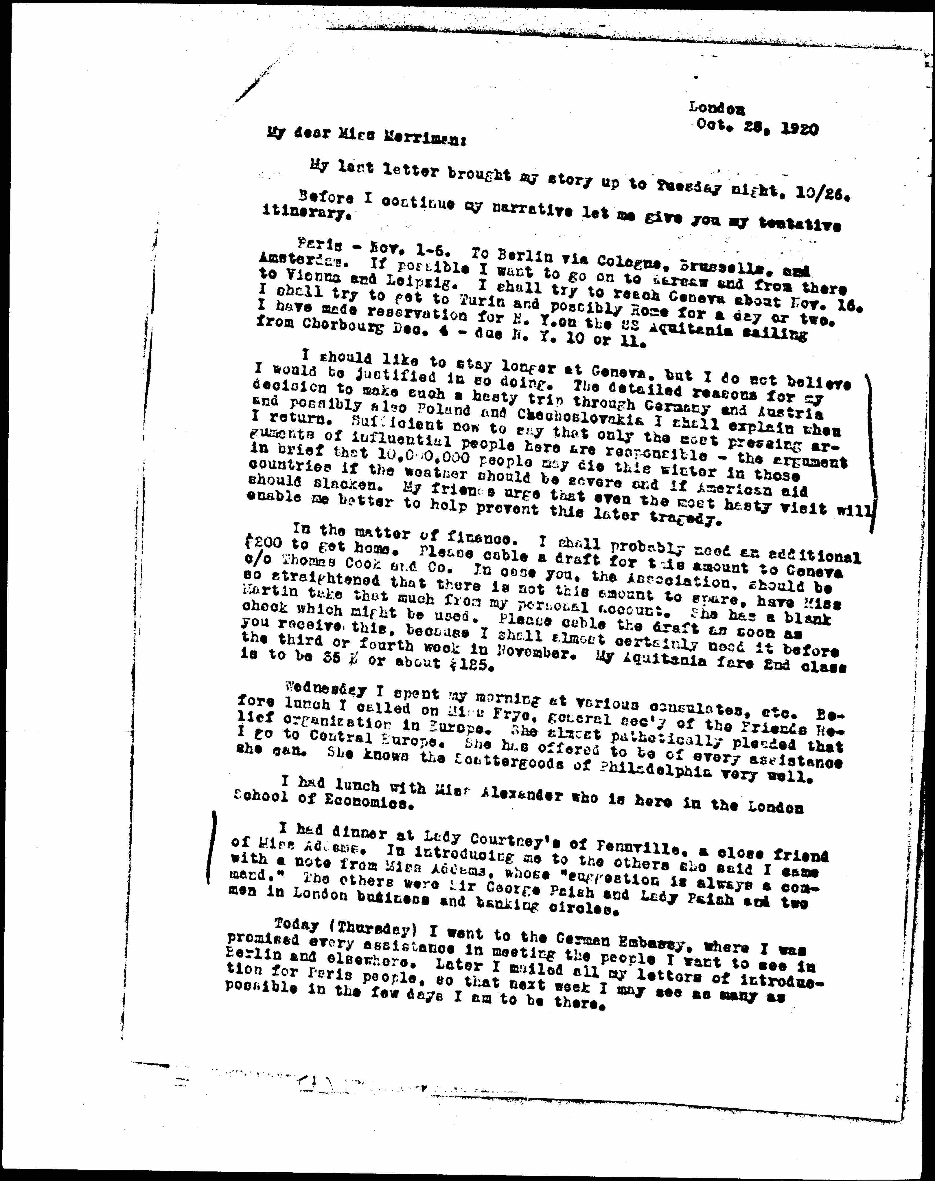 Wednesday I spent my morning at various consulates, etc. Before lunch I called on Miss [Fry], general sec'y of the Friends Relief organization in Europe. She almost pathetically pleaded that I go to Central Europe. She has offered to be of every assistance she can. She knows the Scattergoods of Philadelphia very well.