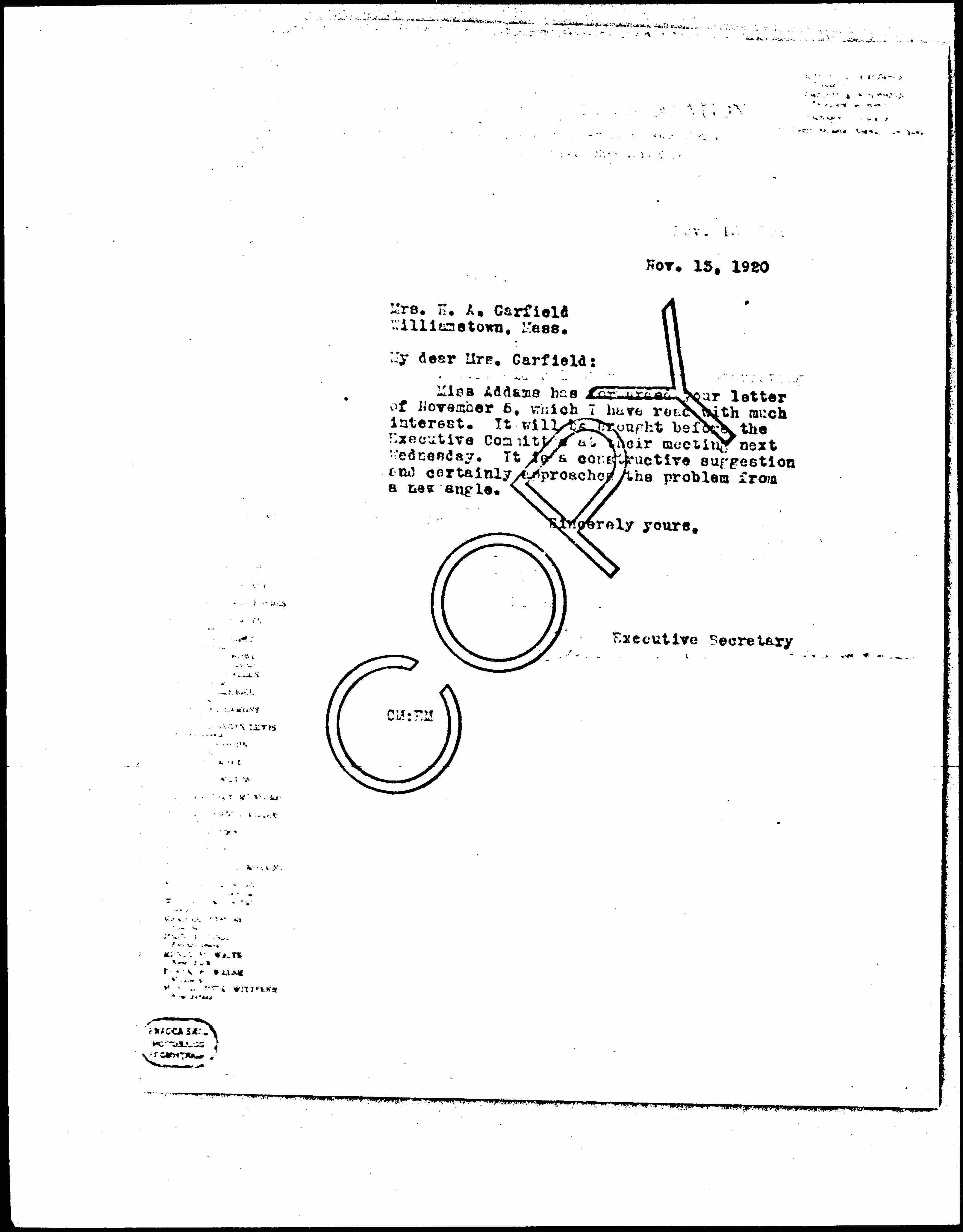Miss Addams has forwarded your letter of November 5, which I have read with much interest. It will be brought before the Executive Committee at their meeting next Wednesday. It is a constructive suggestion and certainly approaches the problem from a new angle.
