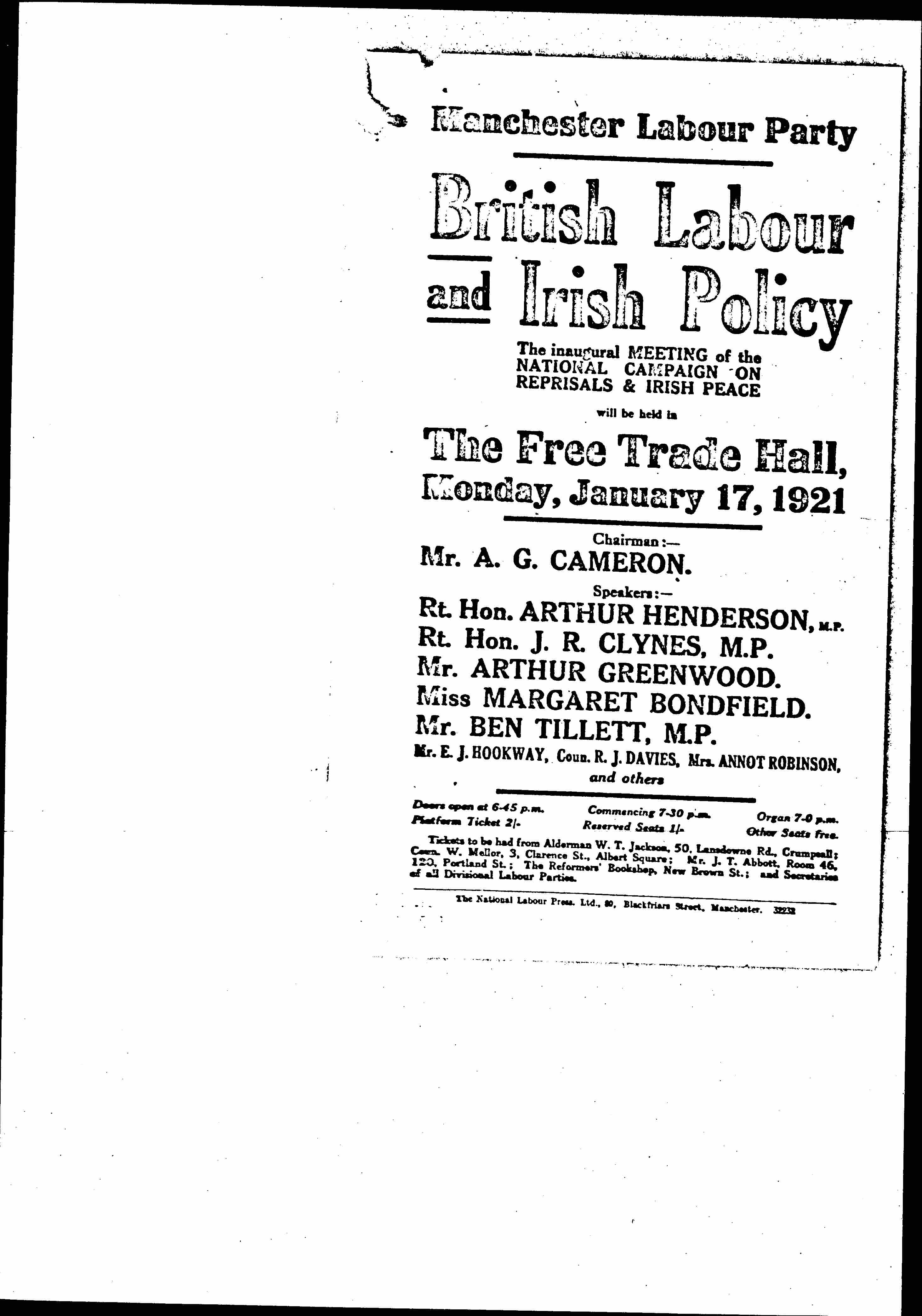 Tickets to be had from Alderman W. T. Jackson, 50, Lansdowne Rd. Crumpeall; Coun. W. Mellor, 3, Clarence St., Albert Square; Mr. J. T. Abbott, Room 46, 120, Portland St.; The Reformers' Bookshop, New Brown St.; and Secretaries of all Divisional Labour Parties.