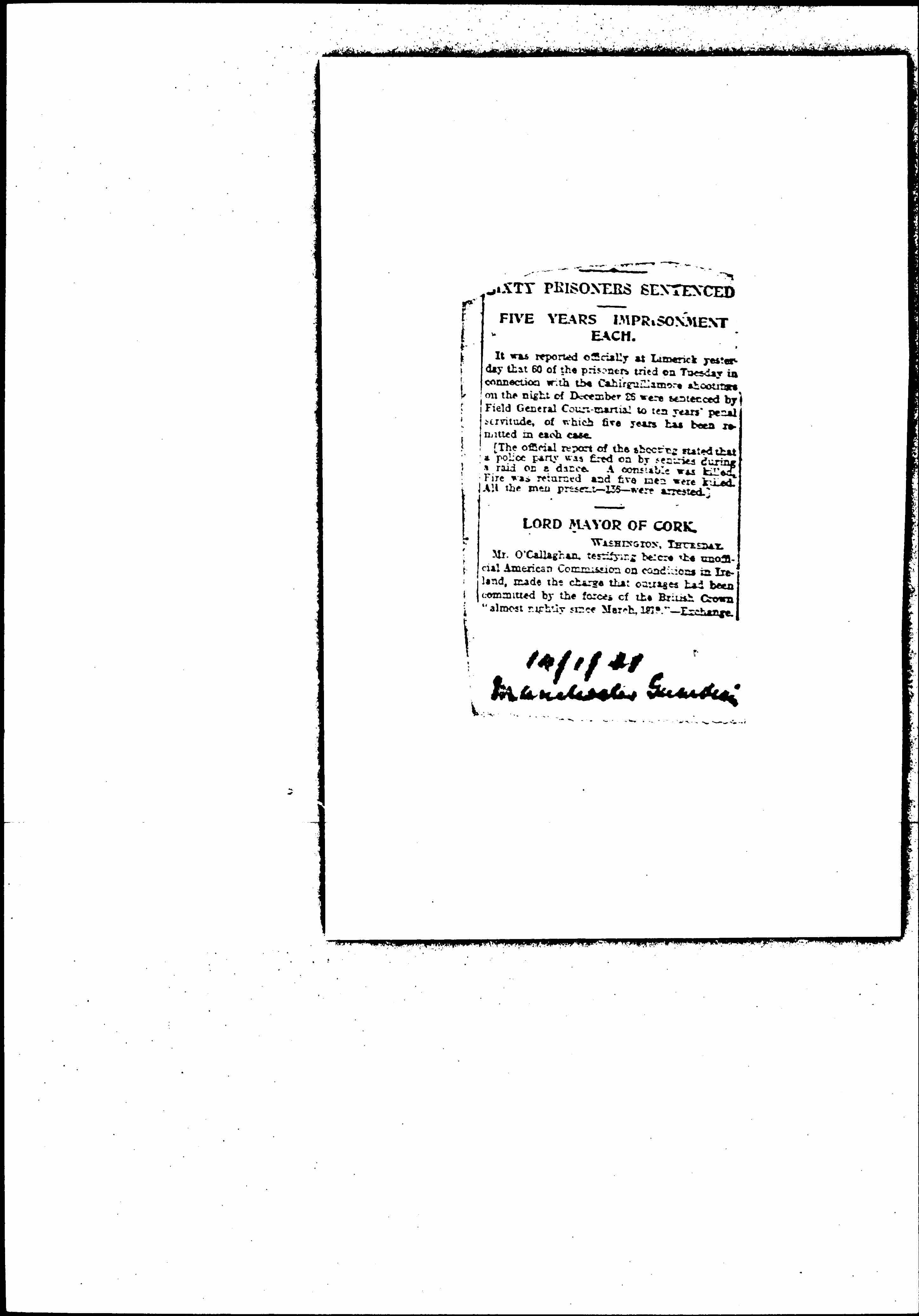 It was reported officially at Limerick yesterday that 60 of the prisoners tried on Tuesday in connection with the Cahirguillamore shootings on the night of December 26 were sentenced by Field General Court-martial to ten years' penal servitude, of which five years has been remitted in each case.