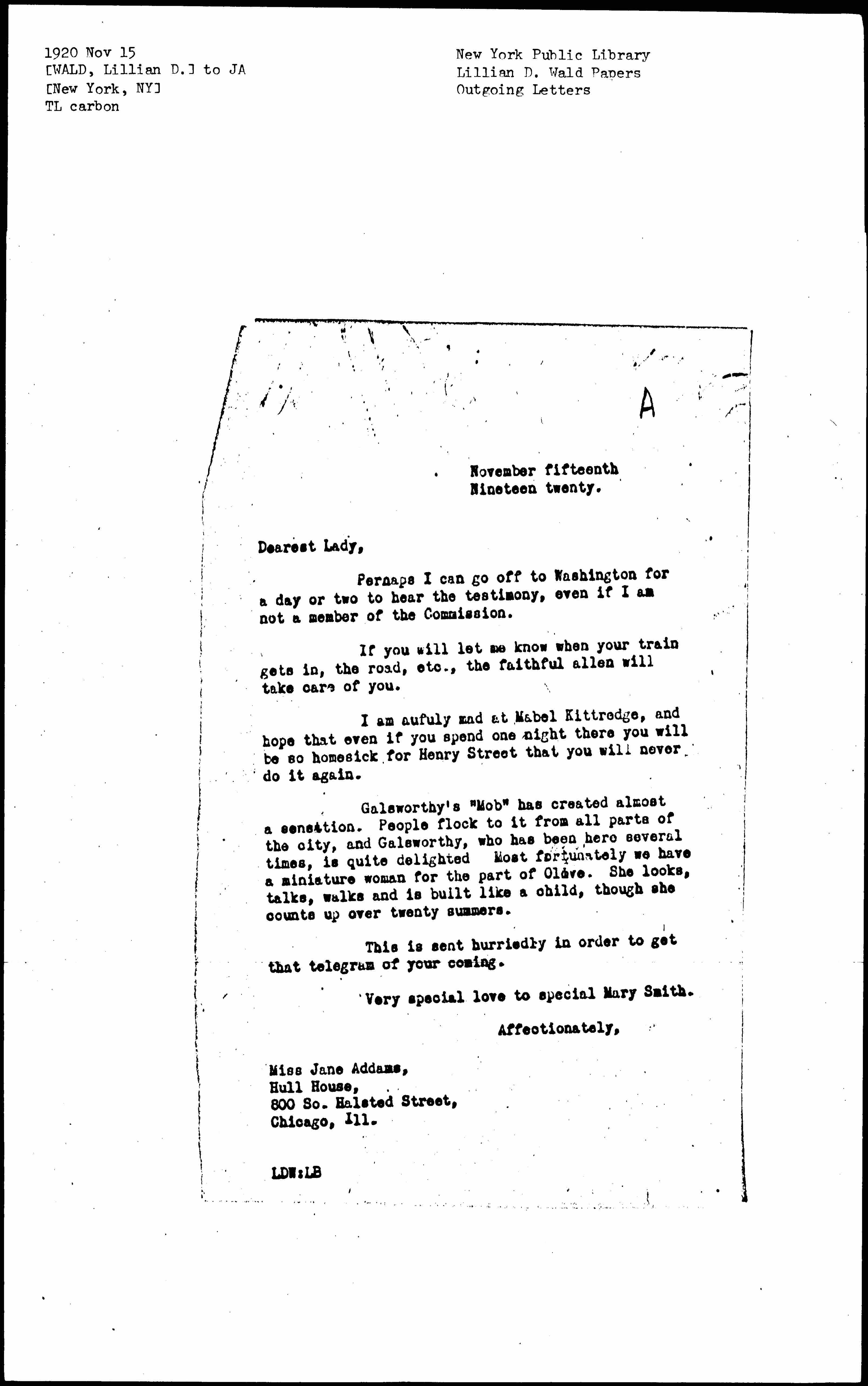 Galsworthy's "Mob" has created almost a sensation. People flock to it from all parts of the city, and Galsworthy, who has been here several times, is quite delighted. Most fortunately we have a miniature woman for the part of Olive. She looks, talks, walks and is built like a child, though she counts up over twenty summers.