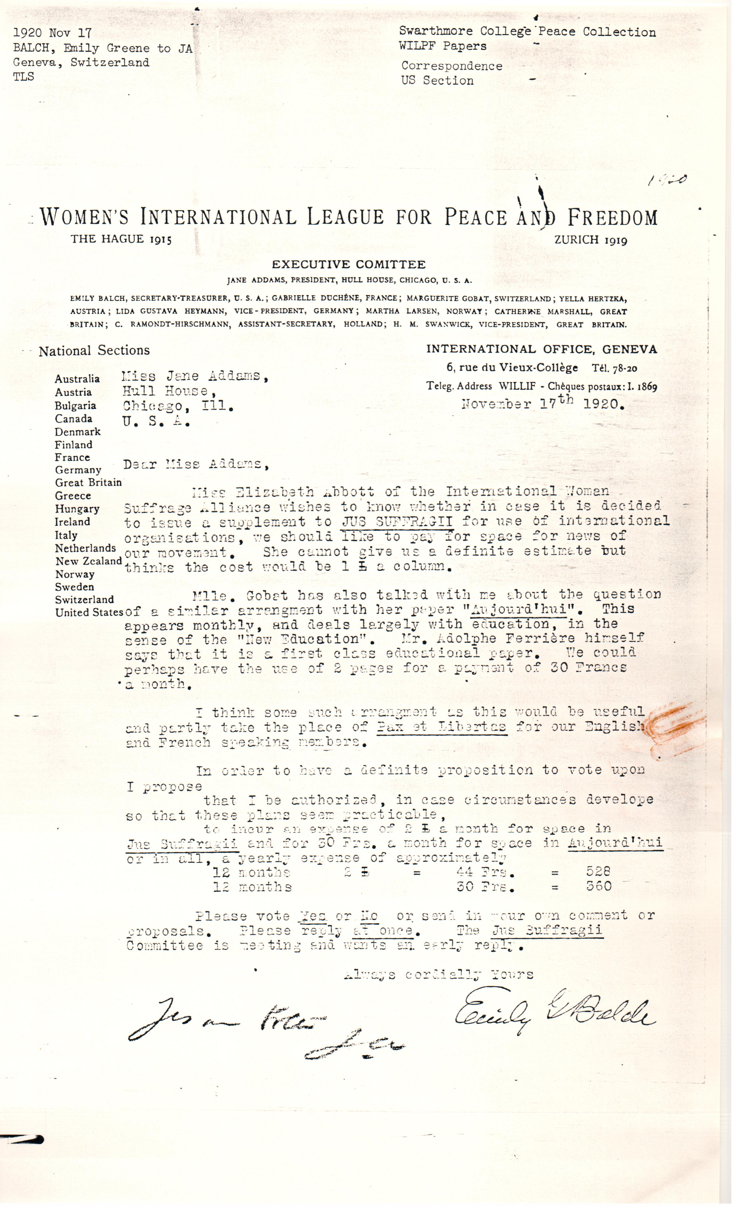 Miss Elizabeth Abbott of the International Woman Suffrage Alliance wishes to know whether in case it is decided to issue a supplement to JUS SUFFRAGII for use of international [organizations], we should like to pay for space for news of our movement. She cannot give us a definite estimate but thinks the cost would be about 1 [₤] a column.