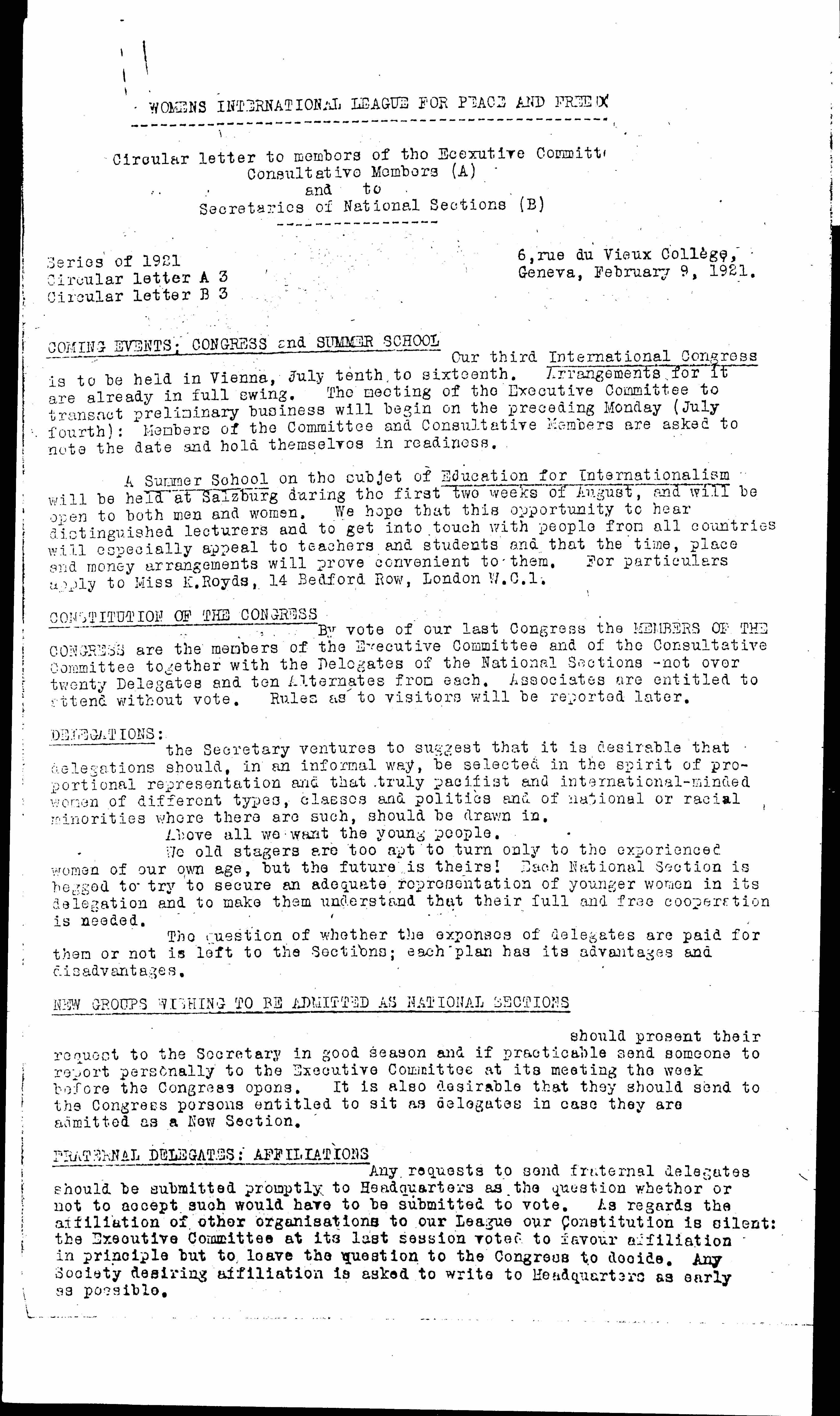The Secretary ventures to suggest that it is desirable that delegations should, in an informal way, be selected in the spirit of proportional representation and that truly pacifist and international-minded women of different types, classes and politics and of national or racial minorities where there are such, should be drawn in.