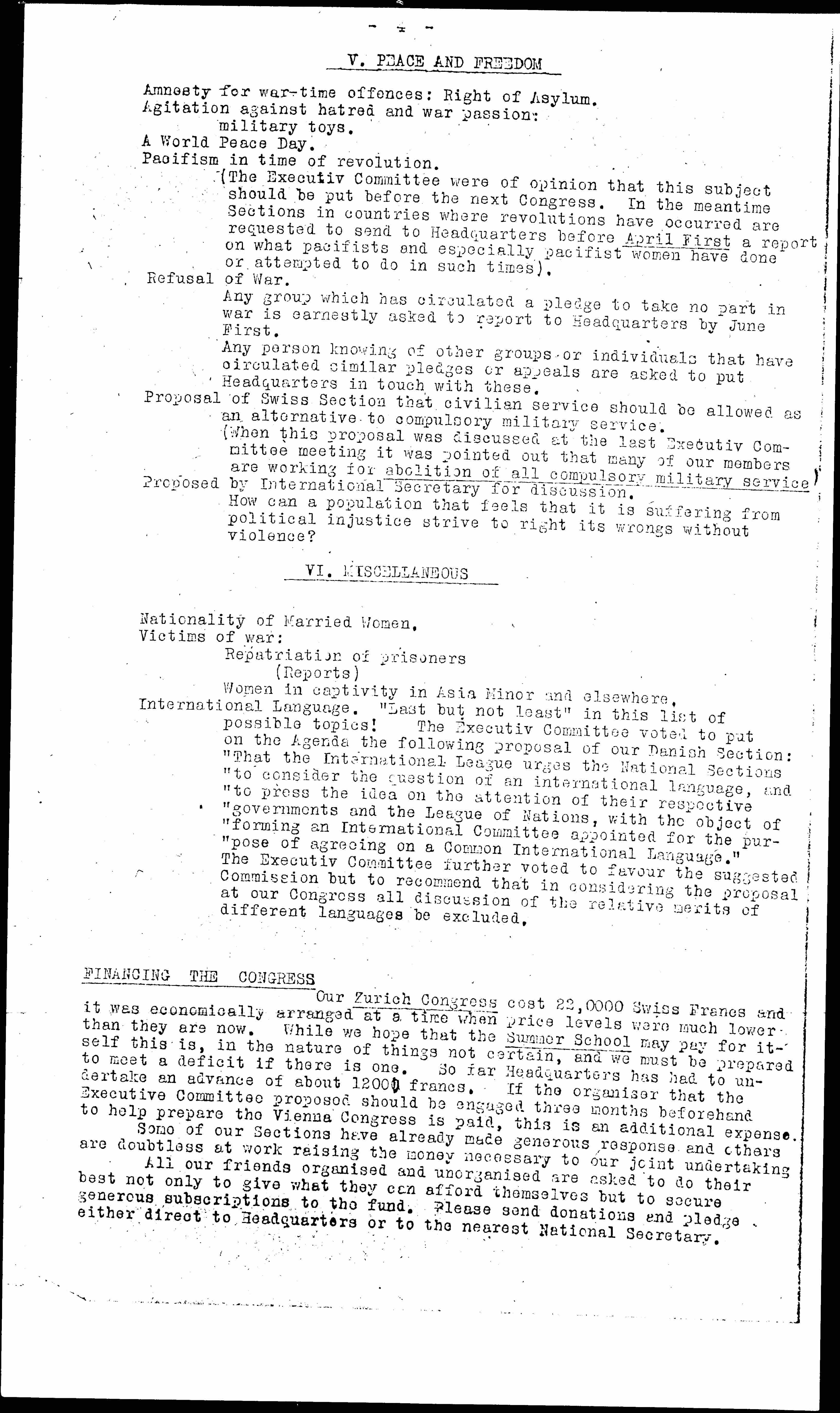 Our Zurich Congress cost 22,000 Swiss Francs and it was economically arranged at a time when price levels were much lower than they are now. While we hope that the Summer School may pay for itself this is, in the nature of things not certain, and we must be prepared to meet a deficit if there is one. So far Headquarters has had to undertake an advance of about [12000] francs. If the [organizer] that the Executive Committee proposed should be engaged three months beforehand to help prepare the Vienna Congress is paid, this is an additional expense.