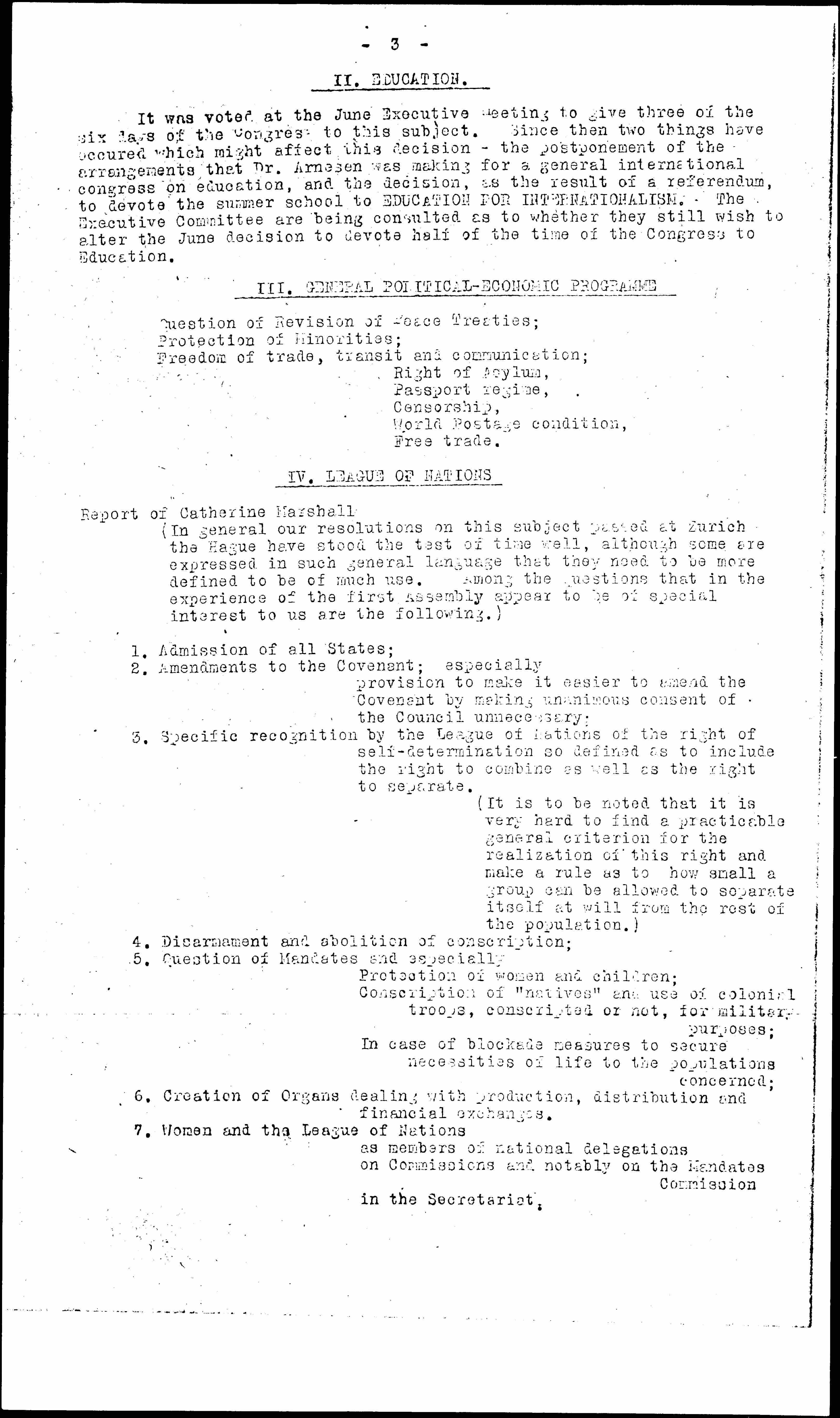 It was voted at the June Executive Meeting to give three of the six days of the Congress to this subject. Since then two things have occurred which might affect this decision -- the postponement of the arrangements that Dr. Arnesen was making for a general international congress on education, and the decision, as the result of a referendum, to devote the summer school to EDUCATION FOR INTERNATIONALISM. The Executive Committee are being consulted as to whether they still wish to alter the June decision to devote half of the time of the Congress to Education.