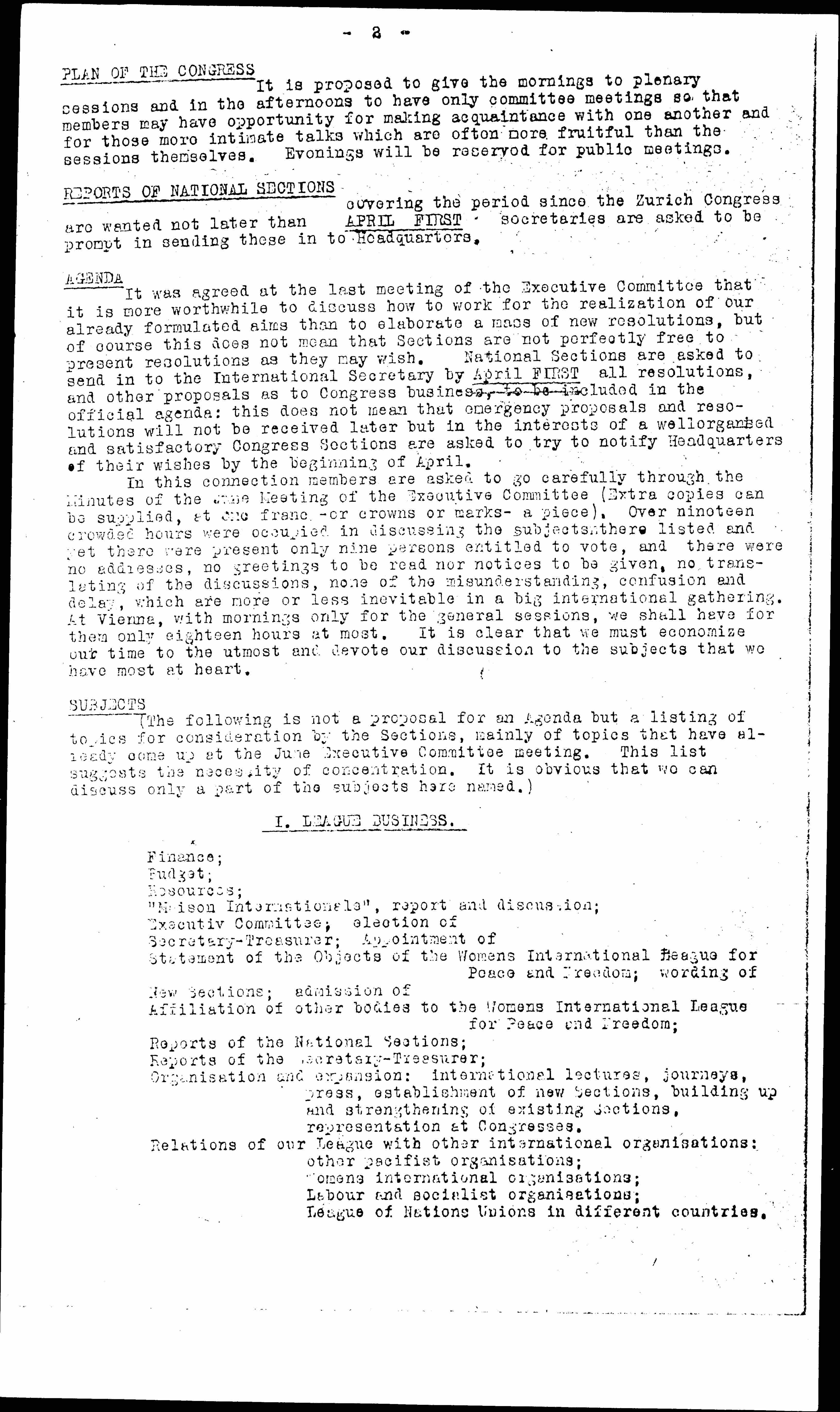 It was agreed at the last meeting of the Executive Committee that it is more worthwhile to discuss how to work for the realization of our already formulated aims than to elaborate a mass of new resolutions, but of course this does not mean that Sections are not perfectly free to present resolutions as they may wish. National Sections are asked to send in to the International Secretary by April FIRST all resolutions, and other proposals as to Congress business, to be included in the official agenda: this does not mean that emergency proposals and resolutions will not be received later but in the interests of a [well-organized] and satisfactory Congress Sections are asked to try to notify Headquarters of their wishes by the beginning of April.