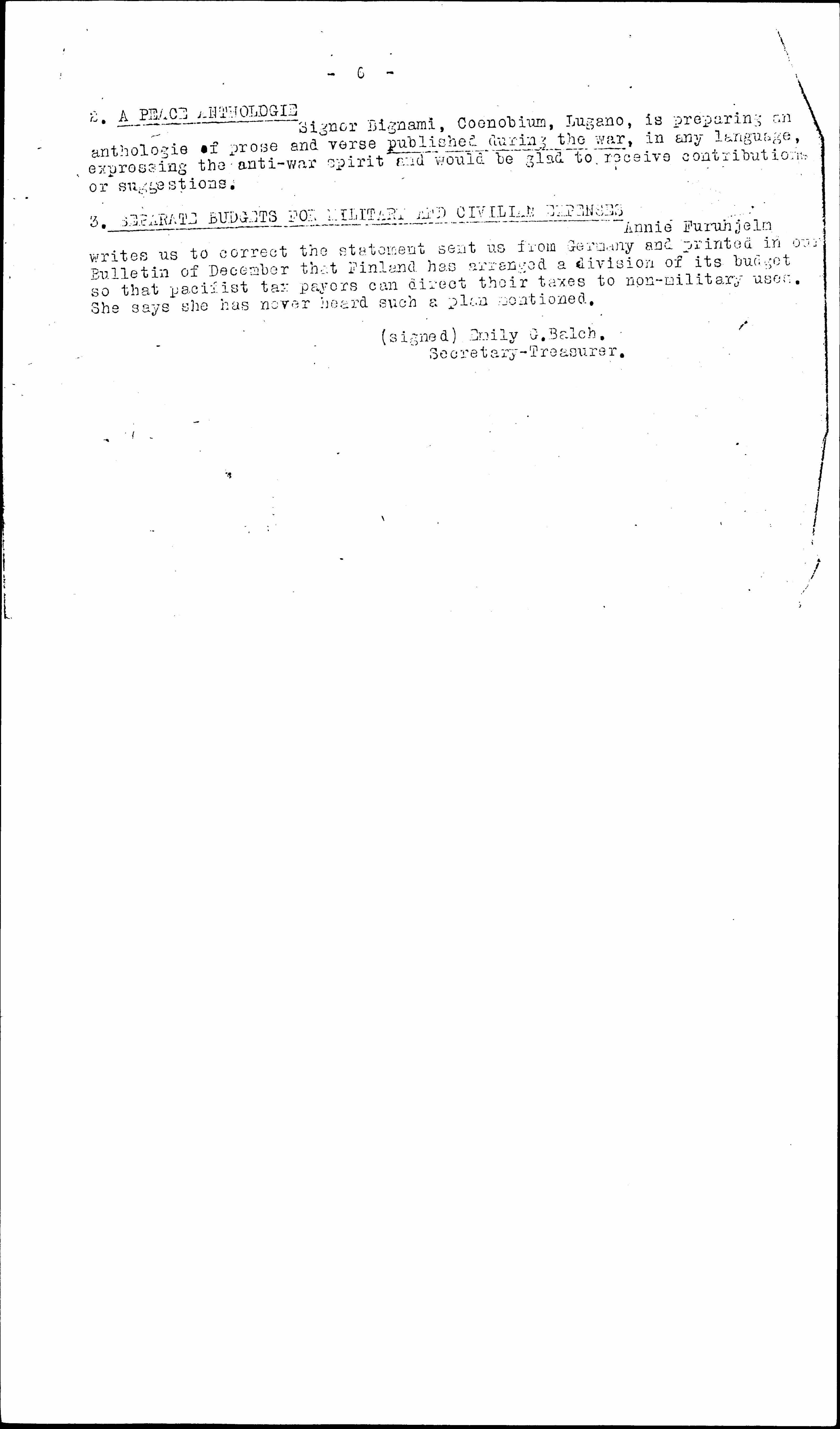 Annie Furuhjelm writes to us to correct the statement sent us from Germany and printed in our Bulletin of December that Finland has arranged a division of its budget so that pacifist tax payers can direct their taxes to non-military uses. She says she has never heard such a plan mentioned.