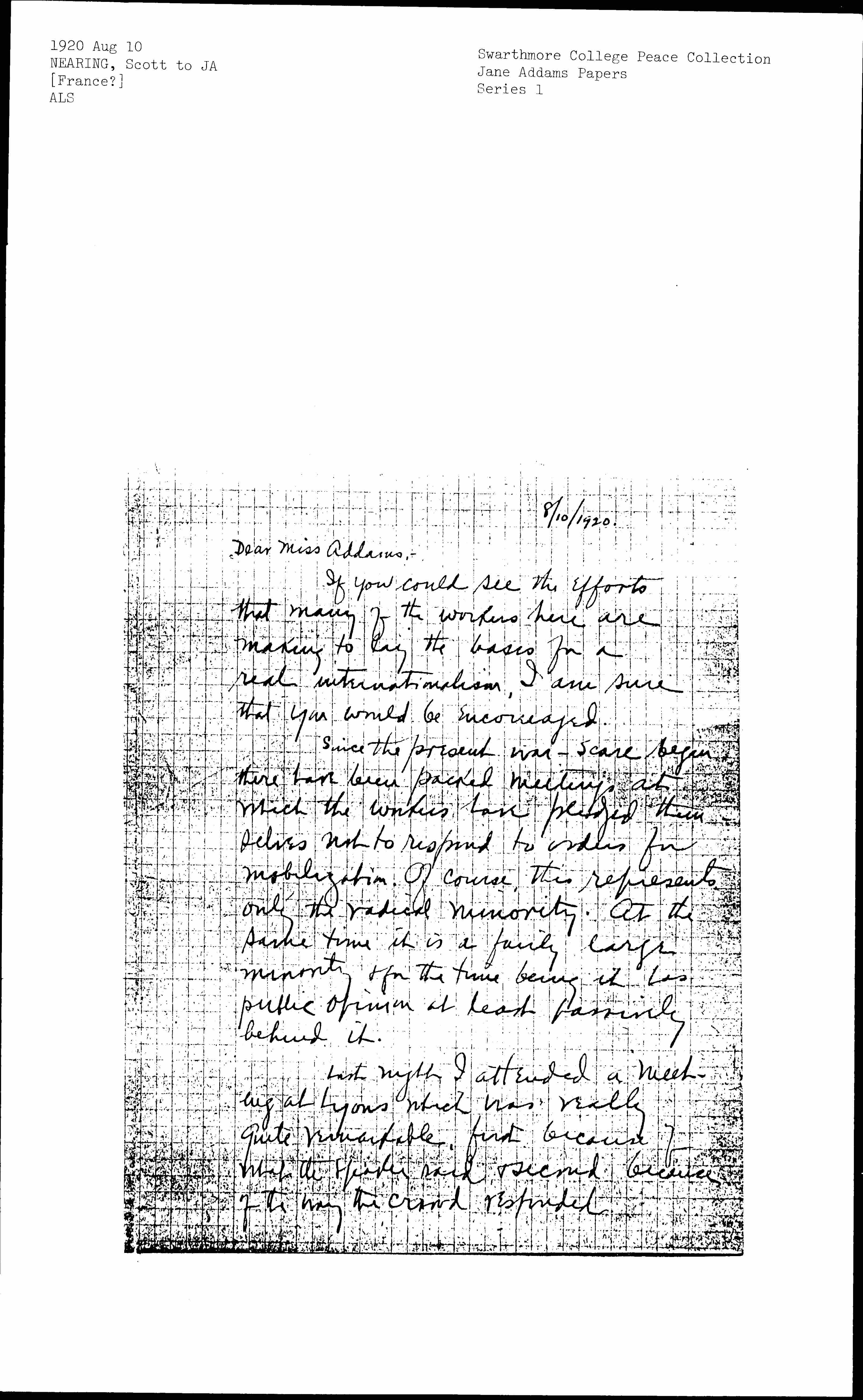 Last night I attended a meeting at Lyons which was really quite remarkable, first because of what the speaker said & second because of the way the crowd responded. [page 2] The other day at Geneva the International Congress of Miners passed a resolution favoring a general strike in the case of war. The motion was passed amidst the greatest enthusiasm, and was wildly acclaimed.