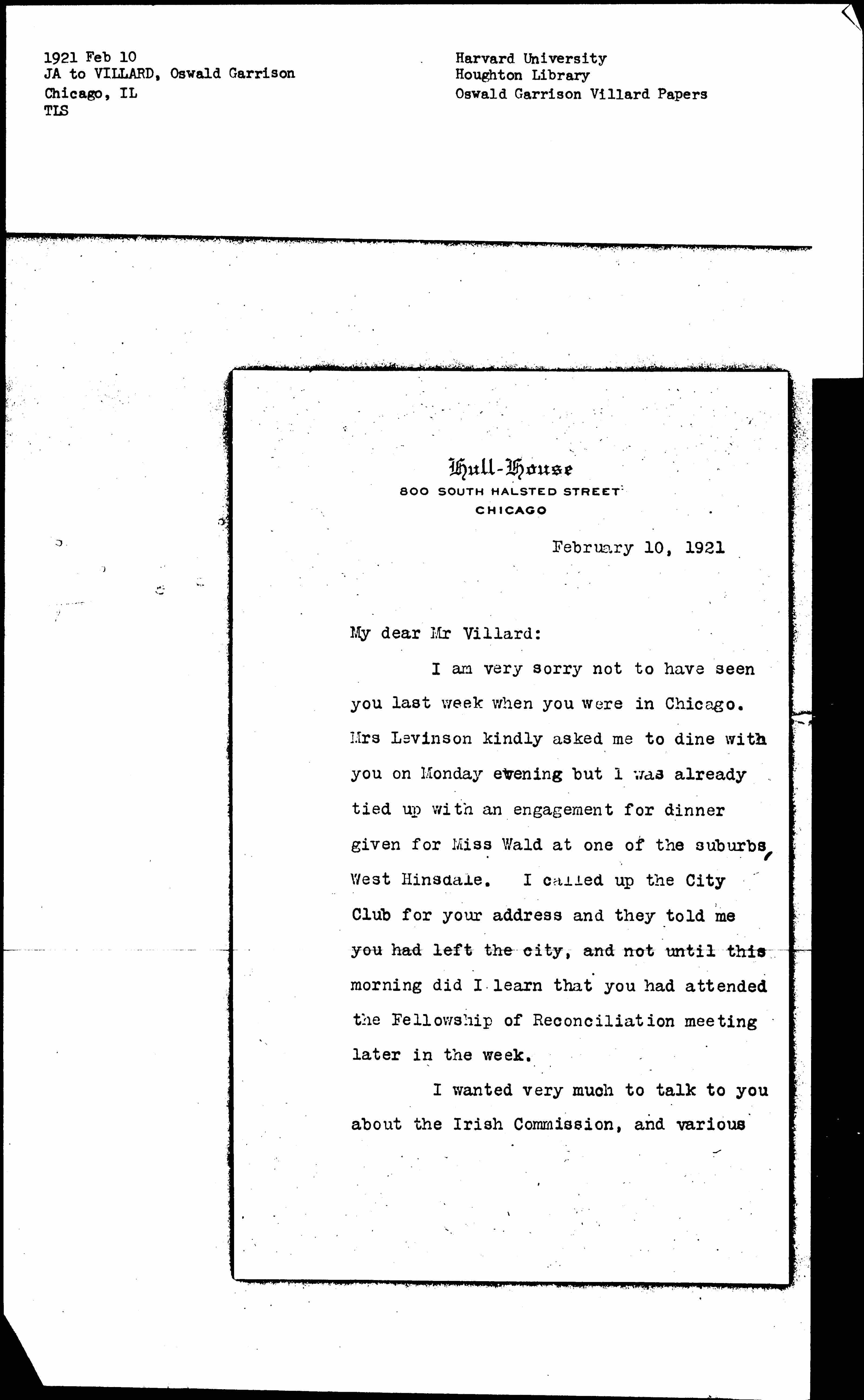 I am very sorry not to have seen you last week when you were in Chicago. Mrs Levinson kindly asked me to dine with you on Monday evening but I was already tied up with an engagement for dinner given for Miss Wald at one of the suburbs, West Hinsdale. I called up the City Club for your address and they told me you had left the city, and not until this morning did I learn that you had attended the Fellowship of Reconciliation meeting later in the week.
