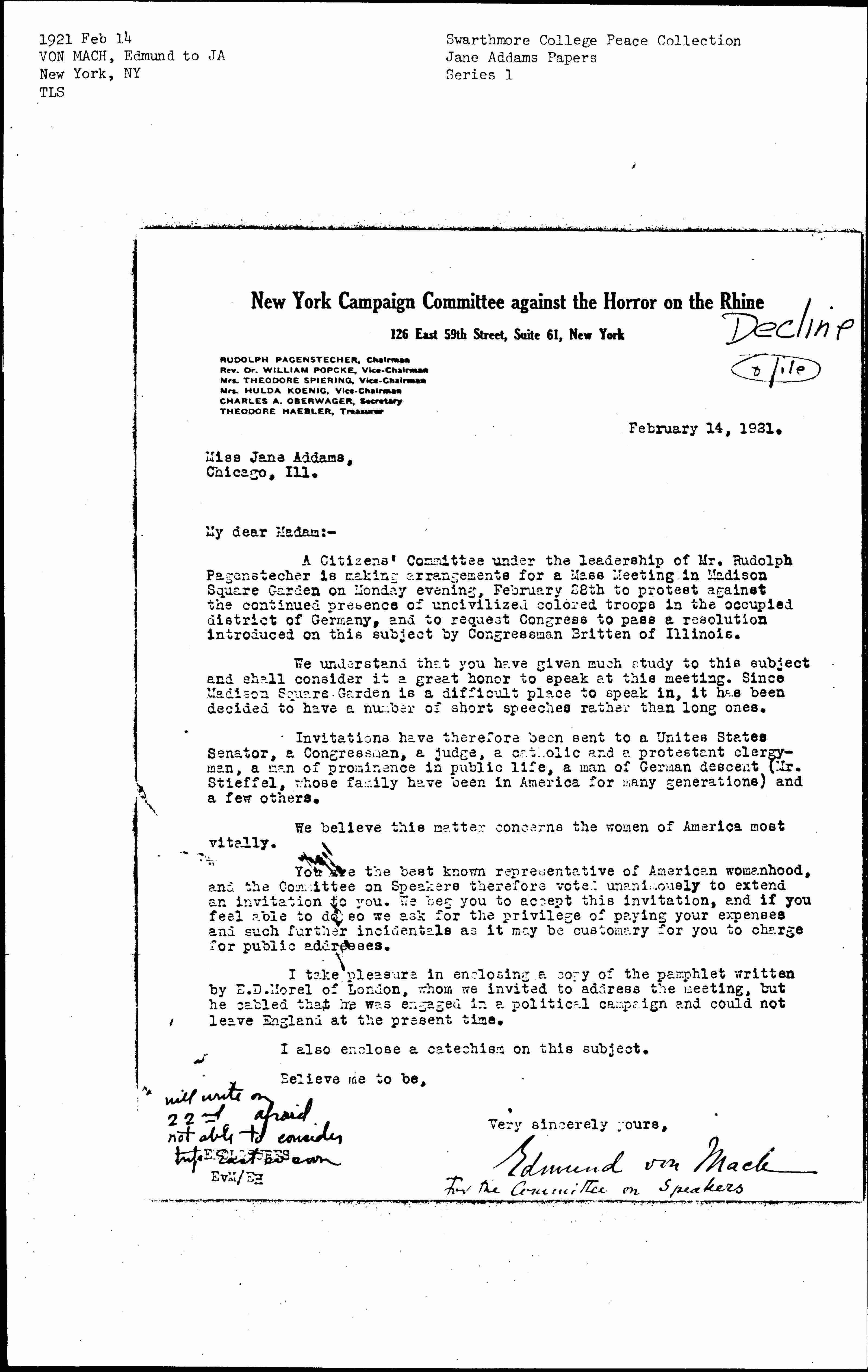 I take pleasure in enclosing a copy of the pamphlet written by E. D. Morel of London, whom we invited to address the meeting, but he cabled that he was engaged in a political campaign and could not leave England at the present time.