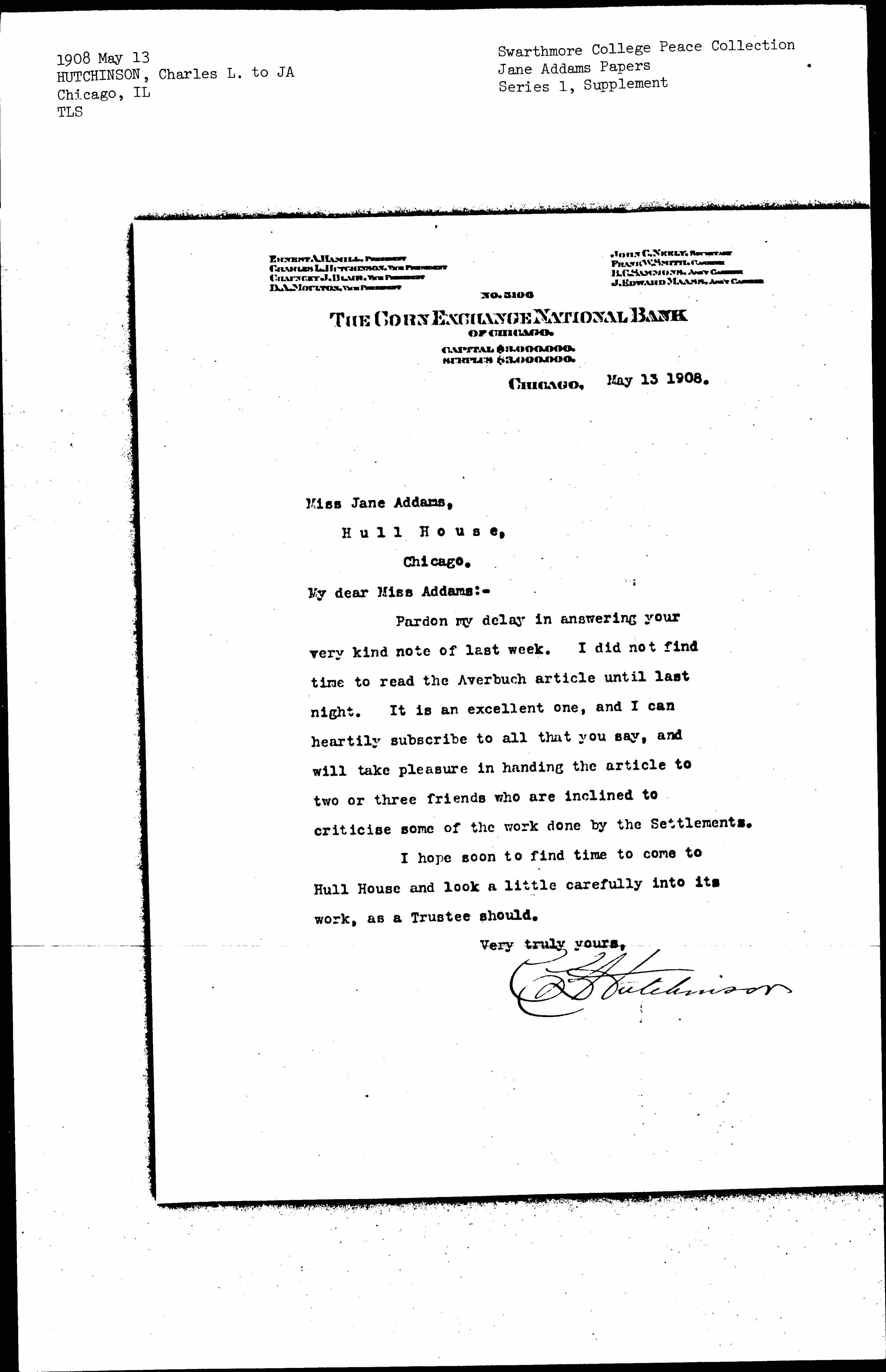 I hope soon to find time to come to Hull House and look a little carefully into its work, as a Trustee should.