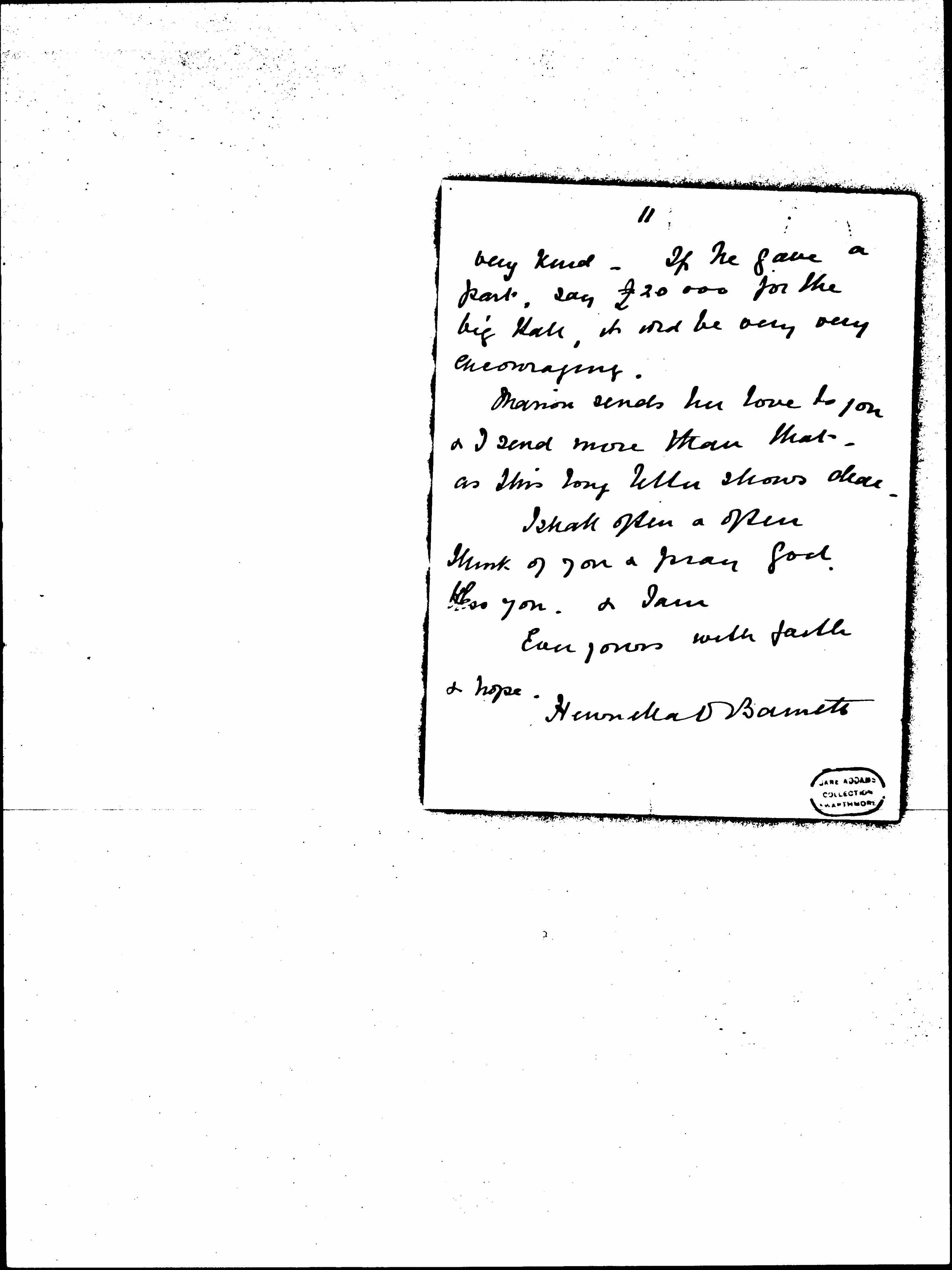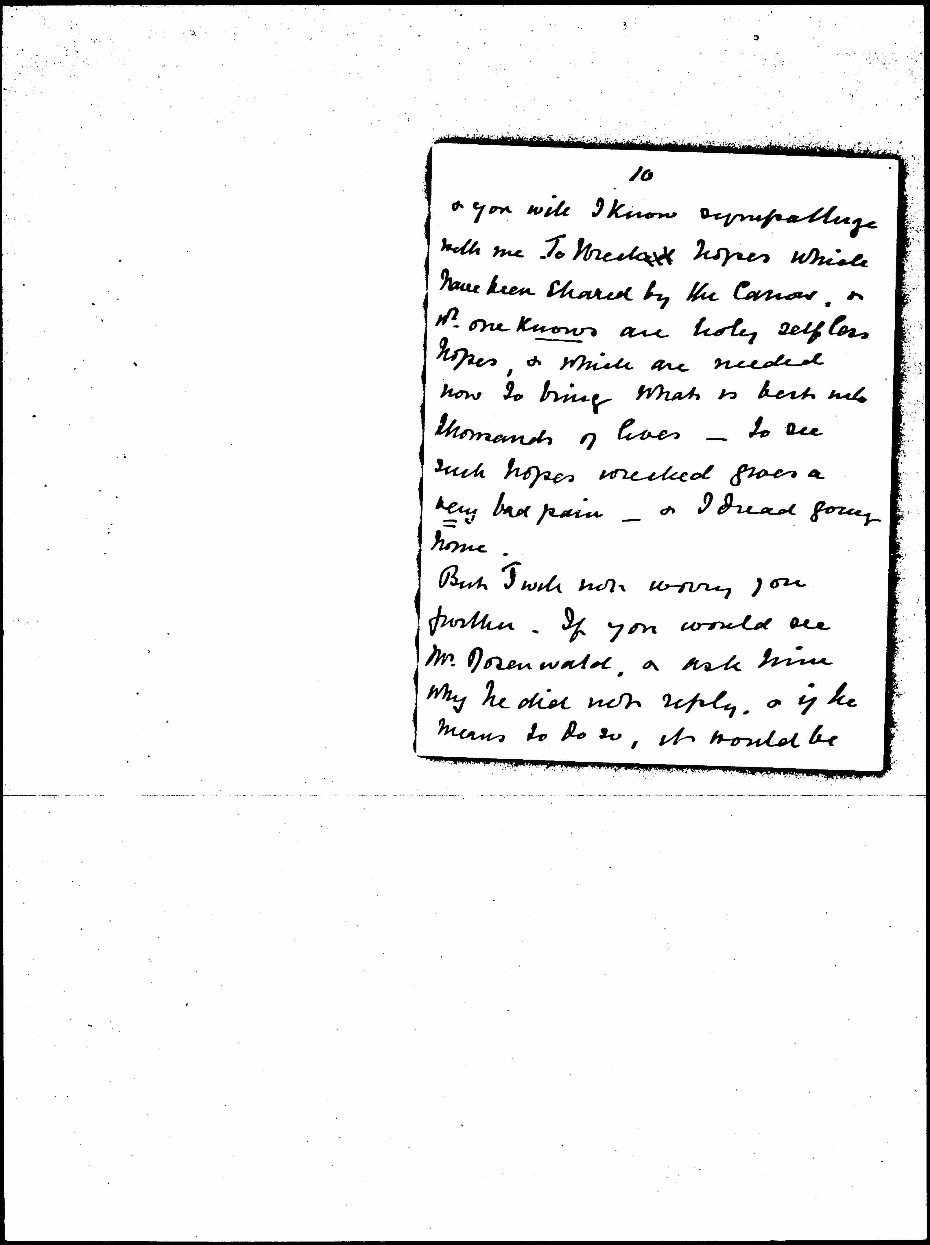 What can be done? You will recall that I wrote fully to Mr. Rosenwald, & put the whole scheme before him, & sent the letter to that wise Mr. Graves, in case it got lost among the 80,000 other letters. He replied most kindly, & said he wld bring it before Mr Rosenwald, but I have had no further reply. Dear Lady you can imagine how miserable I feel [page 10] & you will I know sympathize with me. To [wreck] hopes which have been shared by the Canon, & wh one knows are holy selfless hopes, & which are needed now to bring what is best into thousands of lives -- to see such hopes wrecked gives a very bad pain -- & I dread going home.