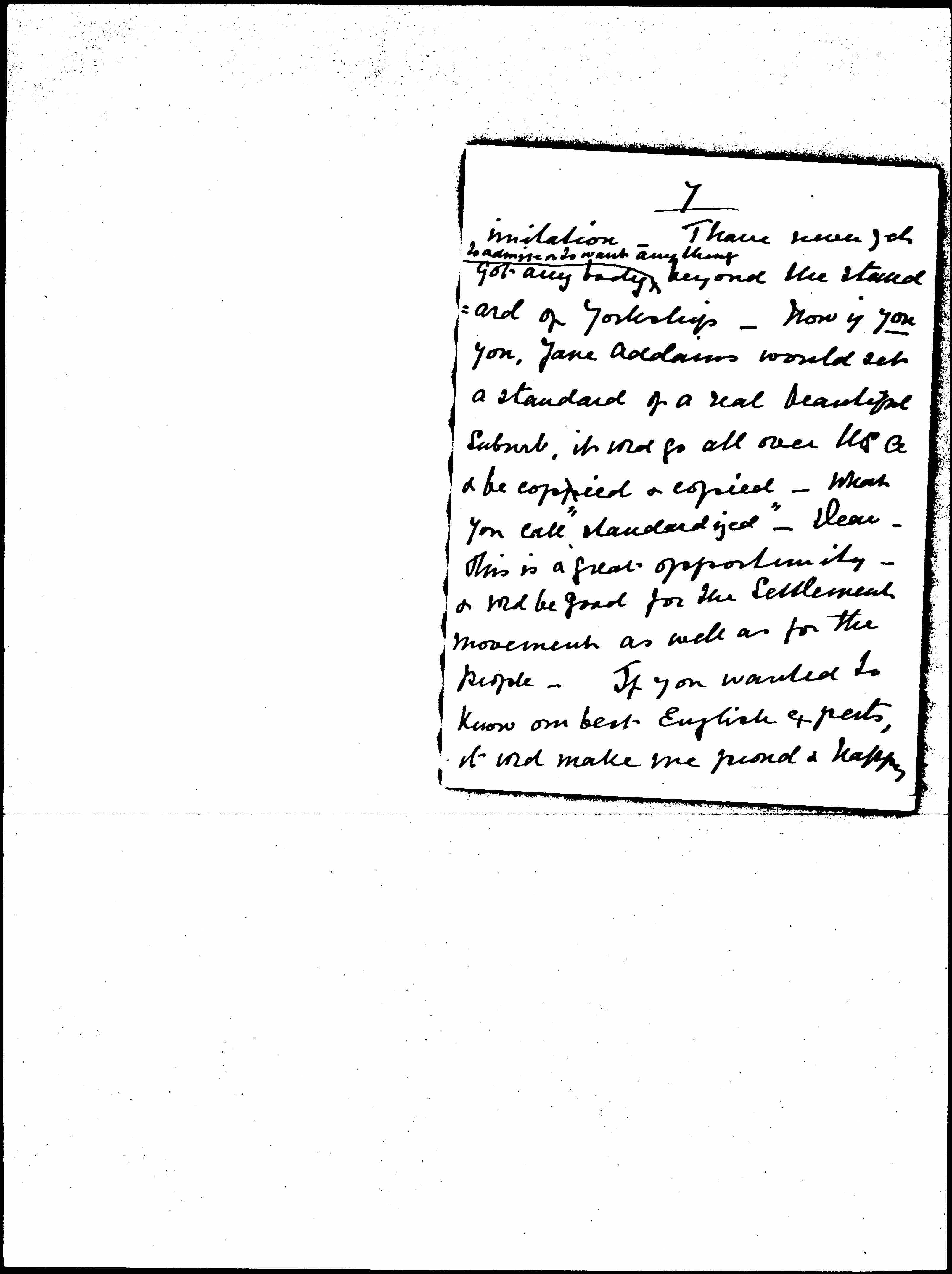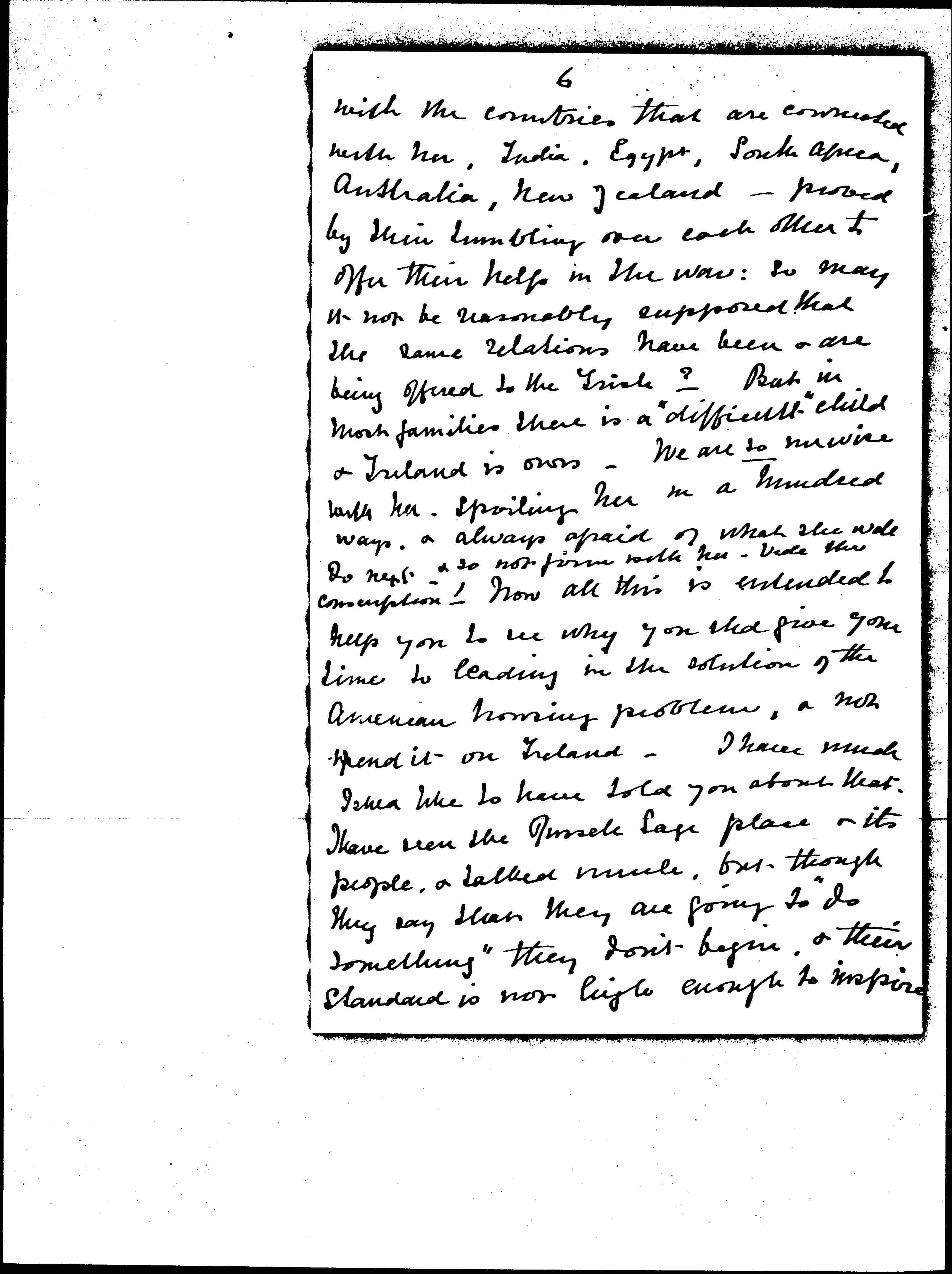 Also can we not all remember that England does enter into right relations [page 6] with the countries that are connected with her, India, Egypt, South Africa, Australia, New Zealand -- proved by their tumbling over each other to offer their help in the war: so may it not be reasonably supposed that the same relations have been & are being offered to the Irish? But in most families there is a "difficult" child & Ireland is ours. We are so unwise with her, spoiling her in a hundred ways, & always afraid of what she will do next, ↑(& so not firm with her -- vide the conscription).↓ Now all this is intended to help you to see why you shd give your time to leading in the solution of the American housing problem, & not spend it on Ireland. I have much I shd like to have told you about that. I have seen the Russell Sage place & its people, & talked much, but though they say that they are going to "do something" they don't begin & their standard is not high enough to inspire [page 7] initiation. I have never yet got any body ↑to admire or to want anything↓ beyond the standard of [Yorkship]. Now if you, you, Jane Addams would set a standard of a real beautiful suburb, it wld go all over USA & be copied & copied -- what you call "standardized" -- Dear -- This is a great opportunity -- & wld be good for the Settlement Movement as well as for the people. If you wanted to know our best English experts, it wld make me proud & happy [page 8] to help you to them.