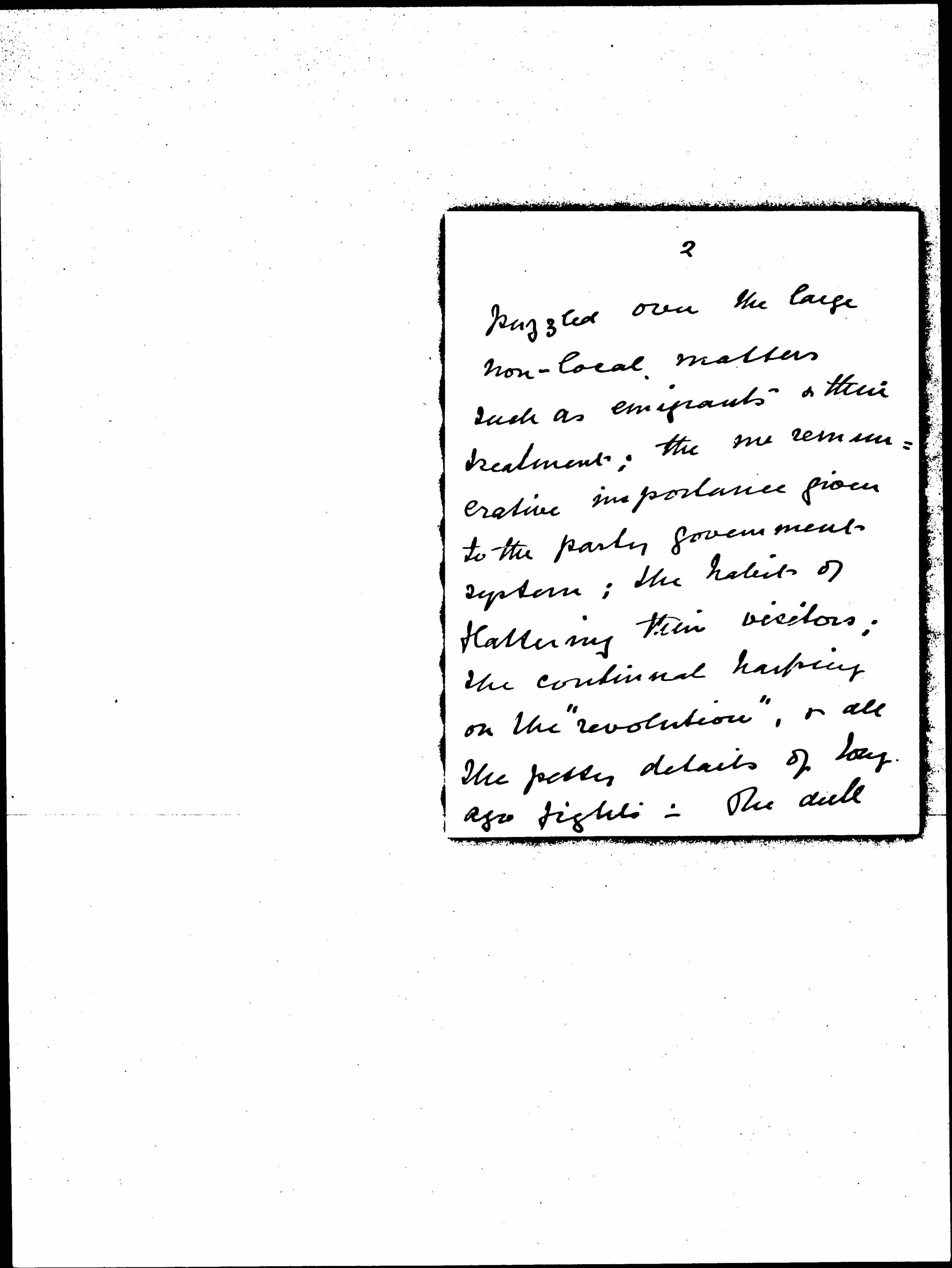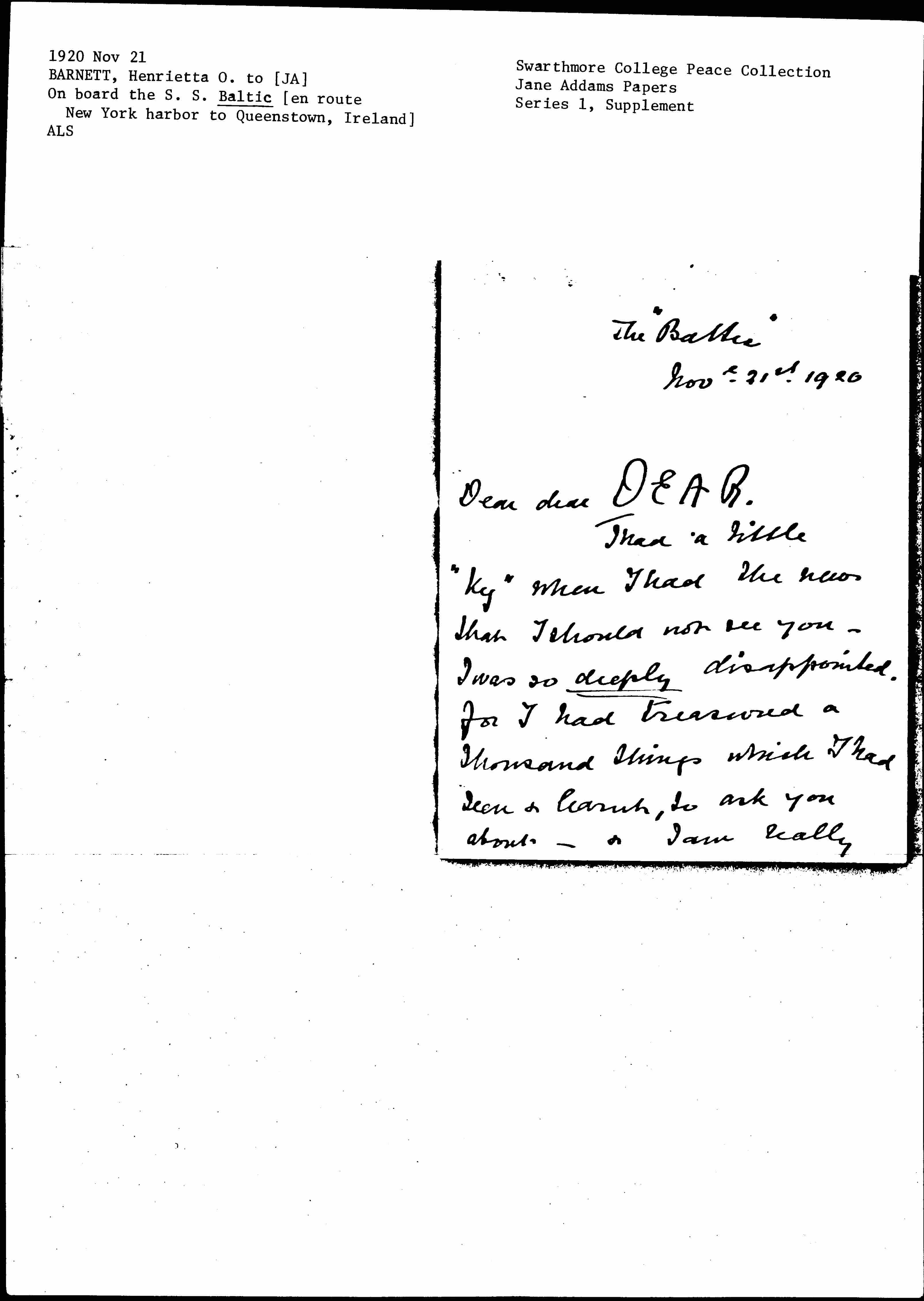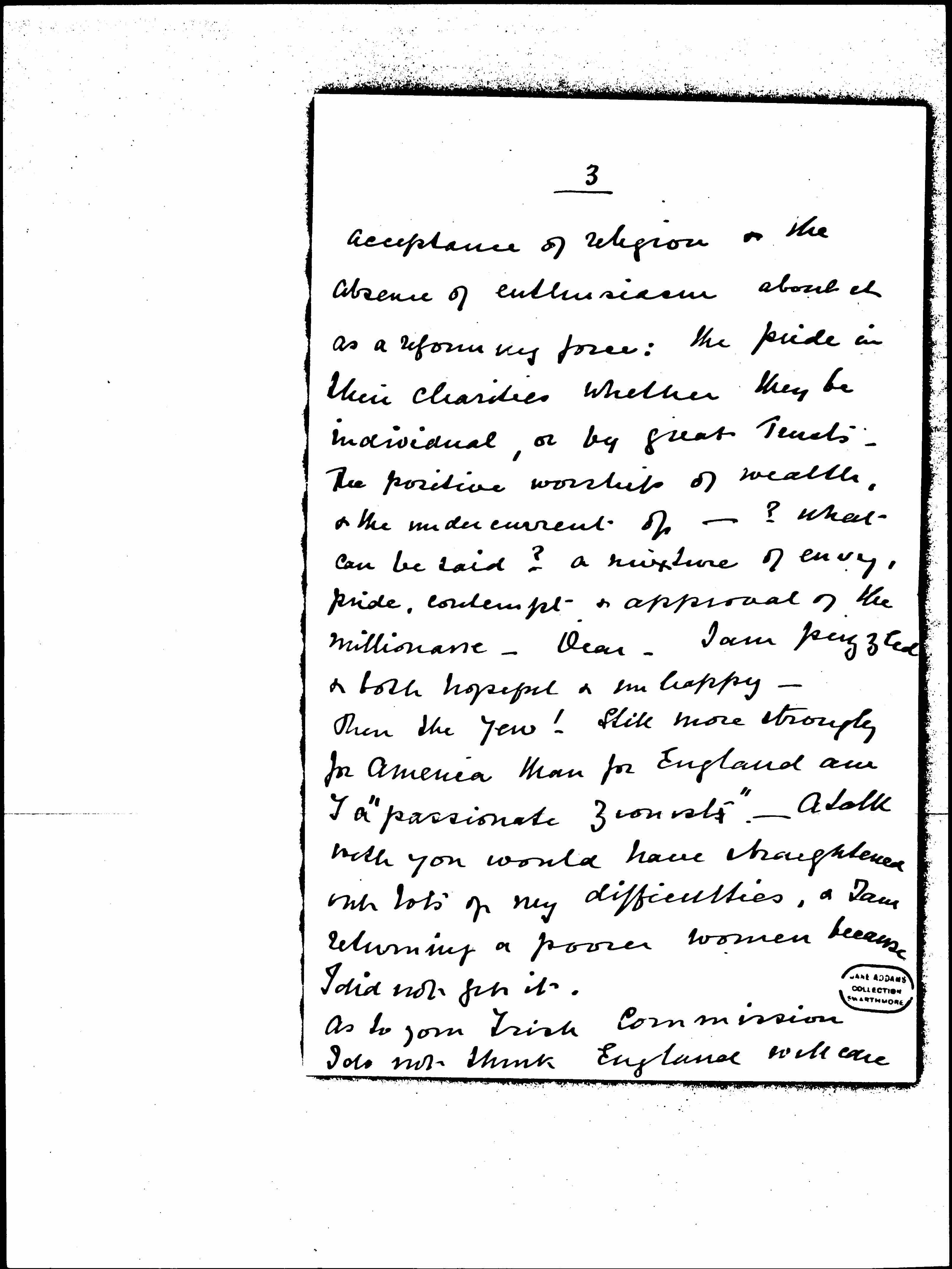 I had a little "[illegible]" when I had the news that I should not see you. I was so deeply disappointed, for I had treasured a thousand things which I had seen & heard, to ask you about -- & I am really [page 2] puzzled over the large non-local matters such as emigrants & their treatment; the one remunerative importance given to the party government system; the habit of flattering their visitors; the continual harping on the "revolution", & all the petty details of long ago fights; the dull [page 3] acceptance of religion & the absence of enthusiasm about it as a reforming force; the pride in their charities whether they be individual, or by great Trusts; the positive worship of wealth, & the undercurrent of -- ? What can be said? a mixture of envy, pride, contempt & approval of the millionaire -- Dear -- I am puzzled & both hopeful & unhappy -- then the Jew! Still more strongly for America than for England am I a "passionate Zionist." -- A talk with you would have straightened out lots of my difficulties, & I am returning a poorer woman because I did not get it.