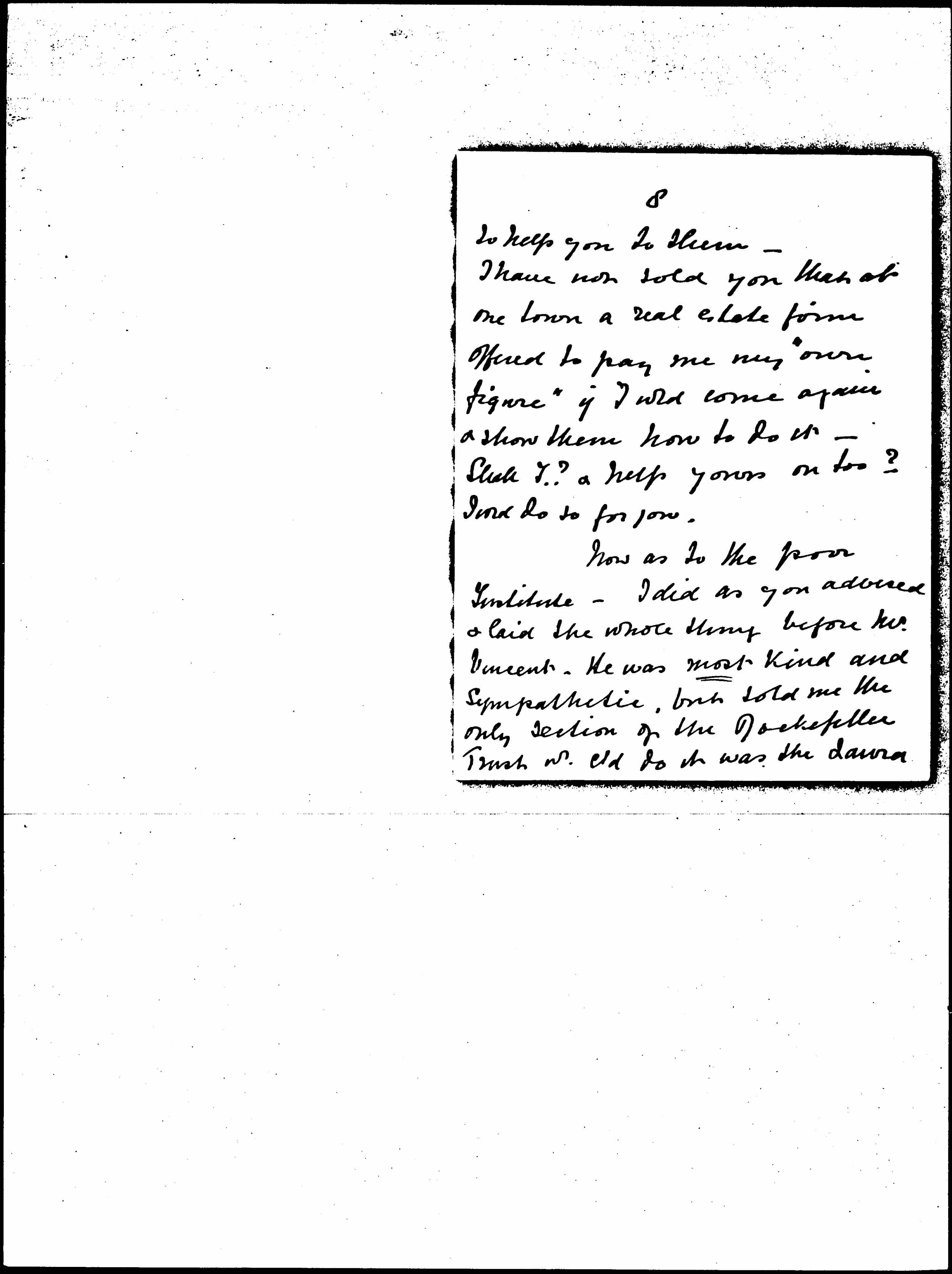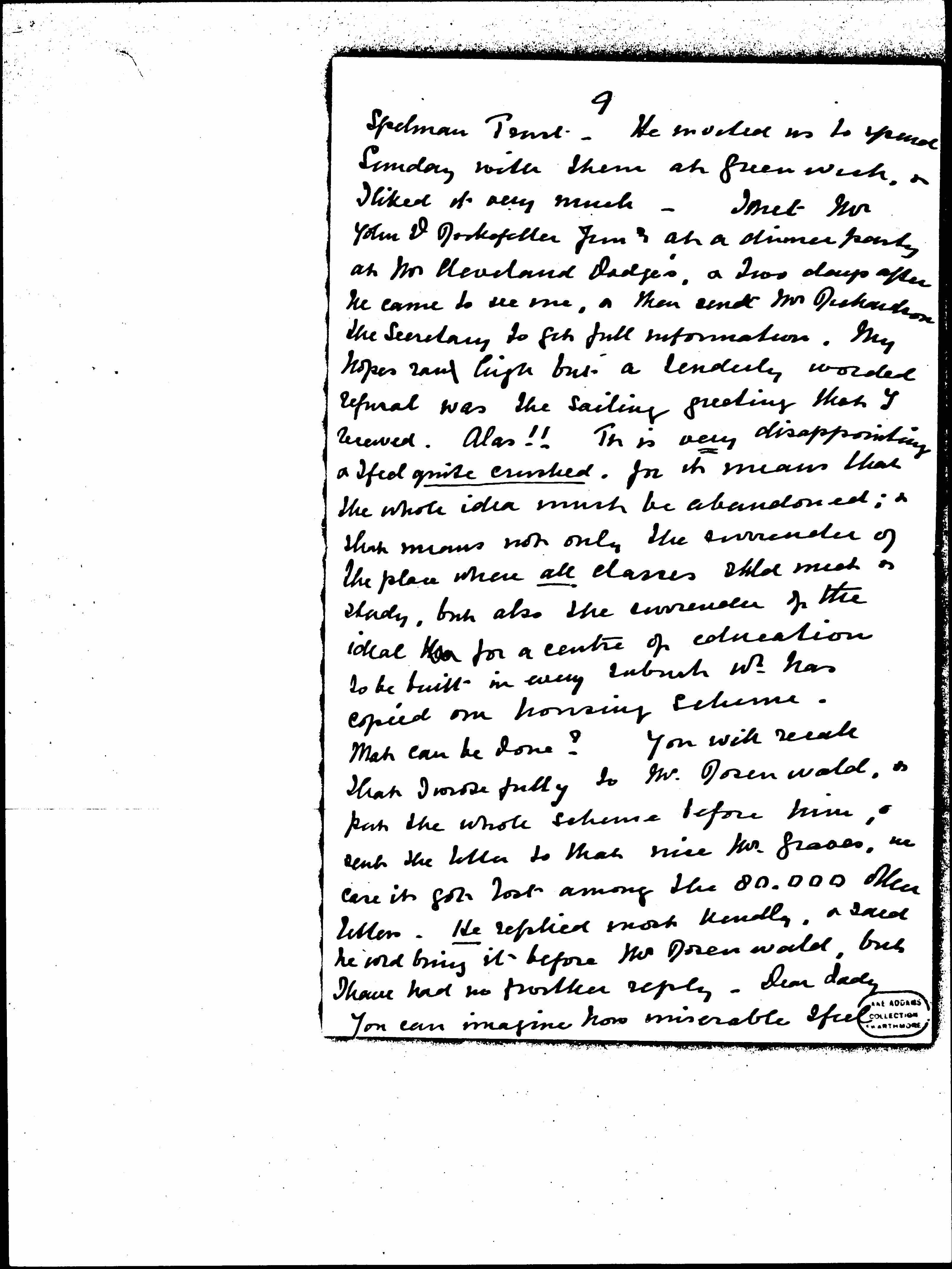 Now as to the poor Institute -- I did as you advised & laid the whole thing before Mr Vincent. He was most kind and sympathetic, but told me the only section of the Rockefeller Trust wh. cld do it was the Laura [page 9] Spelman Trust. He invited us to spend Sunday with them at Greenwich, & I liked it very much -- I met Mr John D Rockefeller Jun'r at a dinner party at Mr Cleveland Dodge's, & two days after he came to see me, & then sent Mr Richardson the Secretary to get full information. My hopes ran high but a tenderly worded refusal was the sailing greeting that I received. Alas!! It is very disappointing & I feel quite crushed, for it means that the whole idea must be abandoned; & that means not only the surrender of the place where all classes shld meet or study, but also the surrender of the ideal [illegible] for a [center] of education to be built in every suburb wh has copied our housing scheme.